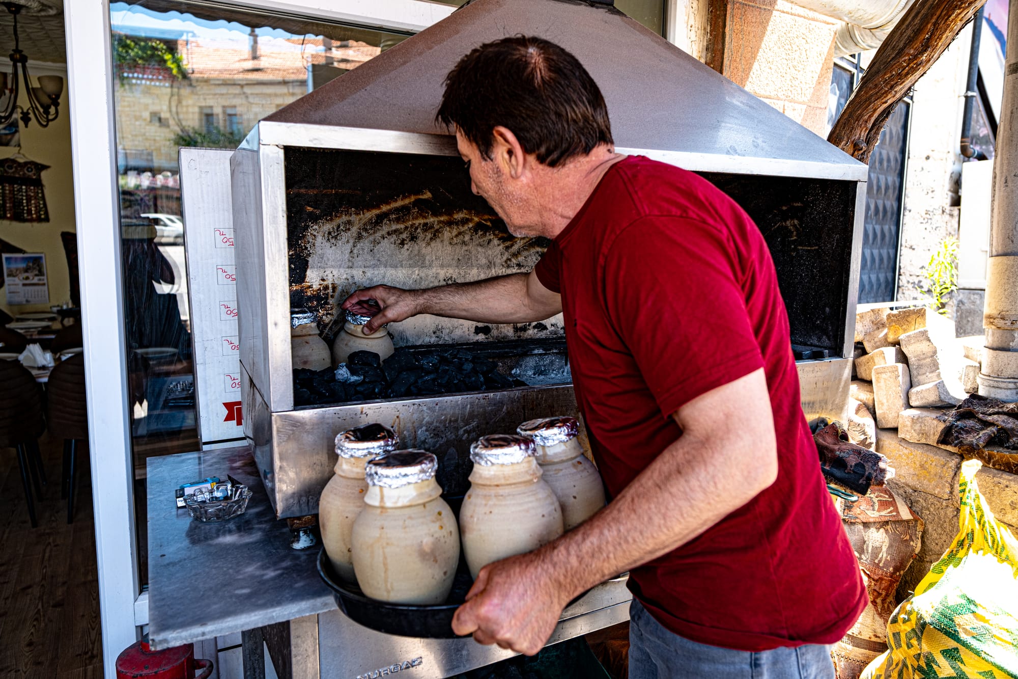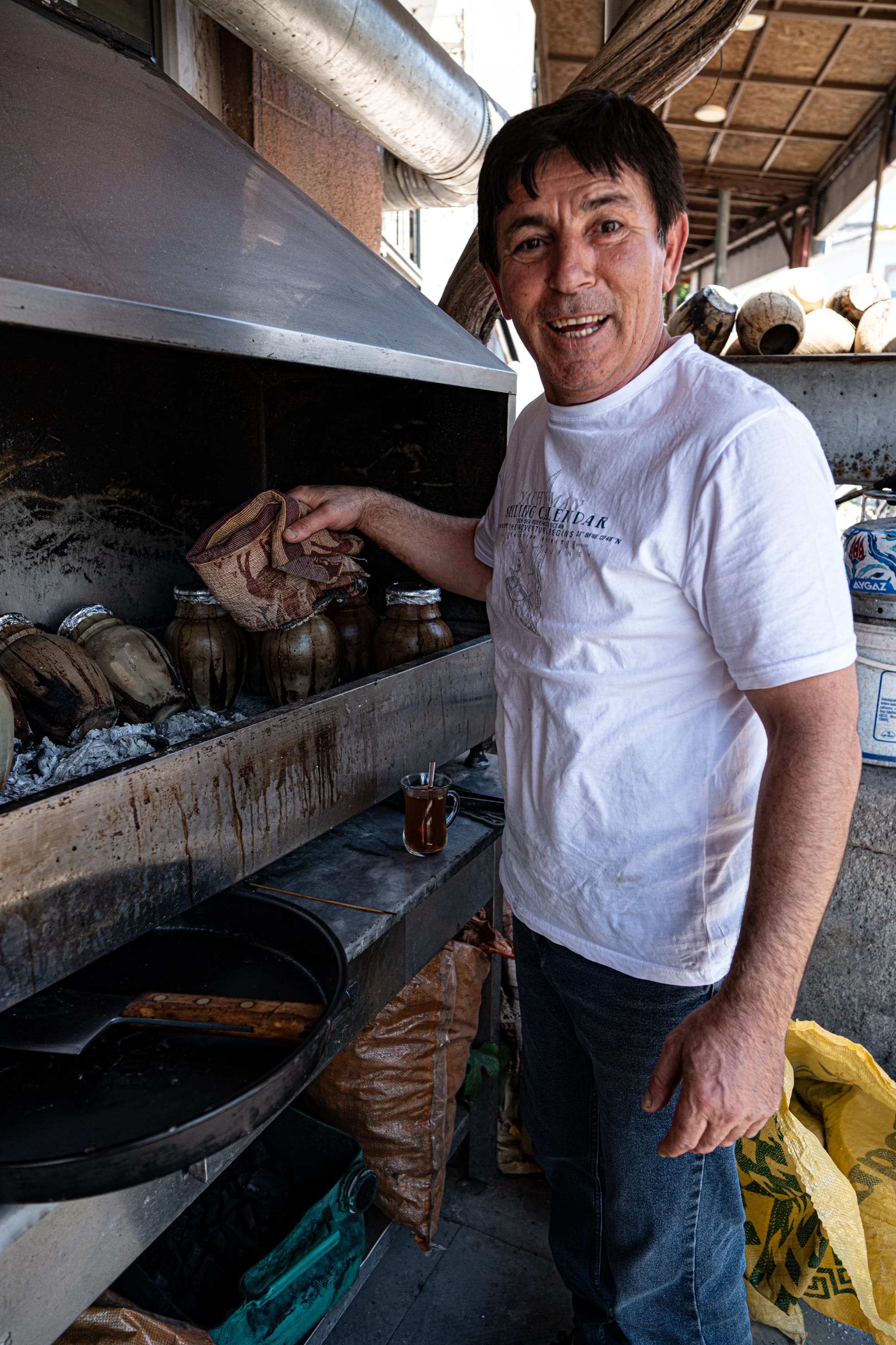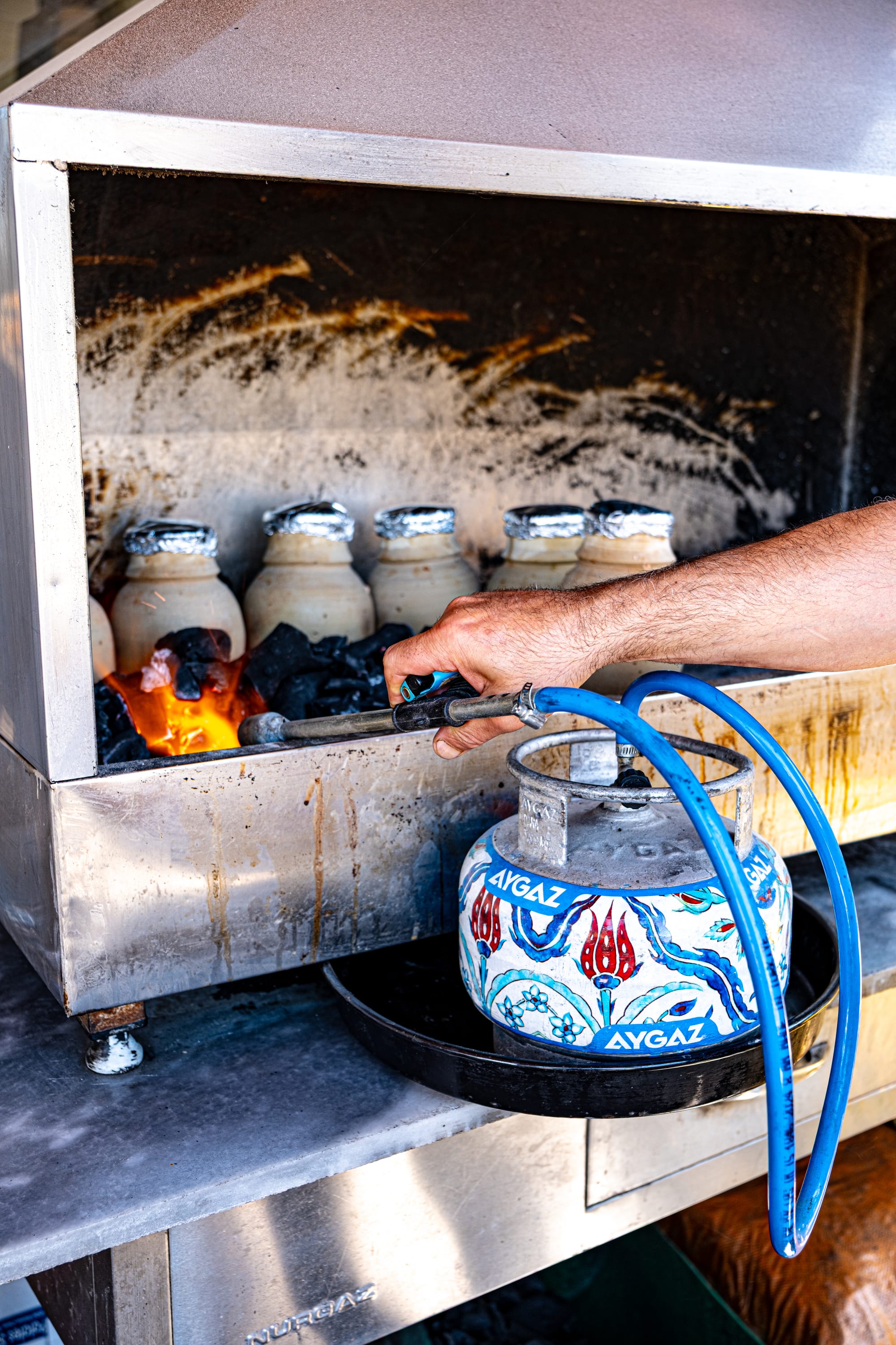 Bayram carefully loads the sealed clay pots into a charcoal oven, tending the fire to ensure the vegetables inside slow-cook evenly