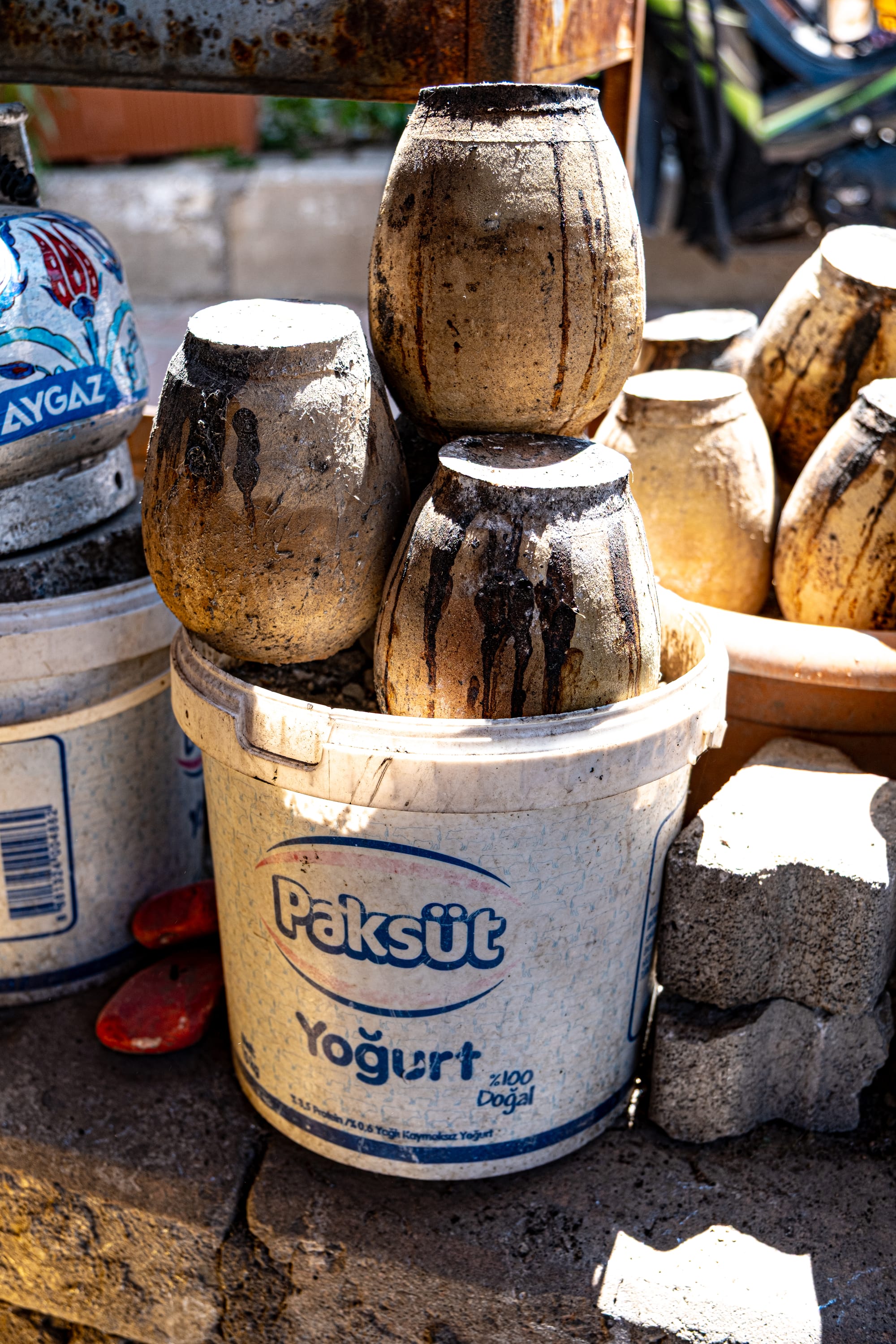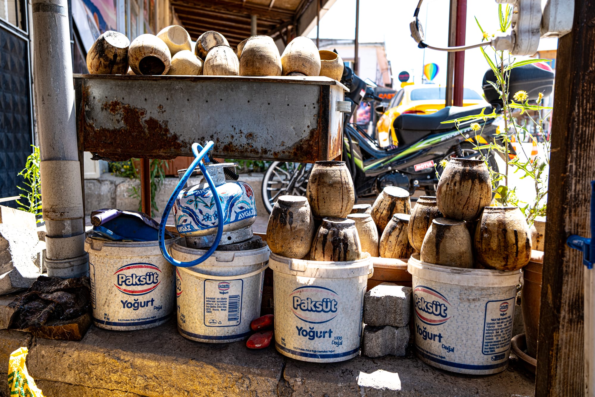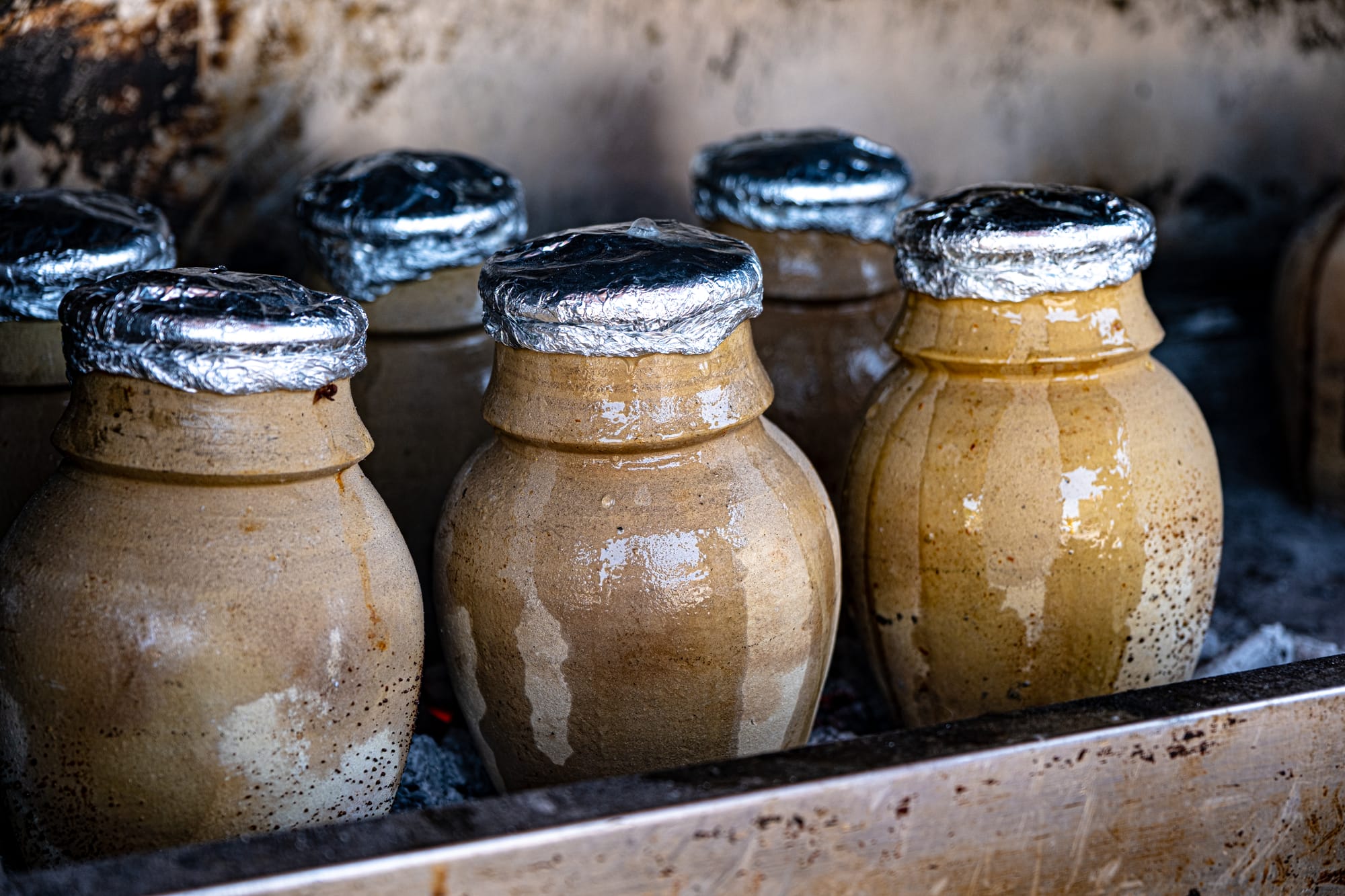Stacks of clay pots rest in repurposed yogurt tubs outside the restaurant, a quiet record of the dishes cooked and shared here