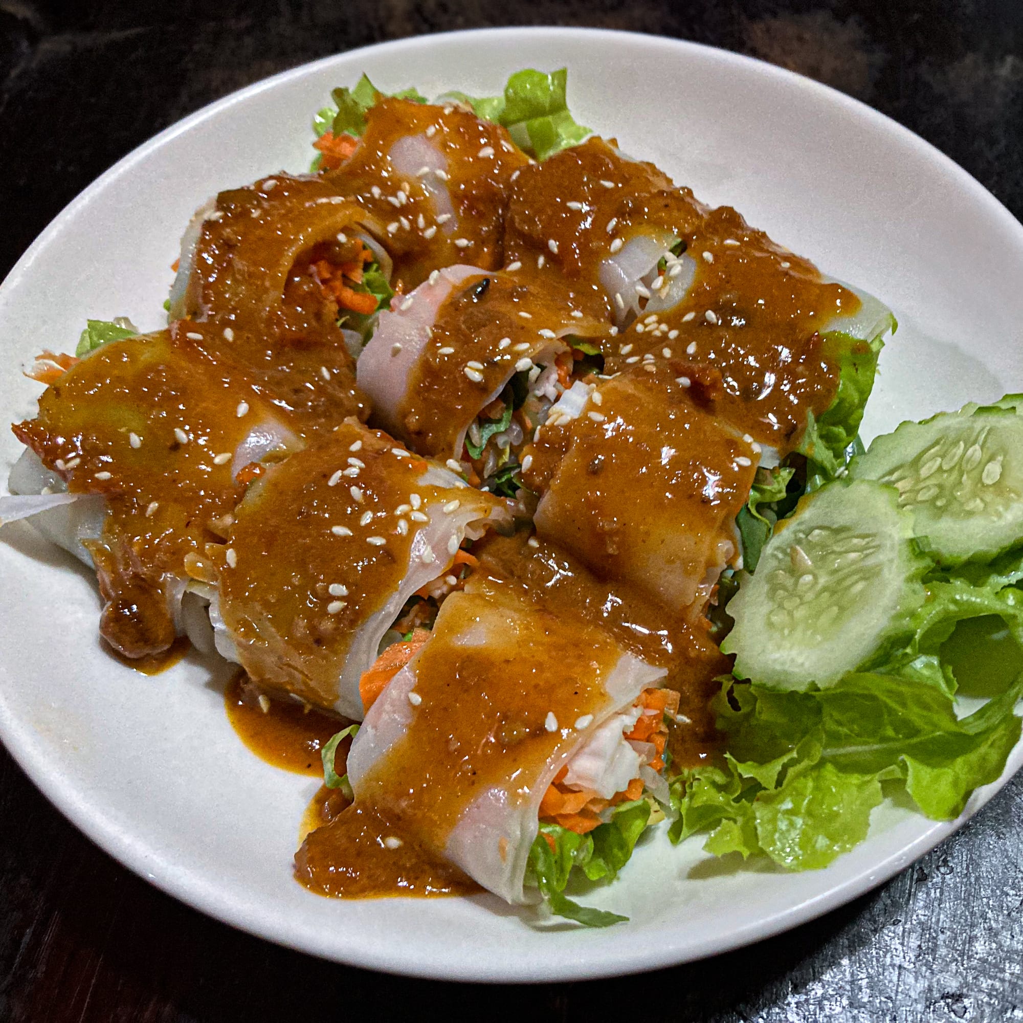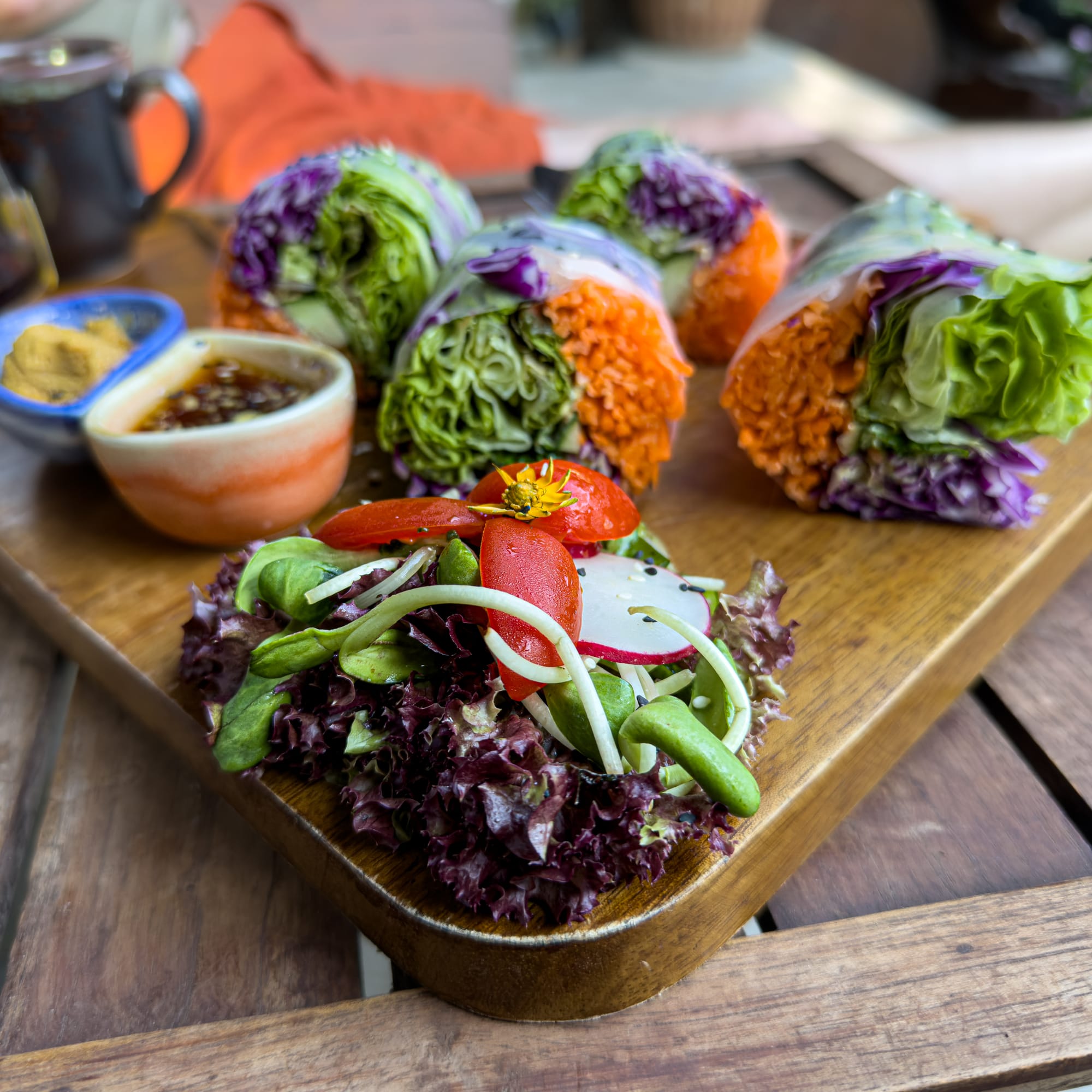 A cozy spot and a must-visit for plant-based travelers. Everything we tried was good, but the spring rolls and coconut kefir are what we’d come back for.
