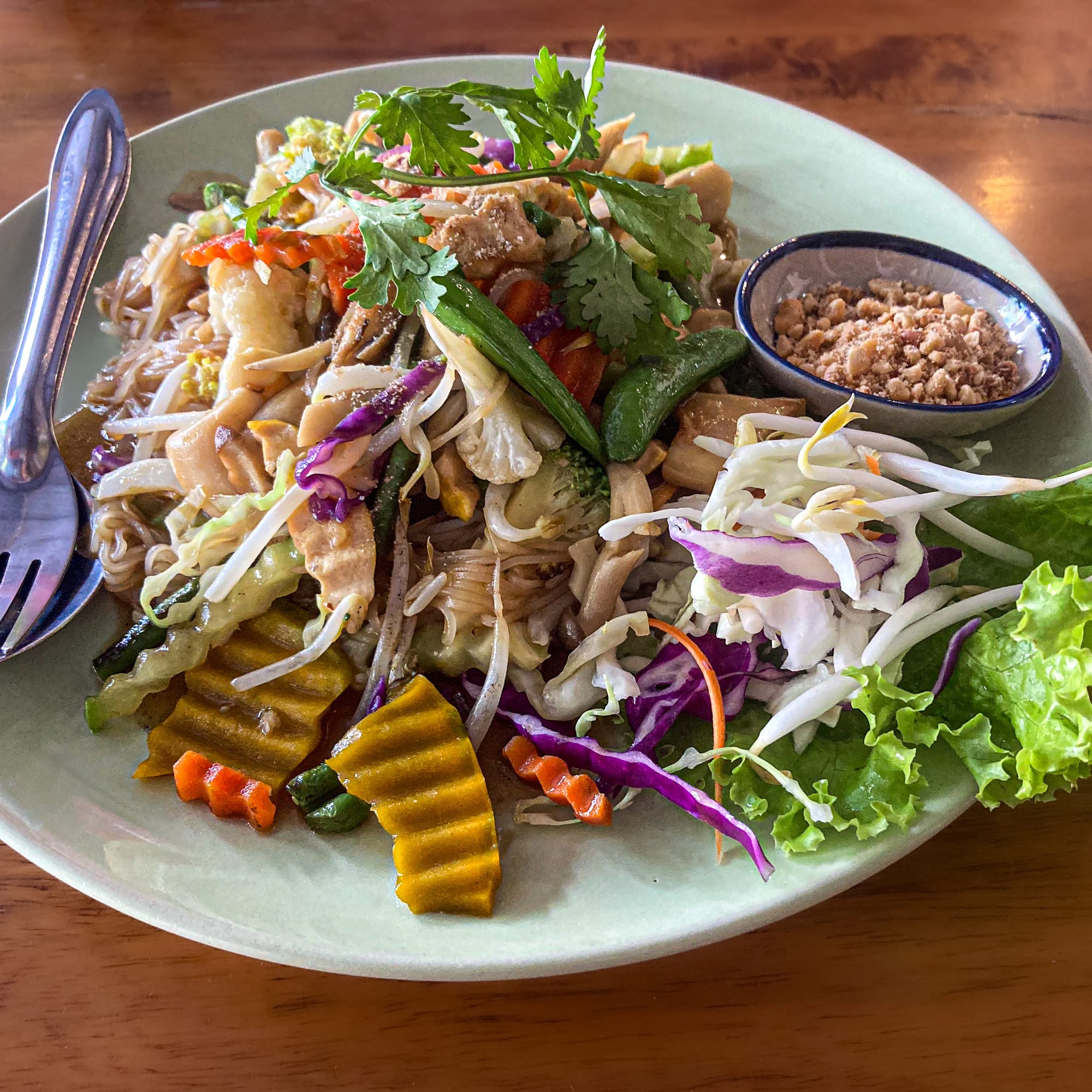 We ate here almost daily. Their menu is packed with fresh, healthy vegan options including vegetable wraps, tom kha, curries, and pumpkin soup. Smoothies are also a highlight. The black sesame banana smoothie and the mango coconut smoothie are favorites. Read our post.