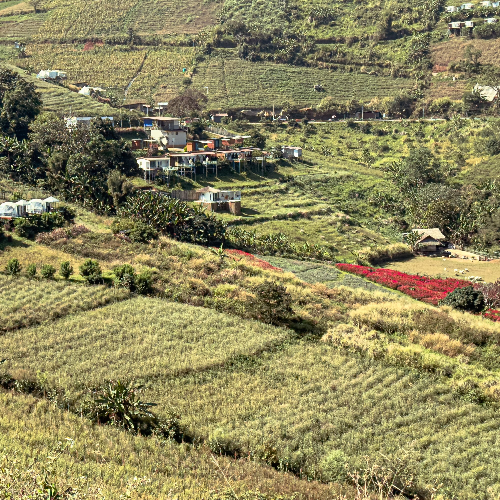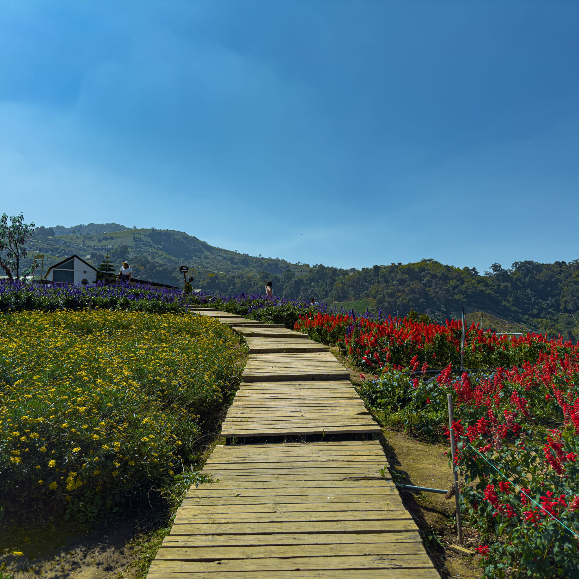 Mon Jam is one of Chiang Mai’s most photogenic spots, with seasonal flower gardens overlooking rolling mountains. Small bamboo huts dot the hillside, and food stalls sell local snacks. Go in the morning for cooler air and clearer views, or late afternoon for softer light. Read our post.