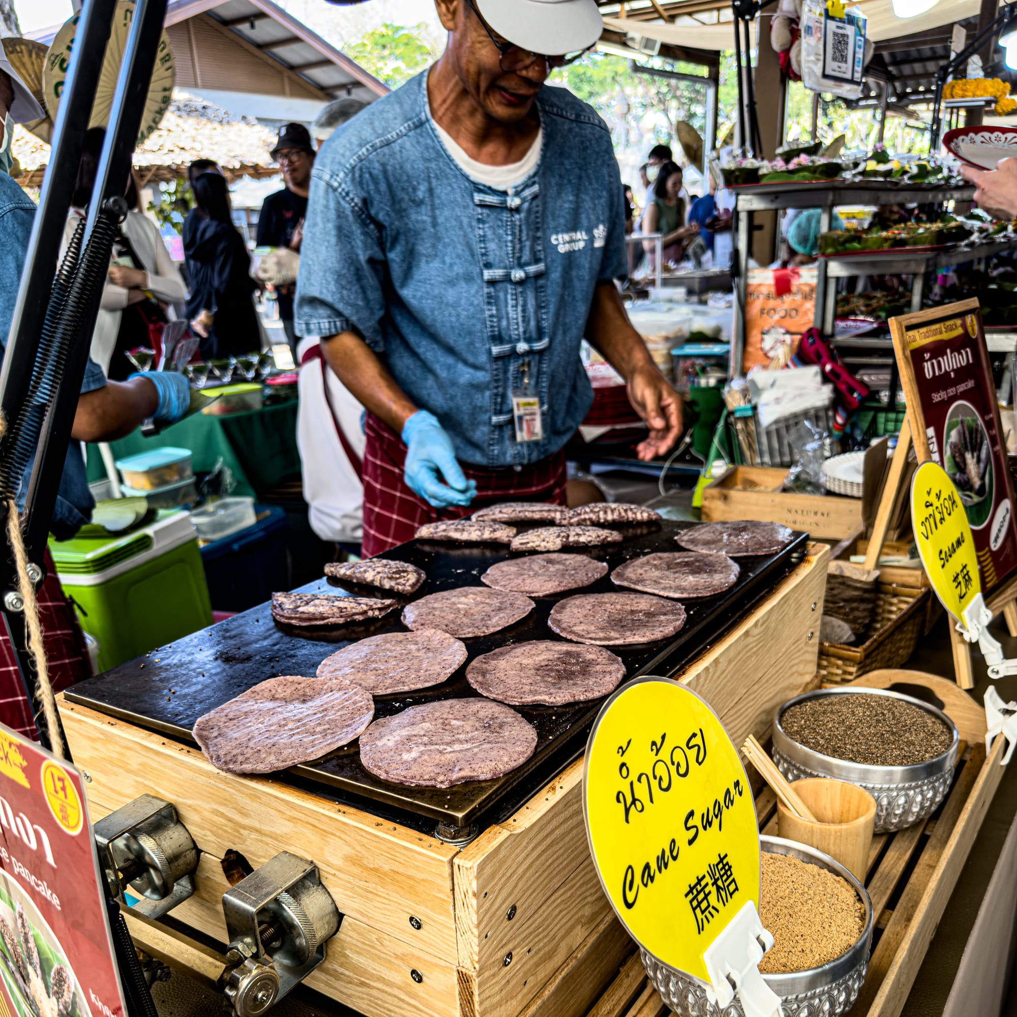 Jing Jai is a weekend farmers’ market in a shaded outdoor space north of the Old City. Local growers, artisans, and food vendors set up here, with a strong emphasis on organic and sustainable produce. It’s a great spot for fresh fruit and plant-based snacks. Read our post.