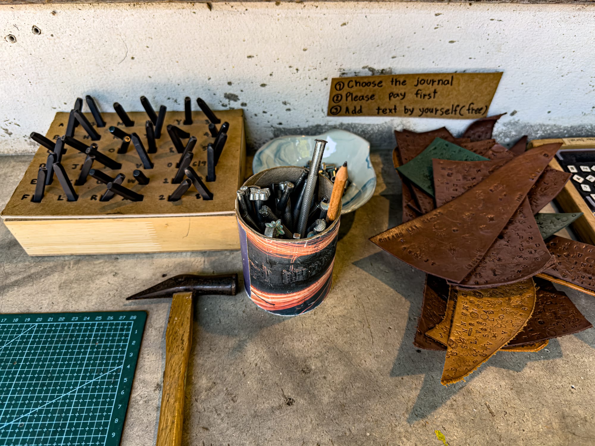 Tables invite visitors to not only browse but to participate. Tools, stamps, and scraps of leather are laid out for customization, allowing people to leave with journals that bear their own creative mark.