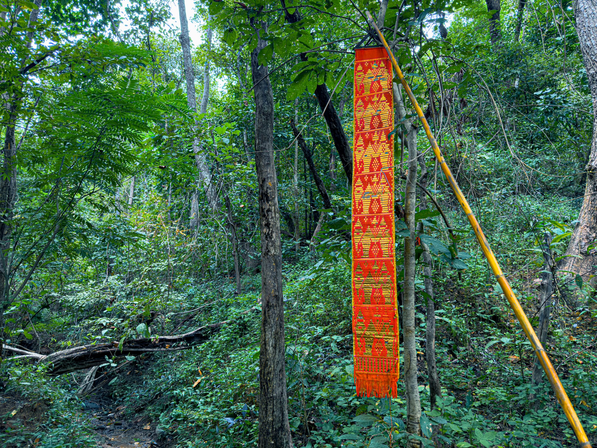 Streams weave through moss-colored stone and jungle greenery, while bright prayer banners flutter along the trail