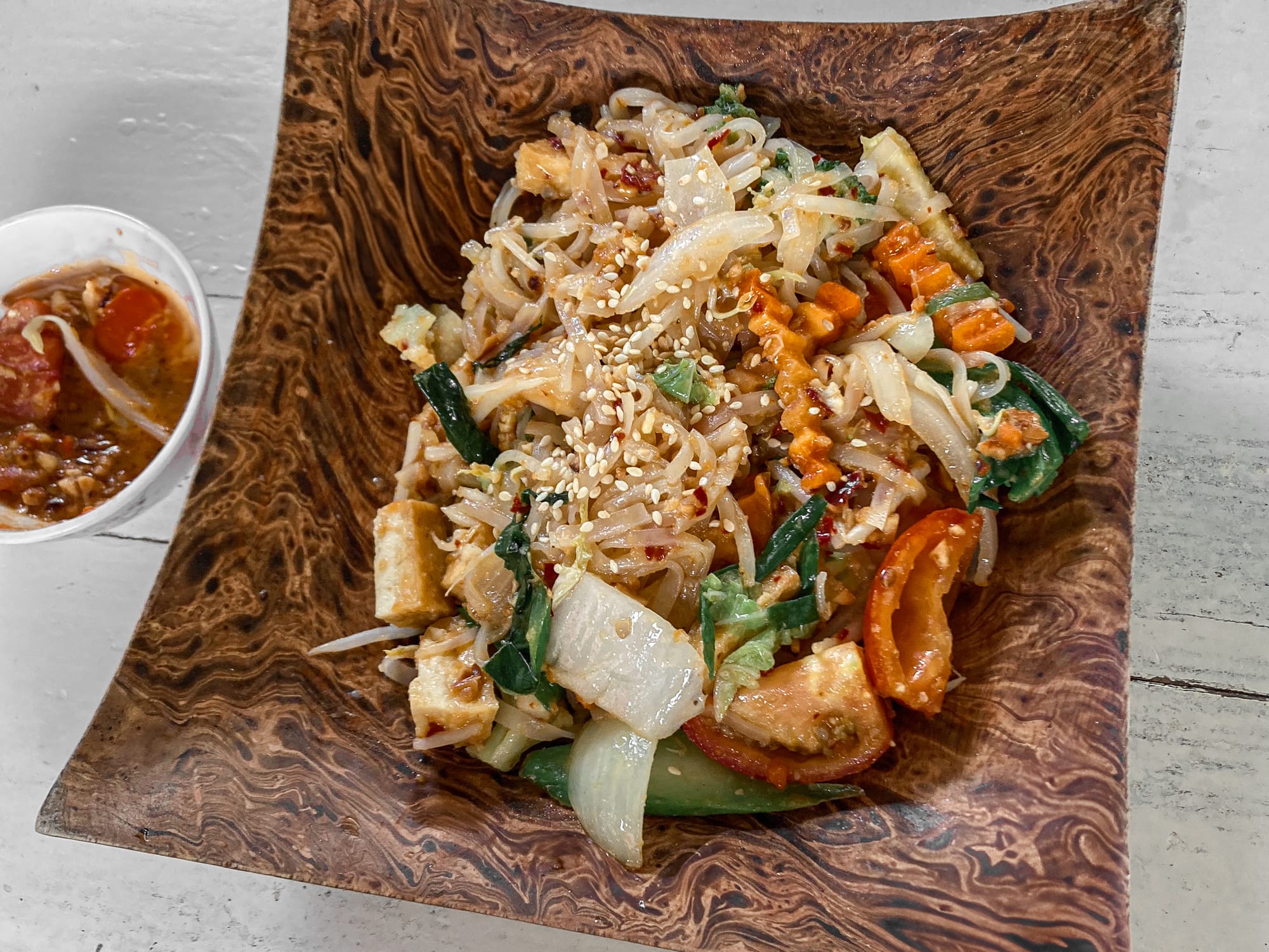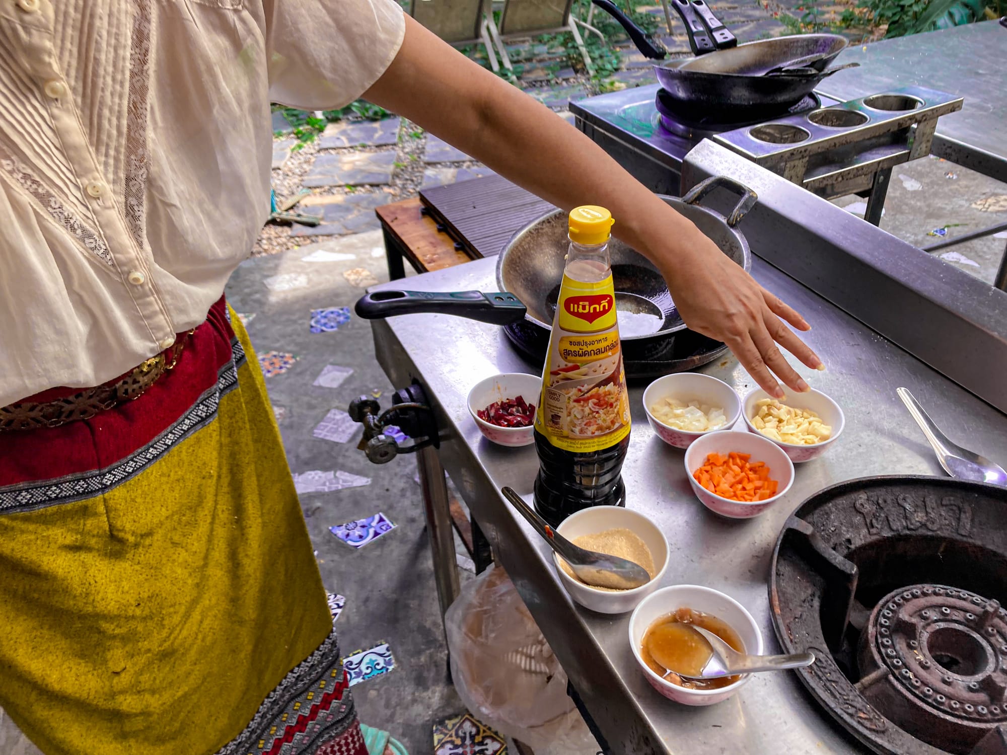 Cooking pad thai at May Kaidee’s vegan class in Chiang Mai, from fresh vegetables to a flavorful finished dish