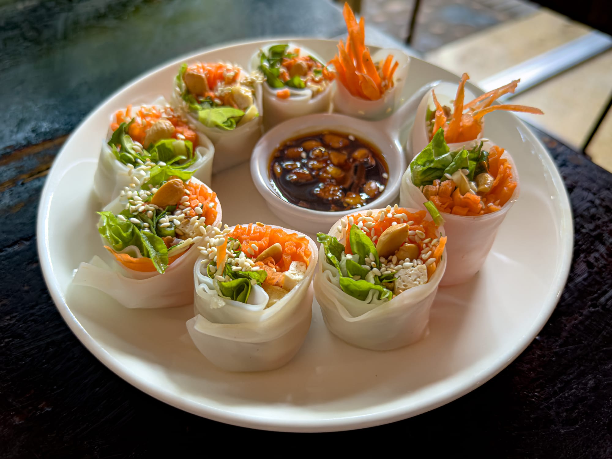 The dishes we enjoyed at the restaurant reflected everything we’d learned in he class. The pumpkin hummus was velvety smooth. The green curry glowed, fragrant with Thai basil and hearty mushrooms. The pad thai was chewy, bright, and peanutty. They spring rolls arrived filled with crisp greens and handmade sauce. The mango sticky rice glowed golden, pure sweetness perfectly paired.