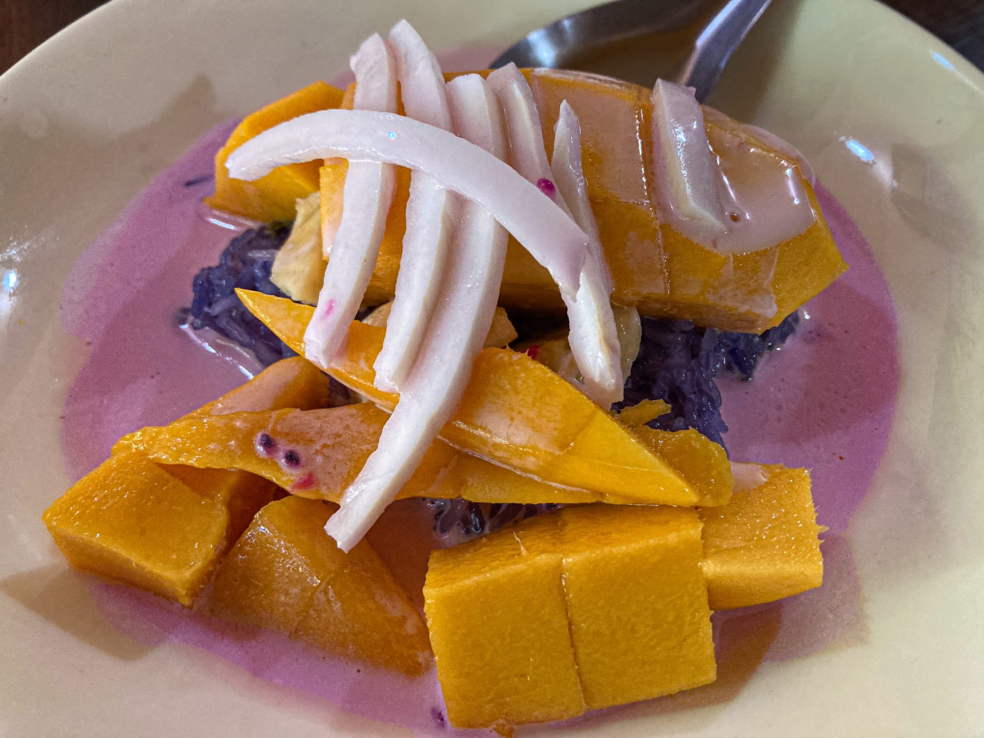 Over several hours, our instructor taught us to make a complete vegan Thai feast. We crushed curry pastes in mortar and pestle, honoring each step of the Thai culinary process. We pounded coriander, folded lime leaves, and worked toward balancing the vivid symphony of sour, sweet, salty, and spice. We crafted pad thai, red curry, green curry, peanut sauce brightened with tomato, coconut-rich tom kha, papaya salad, fragrant spring rolls—you name it, we made it. At the end, we sampled mango sticky rice that glowed beside blue-streaked butterfly-pea rice—color and flavor dancing together.