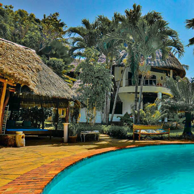 Just a 6‑minute walk from Galu Beach, Upani offers serene rooms and cottages nestled in leafy gardens. Features include a sun terrace, year‑round outdoor pool, shared kitchen option, spa, and wellness packages.