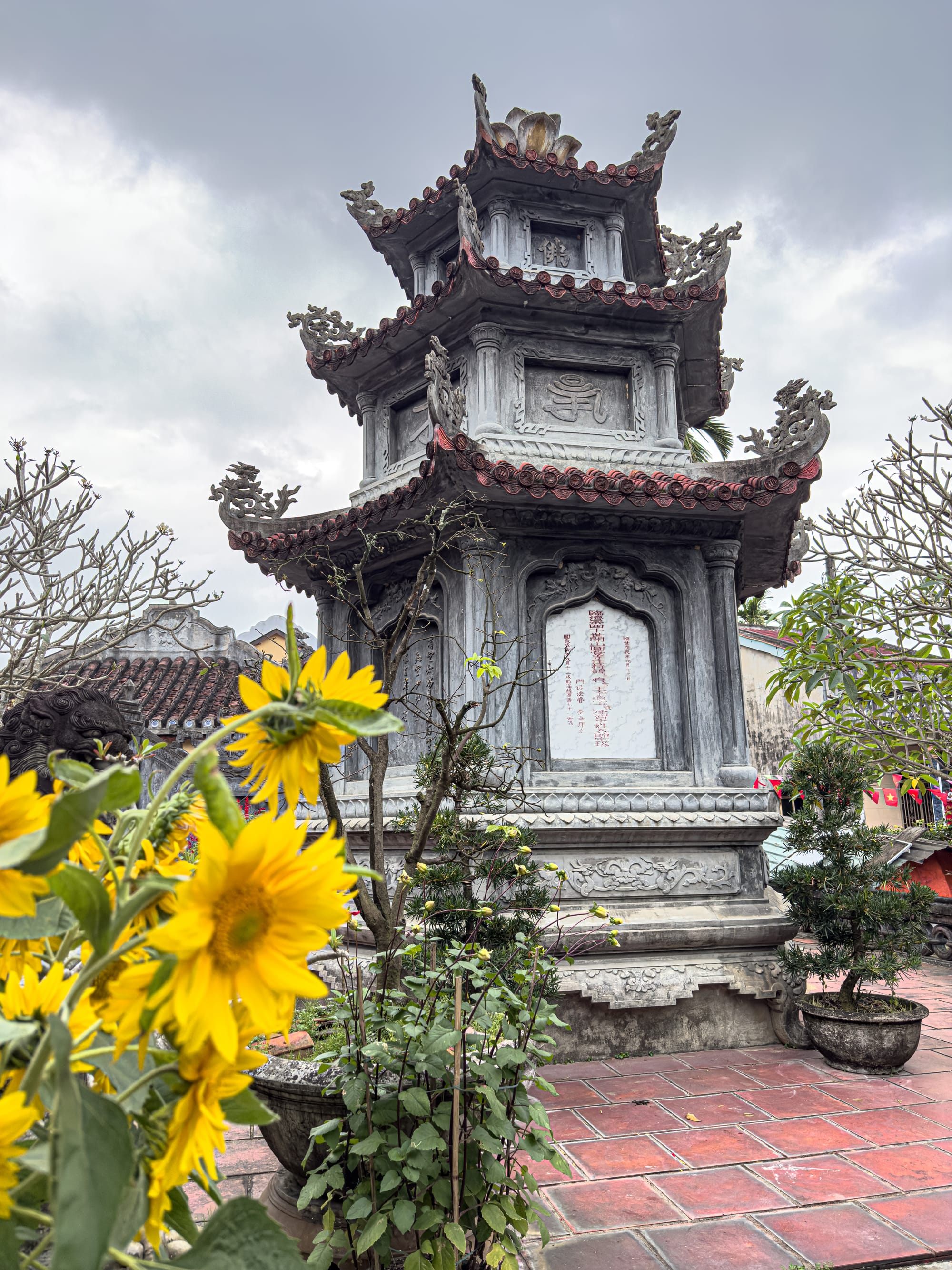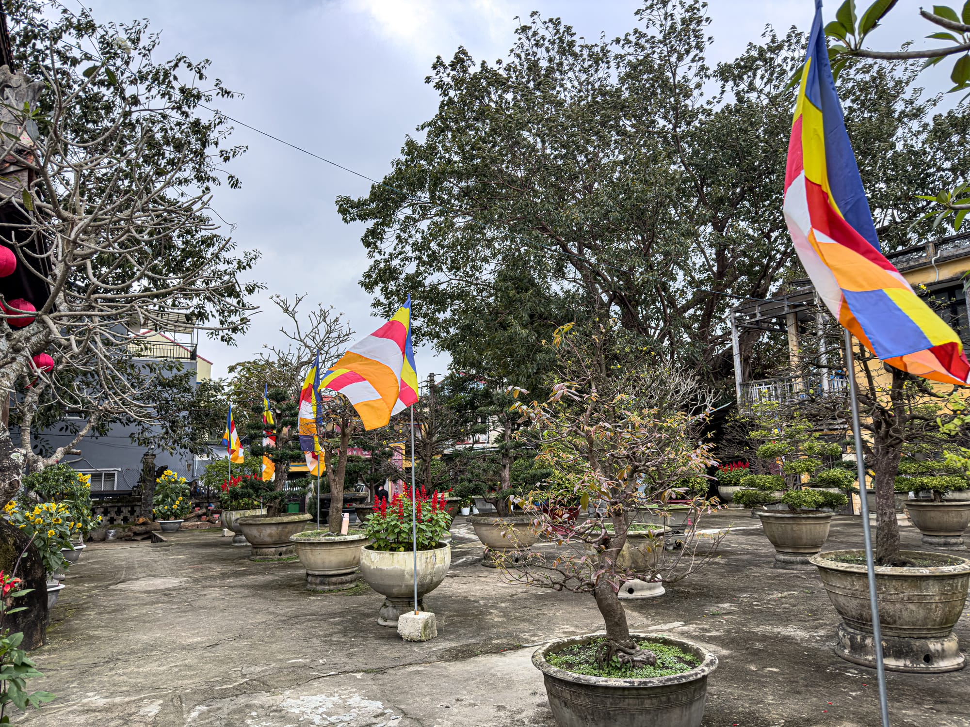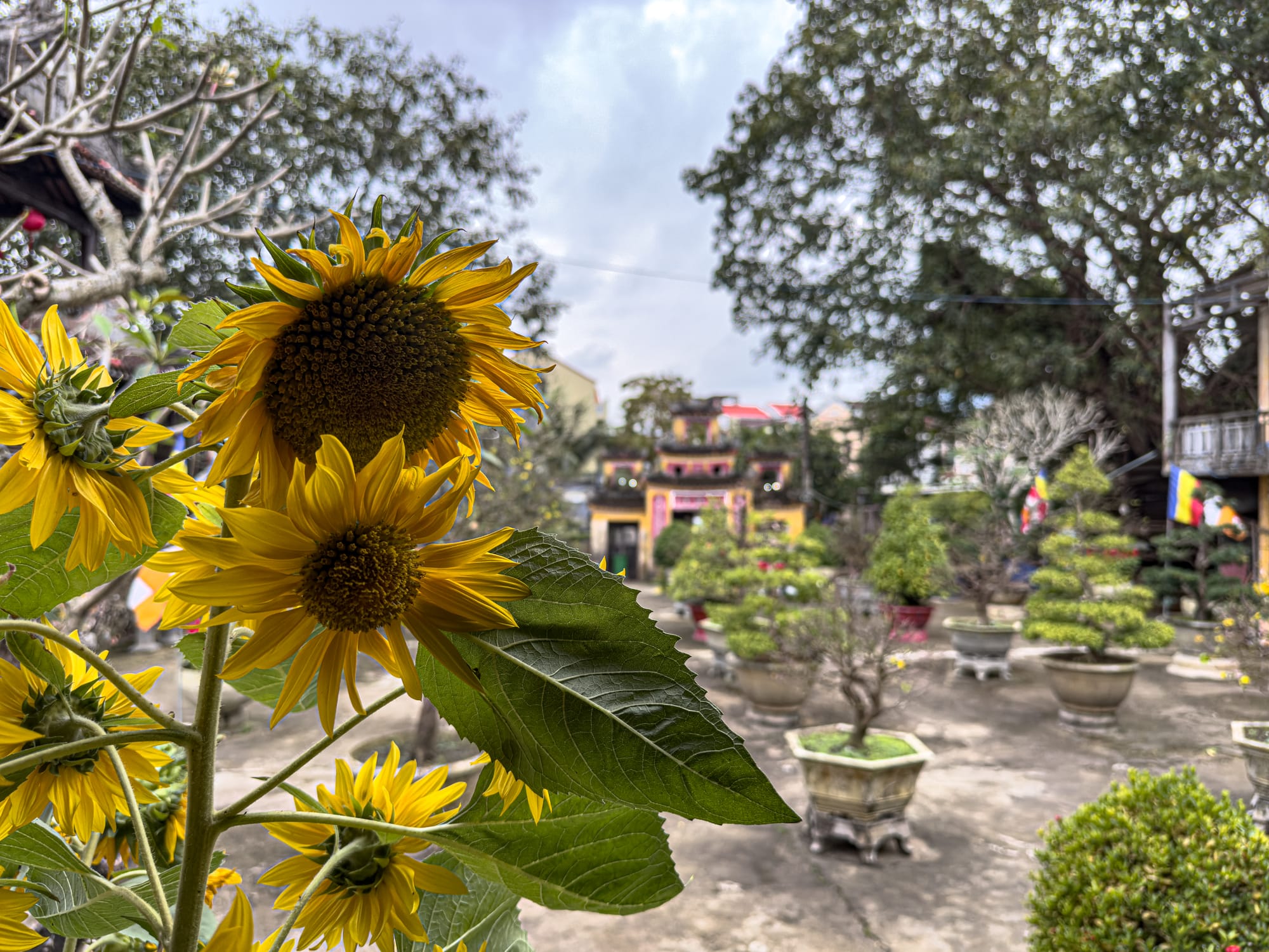 Gardens and temple courtyards in Hội An’s Old Town bloom with flowers, bonsai, and centuries-old trees