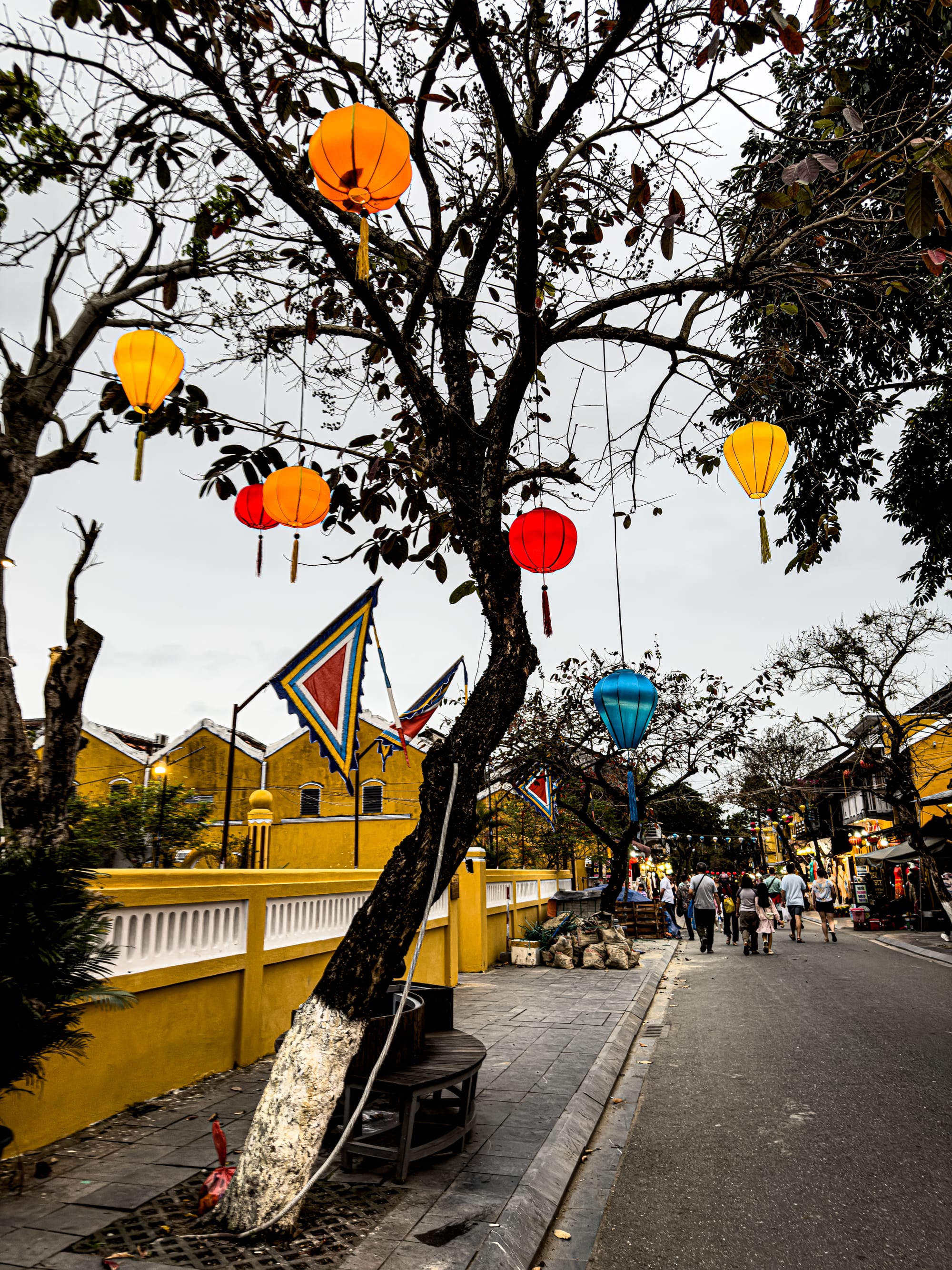 Each facade tells a story: faded yellow plaster hinting at the passage of centuries, carved wooden balconies showing the artistry of craftsmen, colorful lanterns swaying in the breeze adding both beauty and intimacy. Vendors set up stalls under ancient trees, selling fresh fruit, handmade toys, and silk goods. The air is rich with the scent of incense from temples, the sweetness of street food, and the faint salt of the nearby sea.