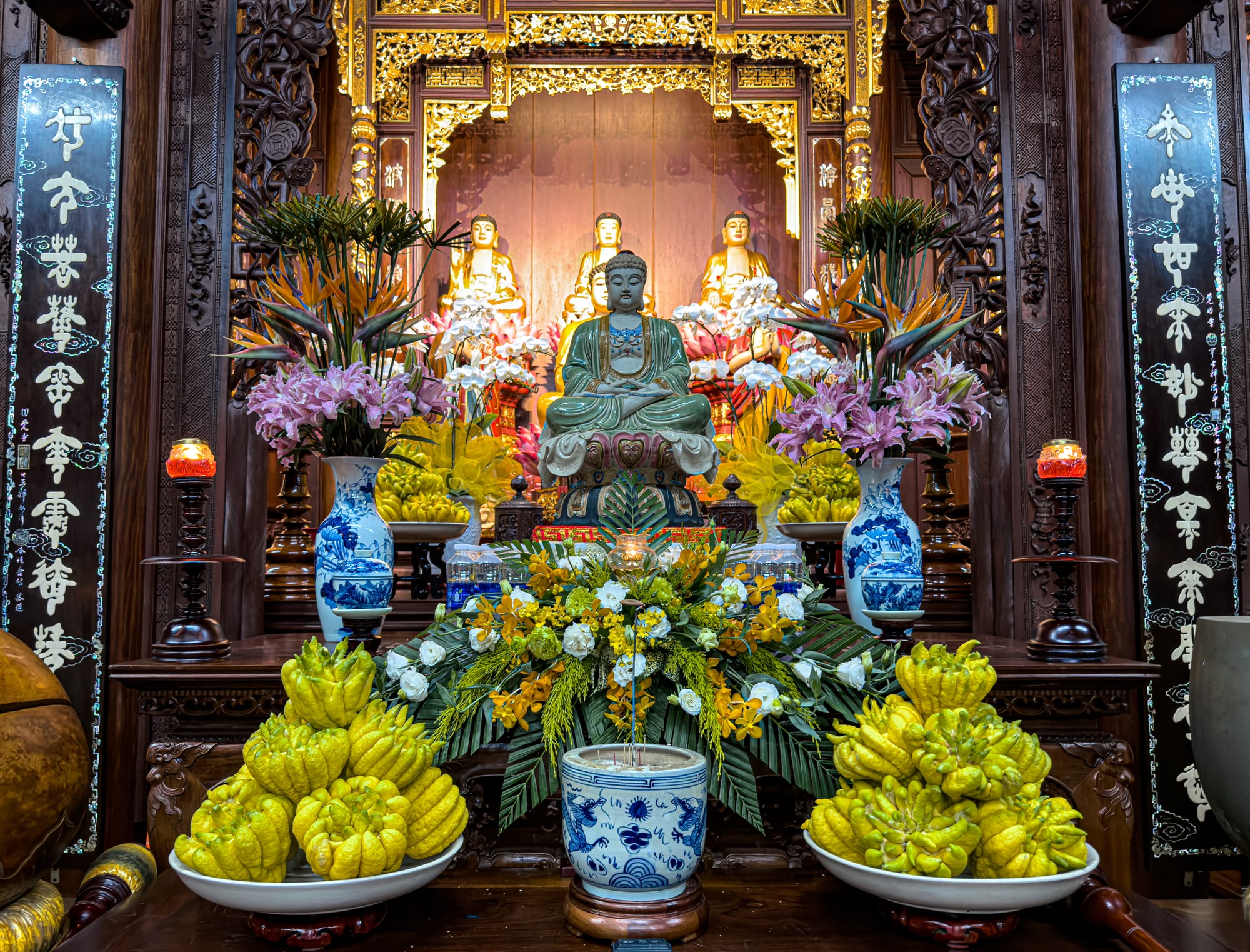 The Fujian Assembly Hall is perhaps the most famous. Its grand entrance gate, adorned with dragons and guardians, leads into courtyards filled with bonsai trees, incense, and altars. Dedicated to the sea goddess Thiên Hậu, it reflects the fears and hopes of seafaring traders who entrusted their lives to the ocean. Inside, murals and carvings depict dragons, phoenixes, and mythological tales, each a reminder of the blend of artistry and devotion that defines the hall.