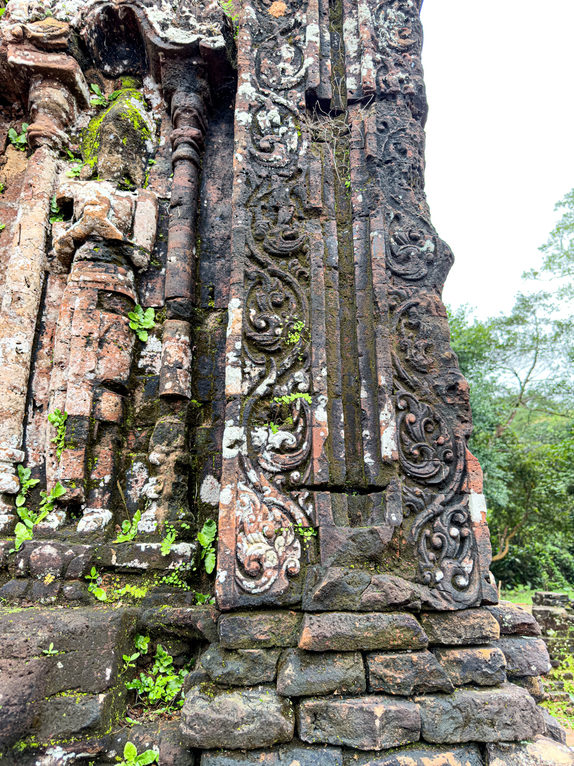 Each step at Mỹ Sơn reveals a different texture of time. Some temples stand tall, their doorways framed with intricate carvings of deities and dancers. Others are little more than mounds of scattered bricks, overtaken by roots and greenery. The contrast is haunting—a reminder of both the sanctuary’s former glory and the fragility of cultural heritage.