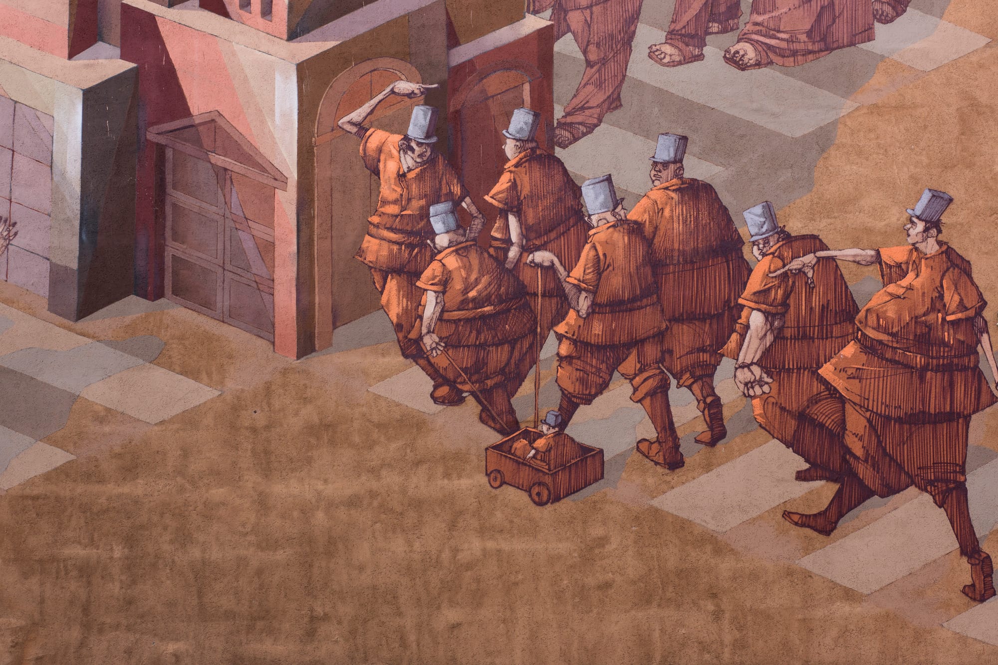 The architecture of the painting—stacked, skewed, almost crumbling—bears Chazme’s signature style: futuristic yet brutalist, orderly yet unstable. Sepe’s figures, often distorted and theatrical, evoke tension and ritual, a quiet kind of dissent or surrender. The muted tones and dry brushwork make the scene feel carved into the wall rather than painted on top of it.