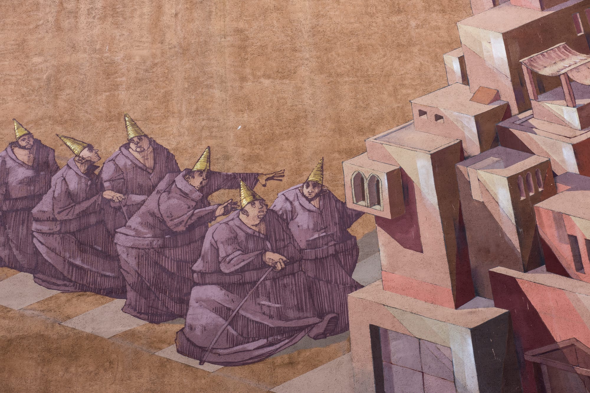 Painted in Dabtar’s unmistakable style—equal parts political satire, cosmic mythology, and absurdist cartoon—the mural features a stacked assemblage of characters, from a robed, cross-eyed sufi-like figure with a pine branch and a peace flag, to a penguin adorned with a gemstone necklace, all perched atop bizarrely expressive creatures. Each figure has its own textures, colors, and eccentric accessories, stitched together with wild-eyed intensity and over-the-top costume design.