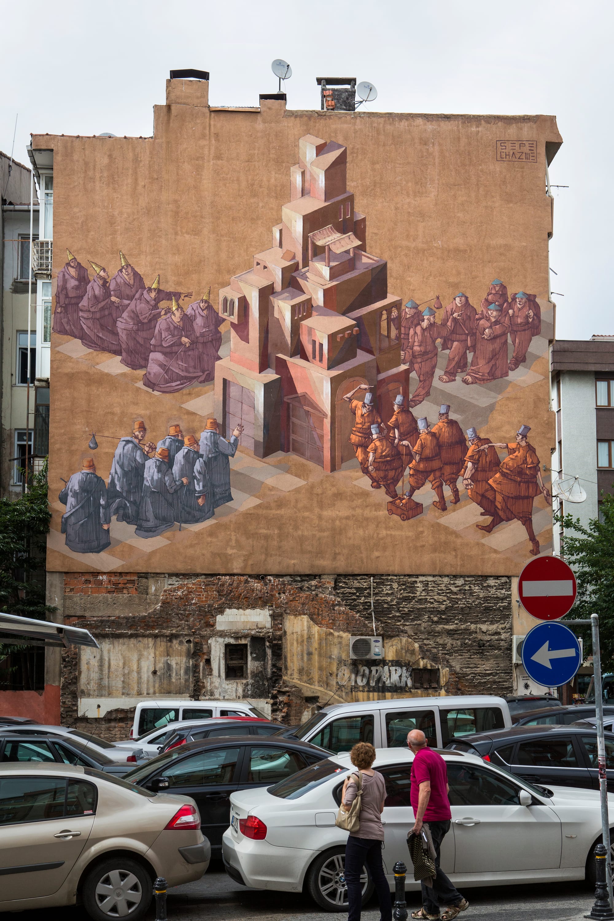 Known for his subversive comics and graphic language, Cins works in a visual vocabulary shaped by satire, absurdity, and local politics. There’s humor here, but it’s the kind that burns a little—cartoonish, yes, but deeply critical of authority, conflict, and the spectacle of collapse. The use of exaggerated linework, heavy outlines, and anthropomorphic forms ties the mural to the tradition of underground comics, yet it feels distinctly contemporary, grounded in Istanbul’s multilayered urban friction.