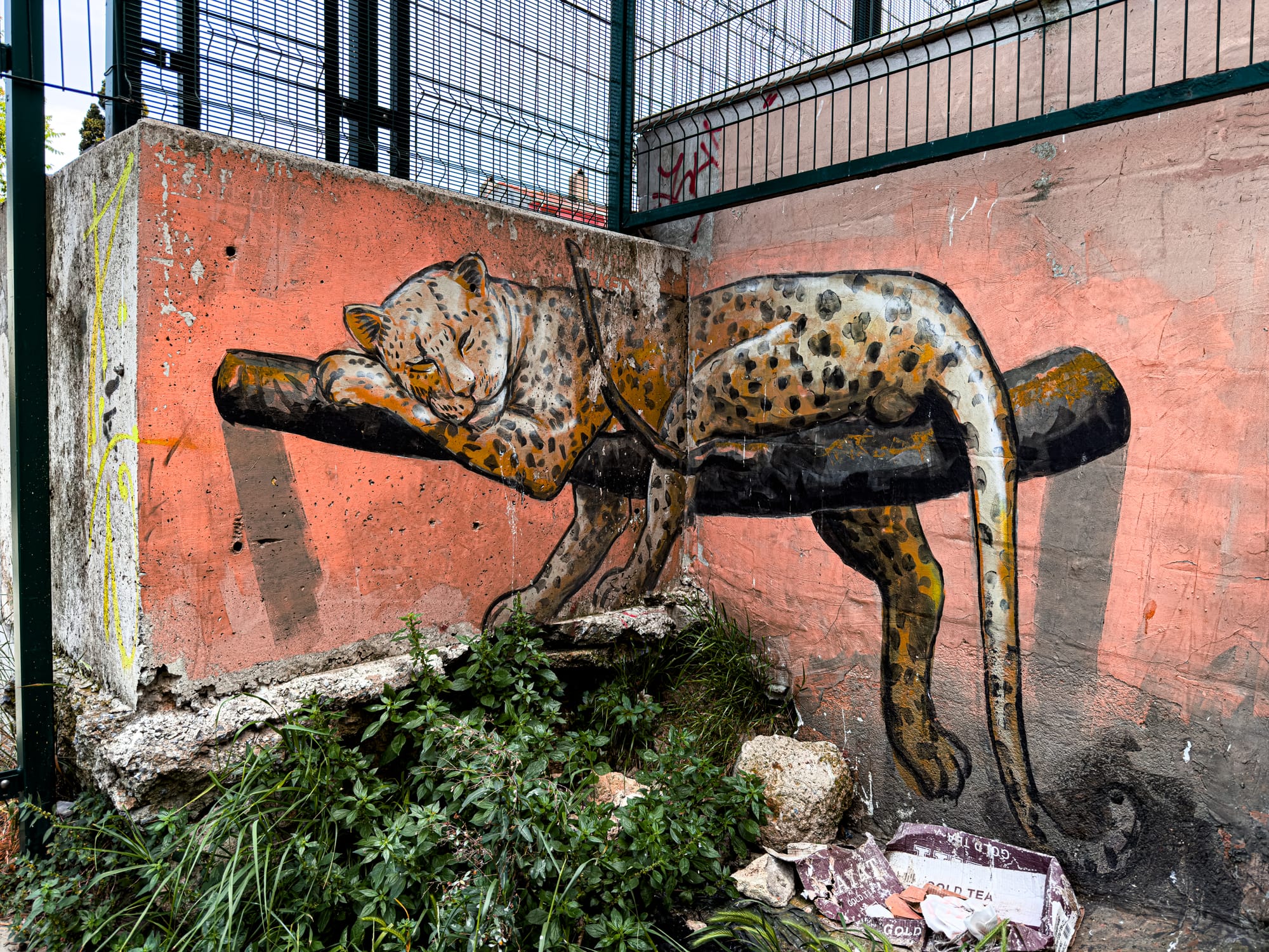 What’s striking here is how well the mural embraces its context. The building’s many windows become part of the tiger’s musculature—embedded into its flank and chest—reminding the viewer that the city and its wildness are never separate. There’s something anarchic about this tiger too, its mouth wide open in a snarl, teeth bared not just at passersby but perhaps at the system itself.