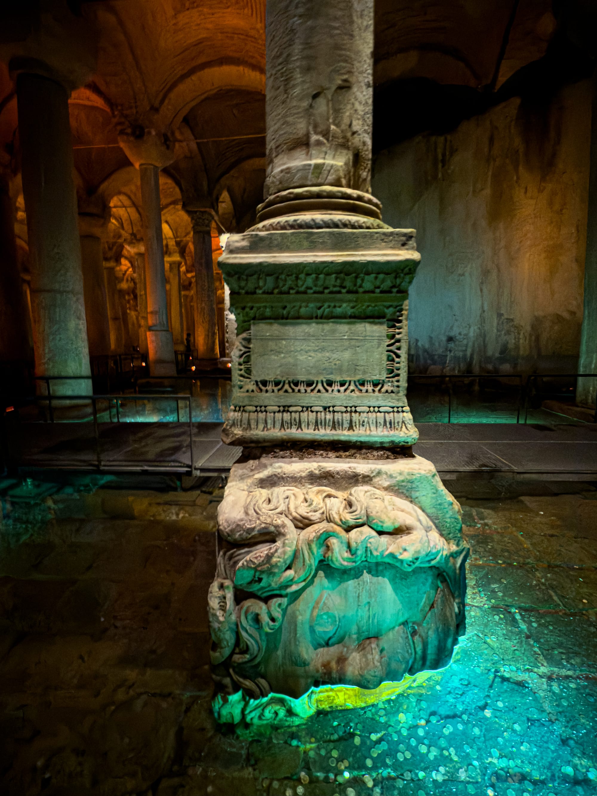 Among its most famous features are the two Medusa head column bases, whose origins and purpose are still debated—one lies sideways, the other upside-down, adding an air of mystery to the space. Each column has its own story, some repurposed from older Roman structures, their carvings and capitals worn smooth by centuries. It’s a place that rewards slow wandering: look closely and you’ll notice carved patterns, hidden corners, and the occasional art installation that plays with the Cistern’s natural acoustics and haunting beauty.