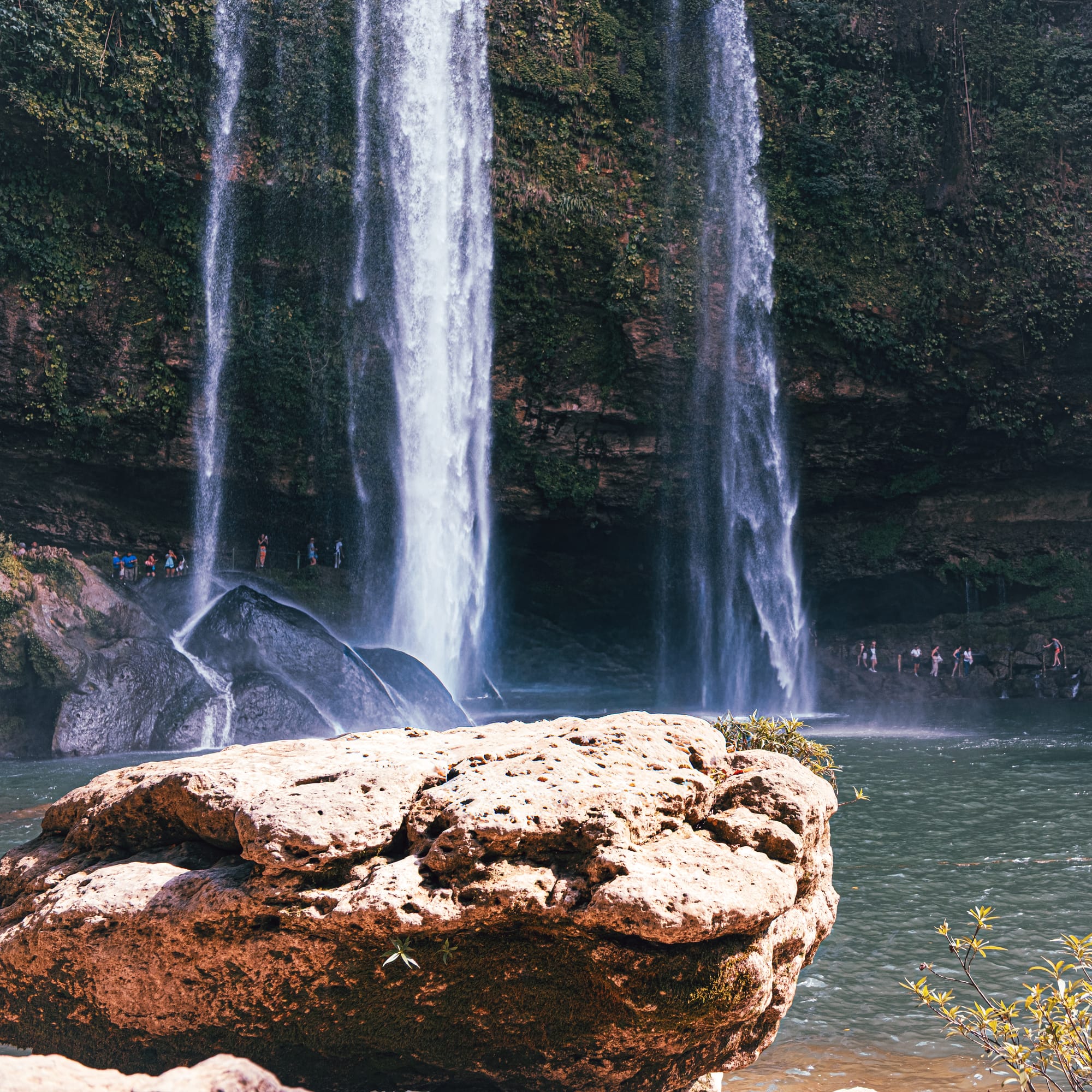 Near Palenque, Misol-Há is a tall, single-drop waterfall that plunges into a deep jungle pool. You can swim beneath the falls or walk behind the curtain of water for a closer view. Read our post.