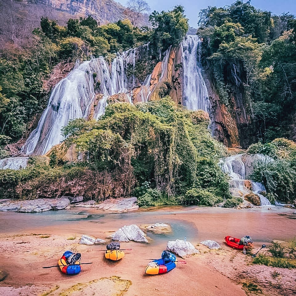 Tucked inside El Ocote Canyon, El Aguacero is one of Chiapas’s most dramatic waterfalls. A steep staircase leads down to the river, where you can swim beneath the falls and explore the surrounding caves. Photo credit.