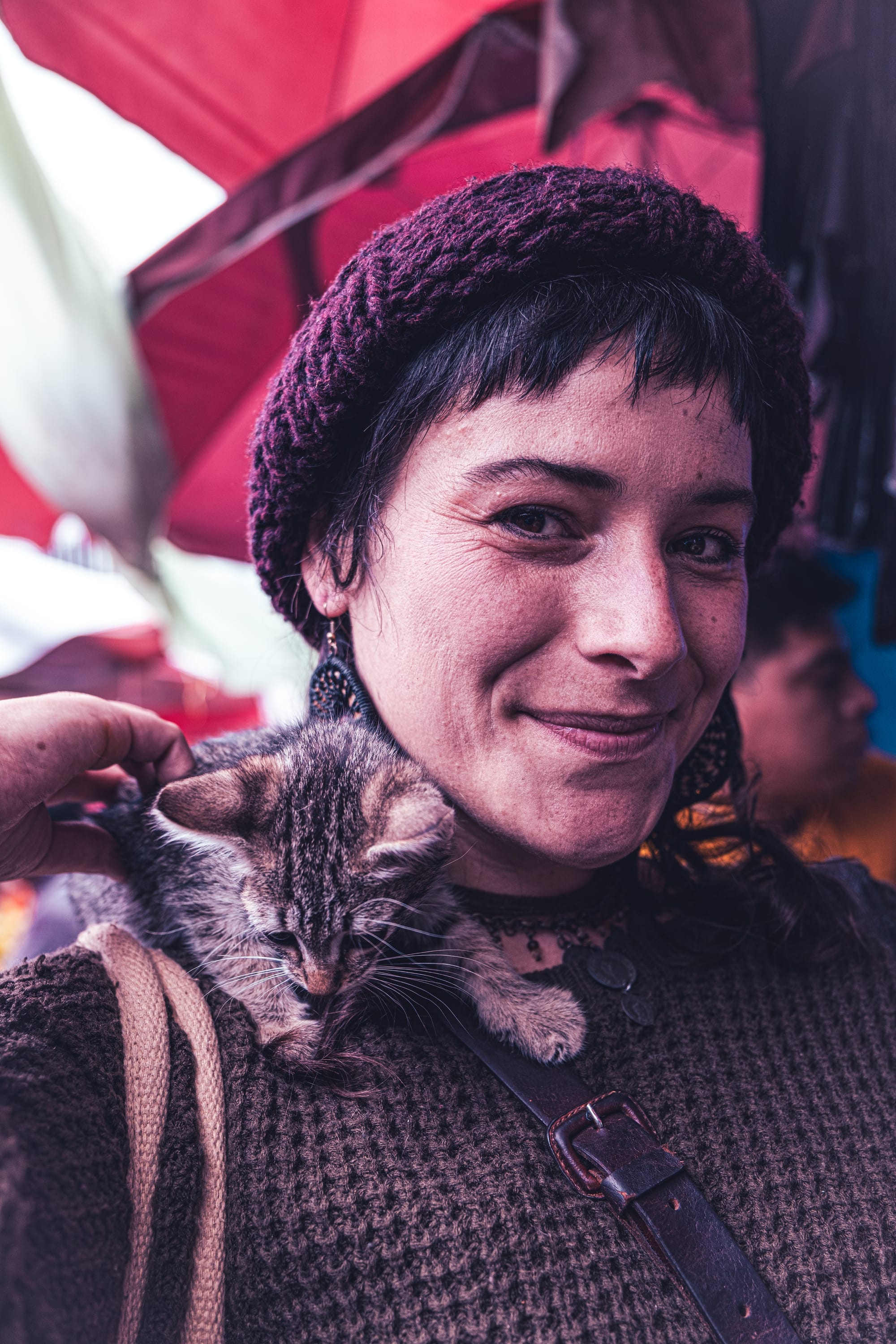 Before we began shopping, Itzel paused, noticing movement near the floor. A tiny kitten, barely the size of a handful, nudging at some boxes. Its mother, she learned, had recently had babies, and the vendors were offering them away for free. The kitten blinked up at her with an innocence that seemed to echo her own soft way of seeing.
