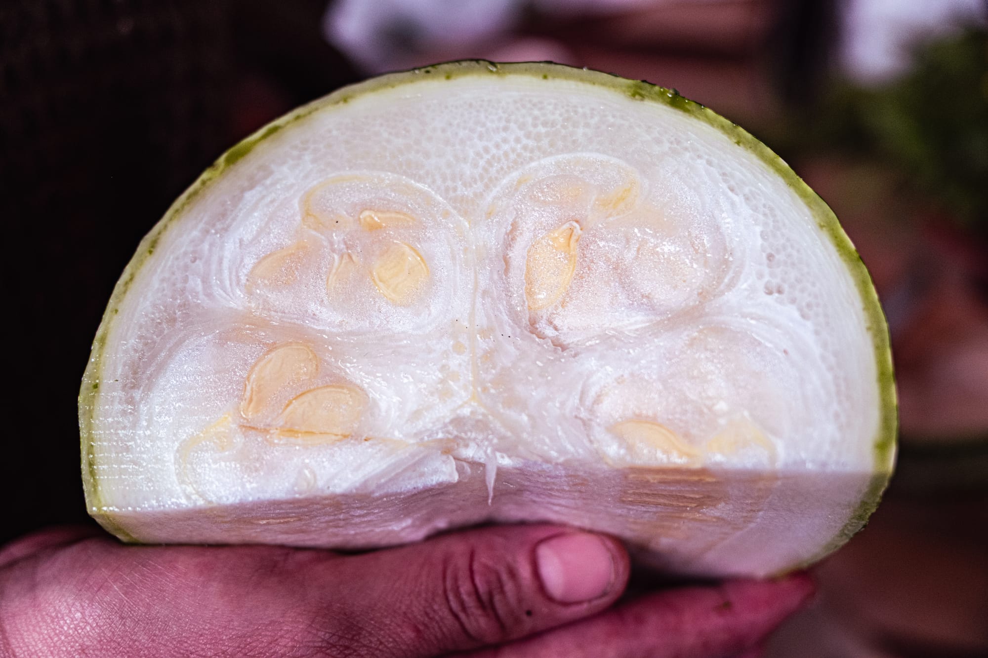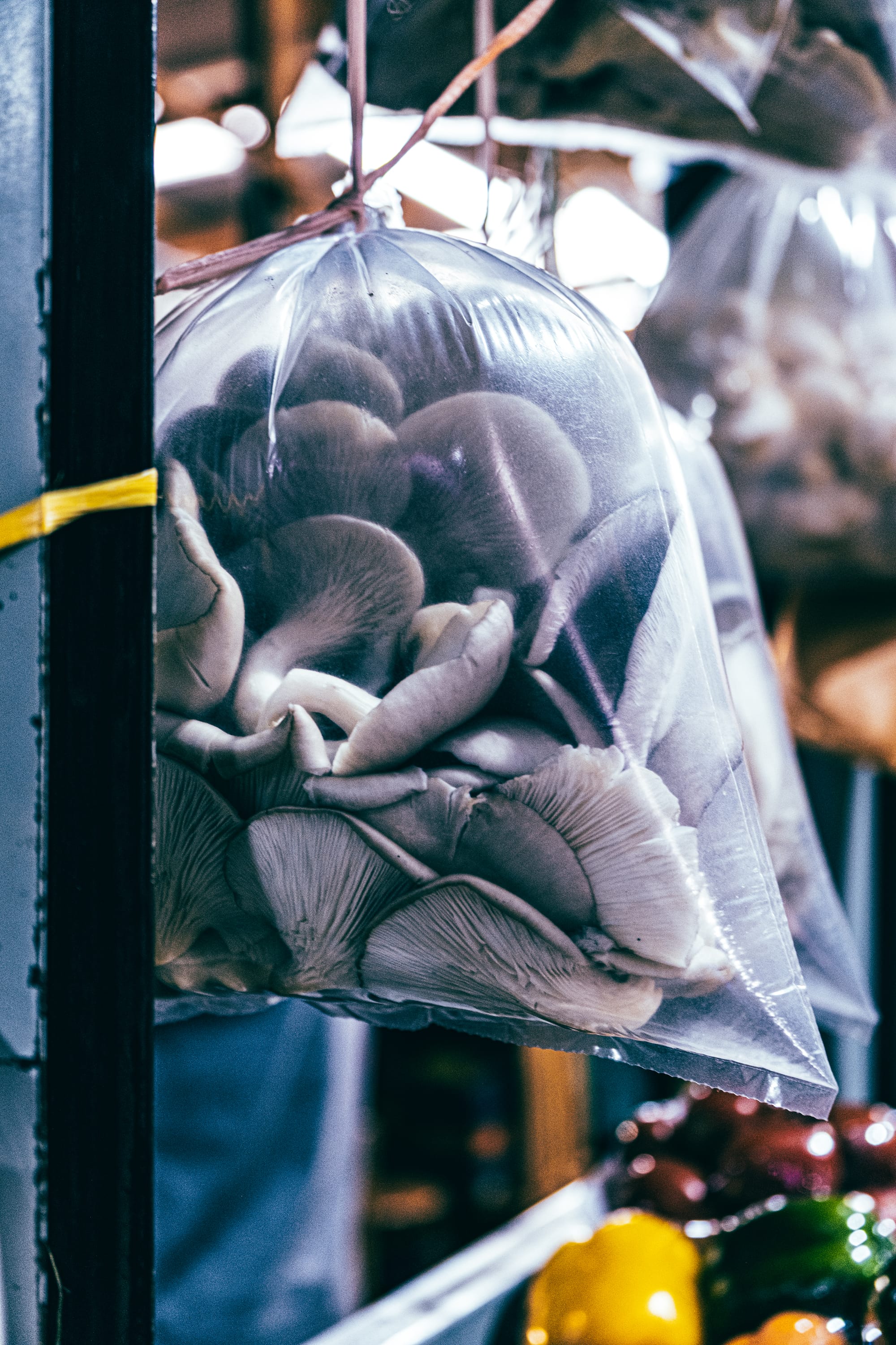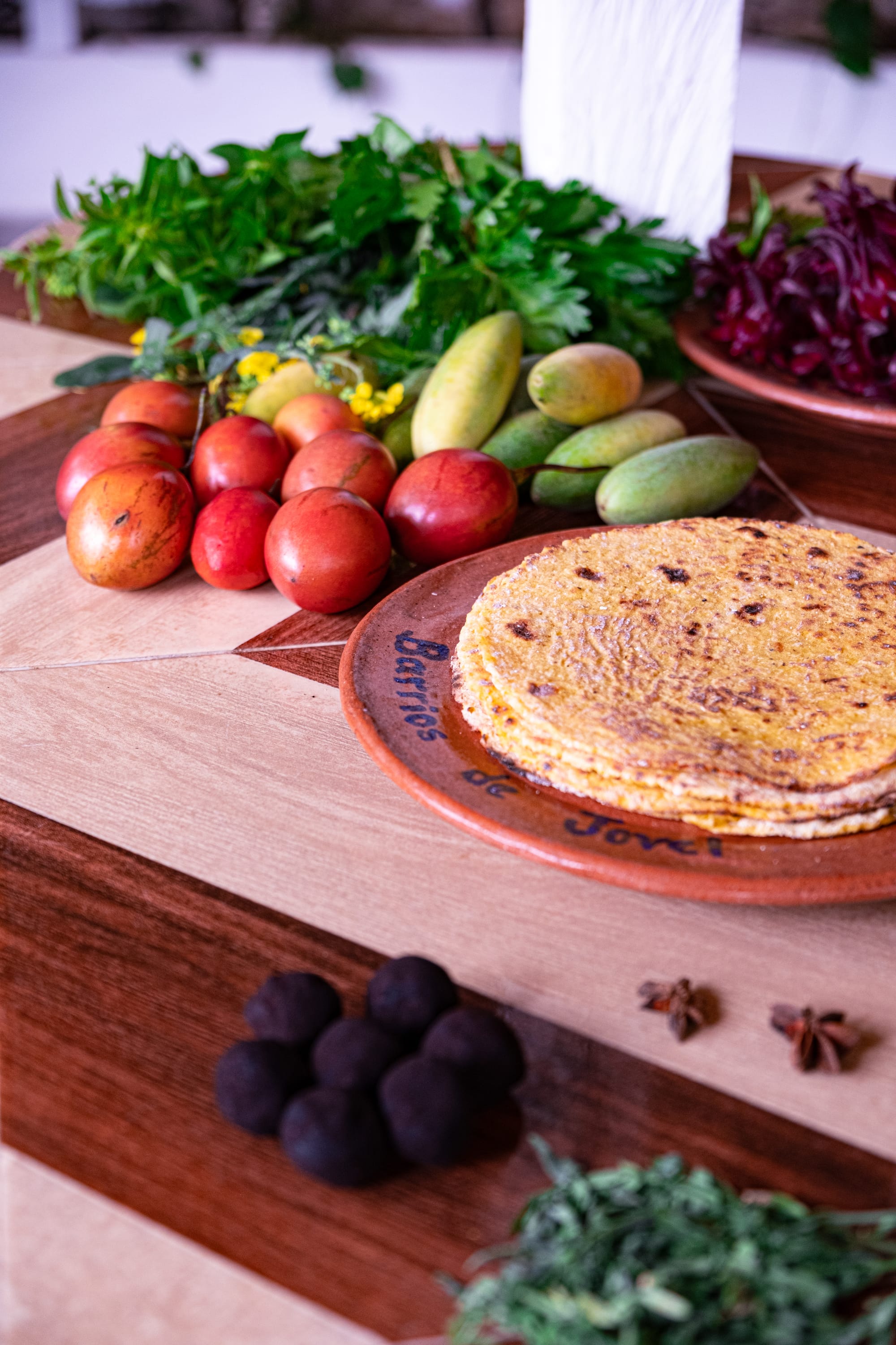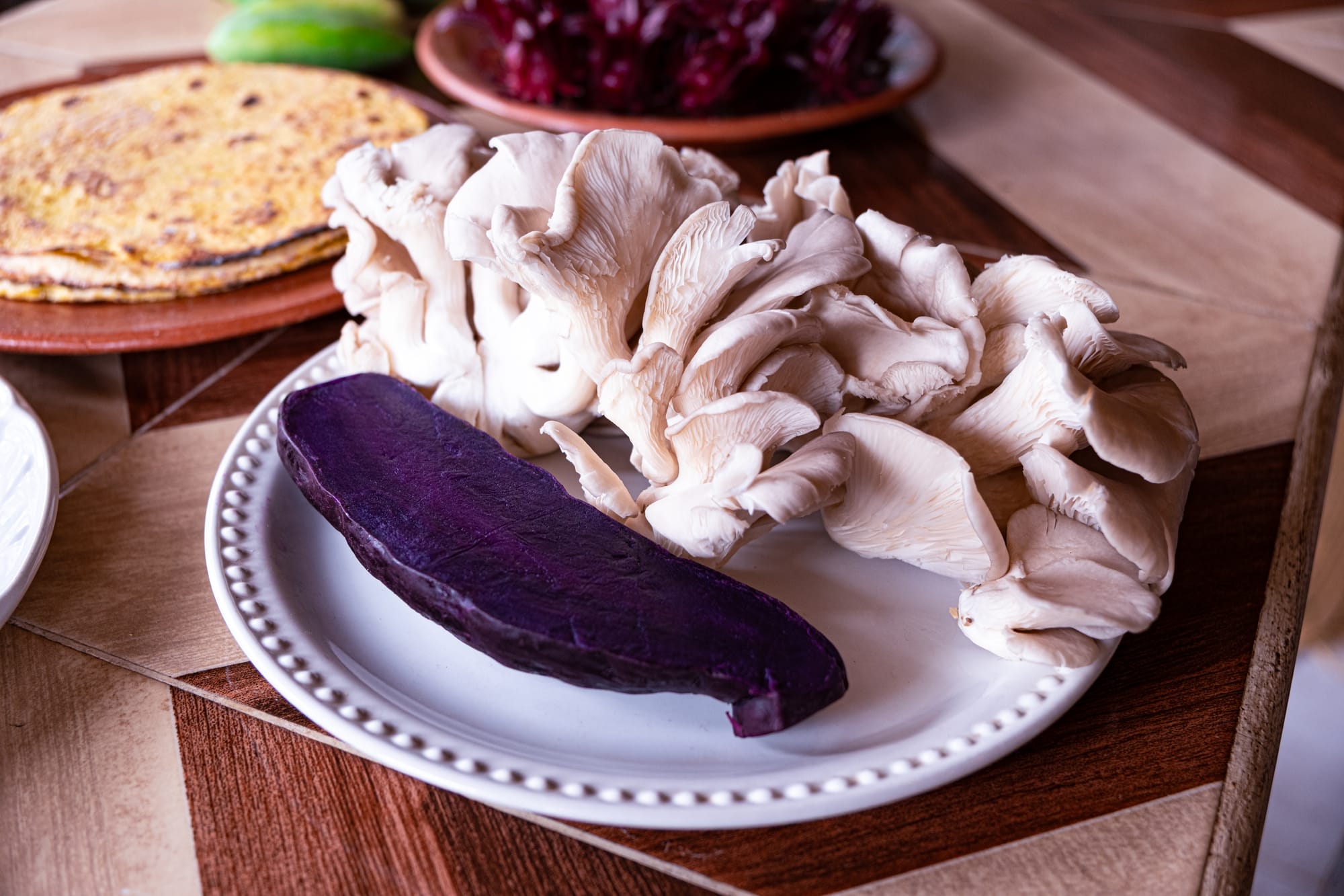 We followed Itzel through the aisles, gathering oyster mushrooms, chayote vines, spices, herbs, and fruits we had never tried before. Tamarillos that were tart and bright, somewhere between tomato and citrus. Banana passionfruit with its gentle perfume. Beans in deep shades of purple.