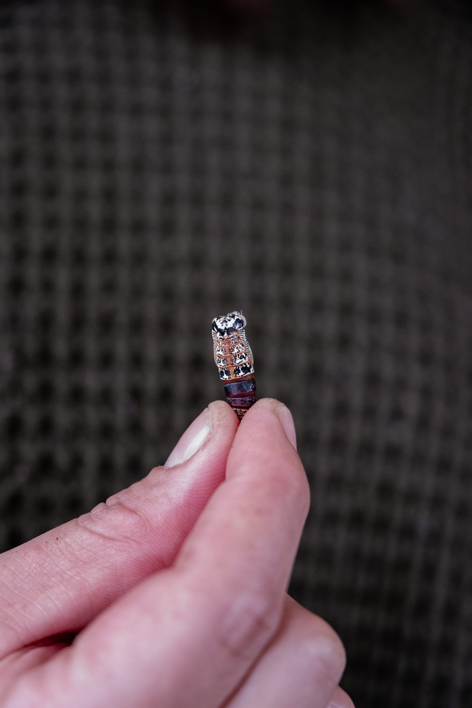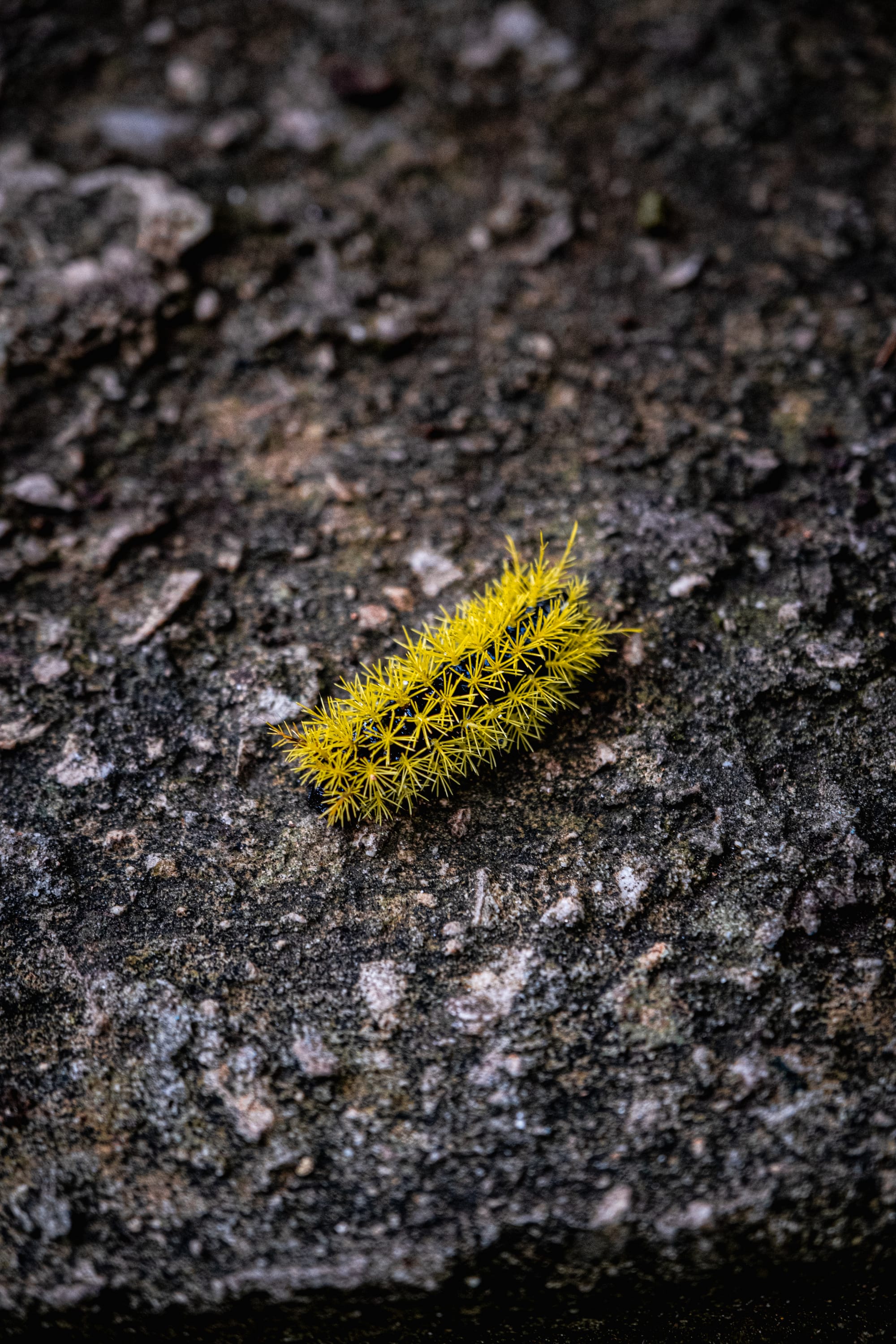 Small details from the mountain path, a soft pink bloom and a bright caterpillar catching the light