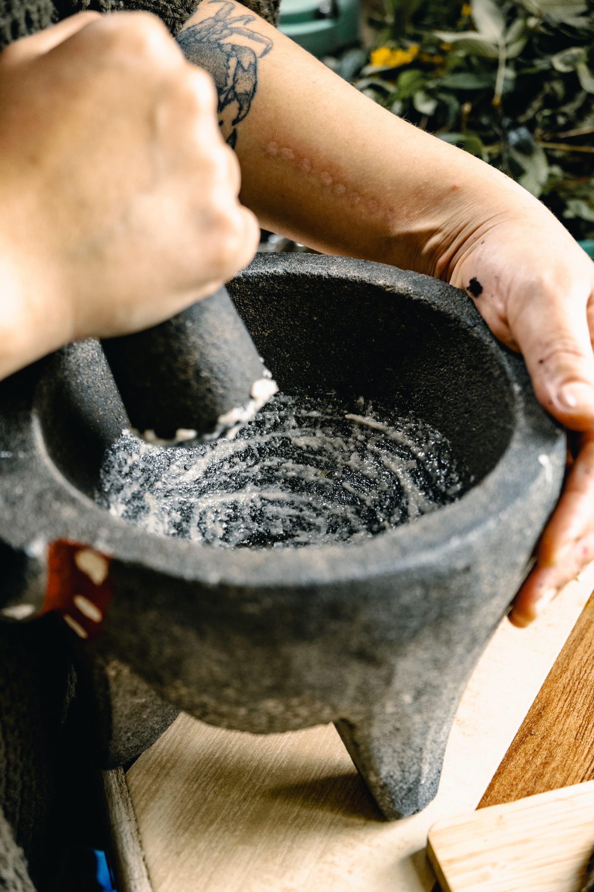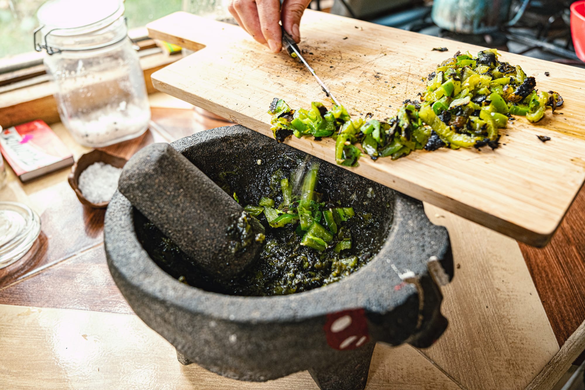 The scent filled the room, smoky and bright. She then peeled several cloves of garlic and began to smash everything with a mortar and pestle.