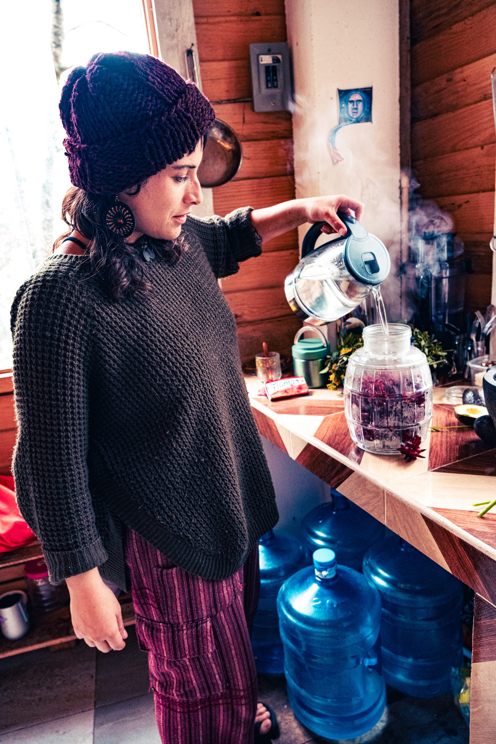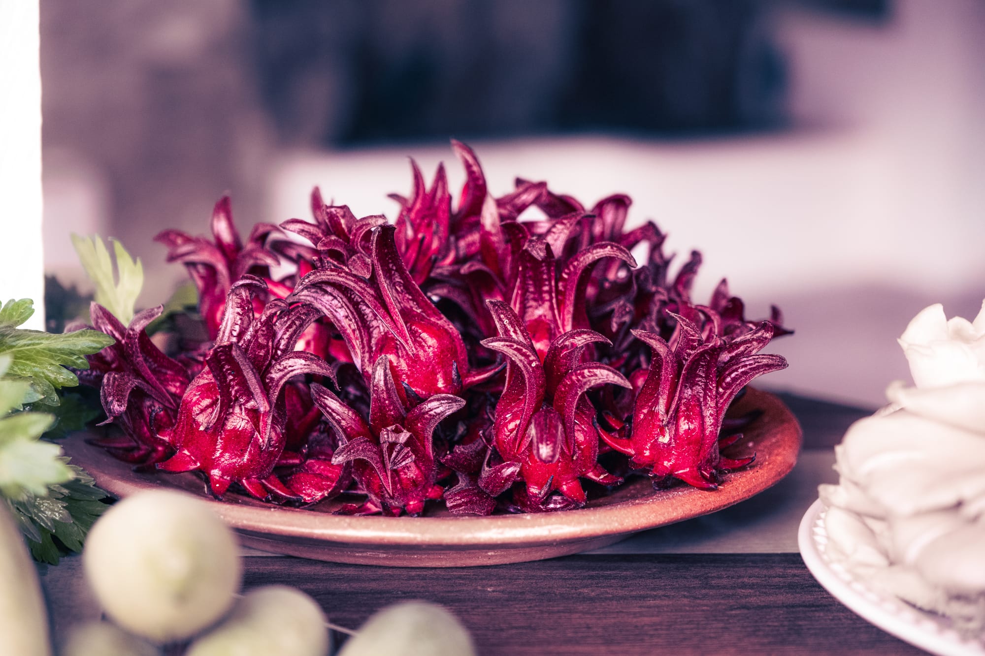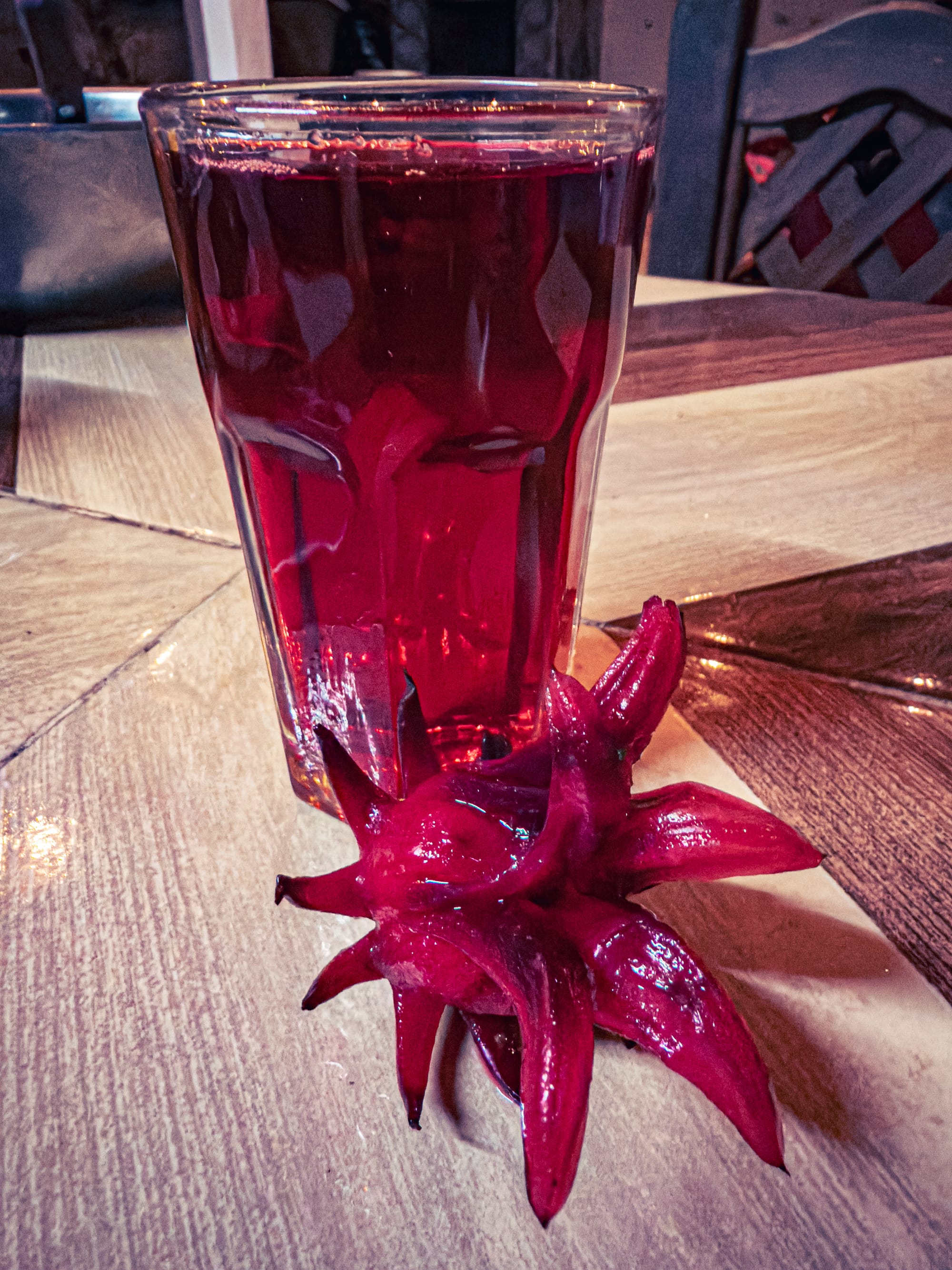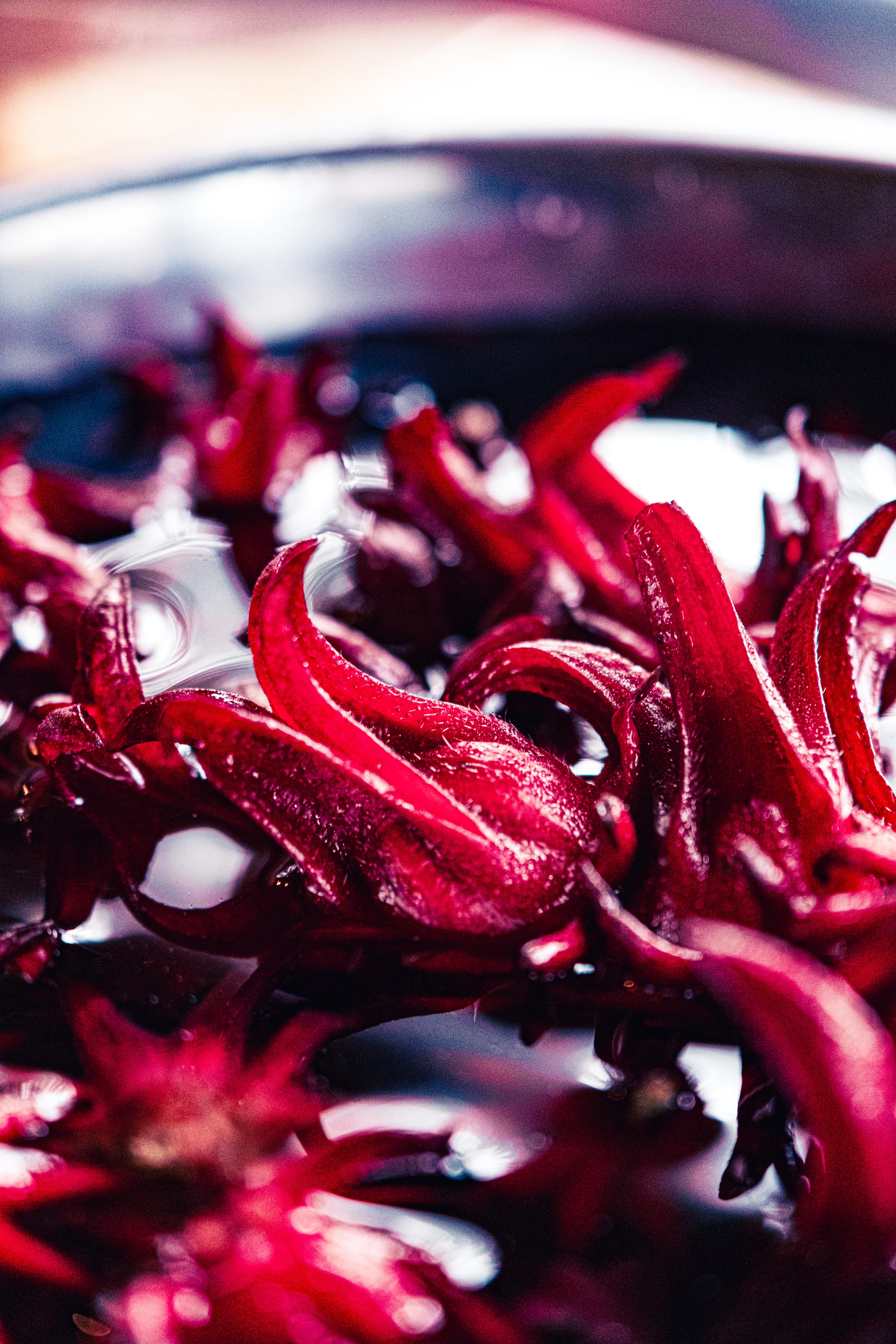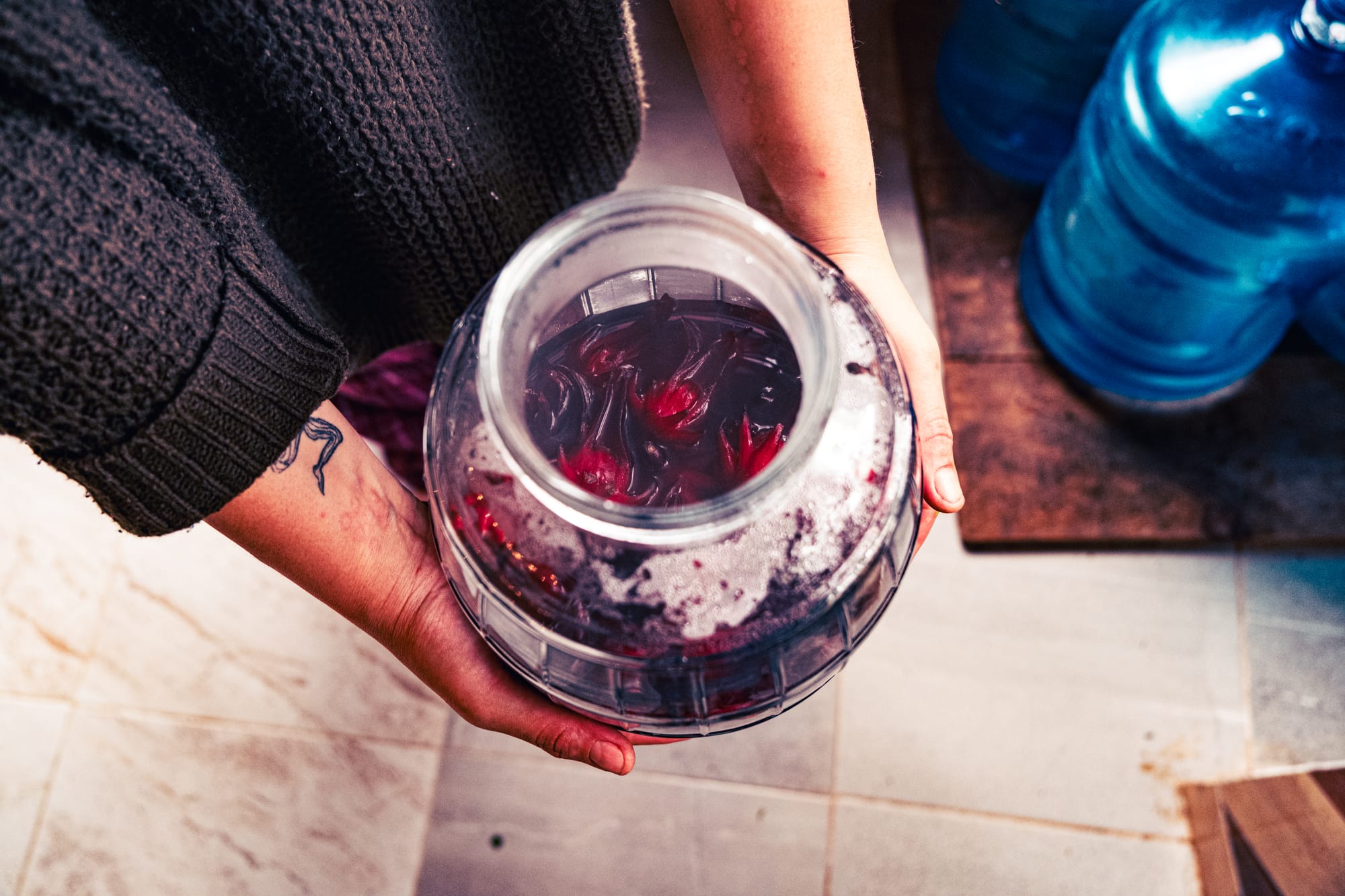 Next, we prepared hibiscus water next, pouring hot water over dried red petals in a glass jar. The color bloomed instantly, an infusion of deep crimson.