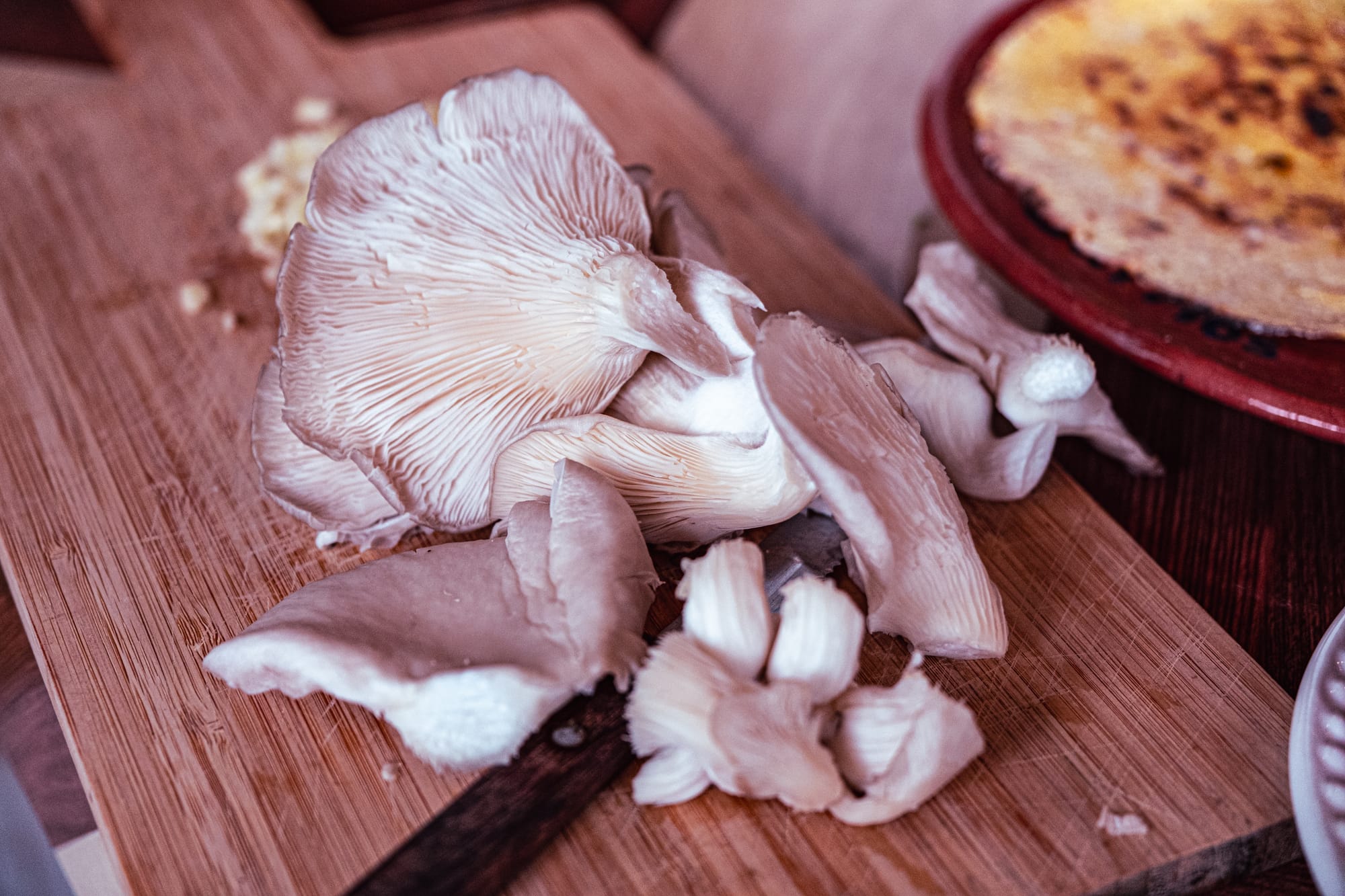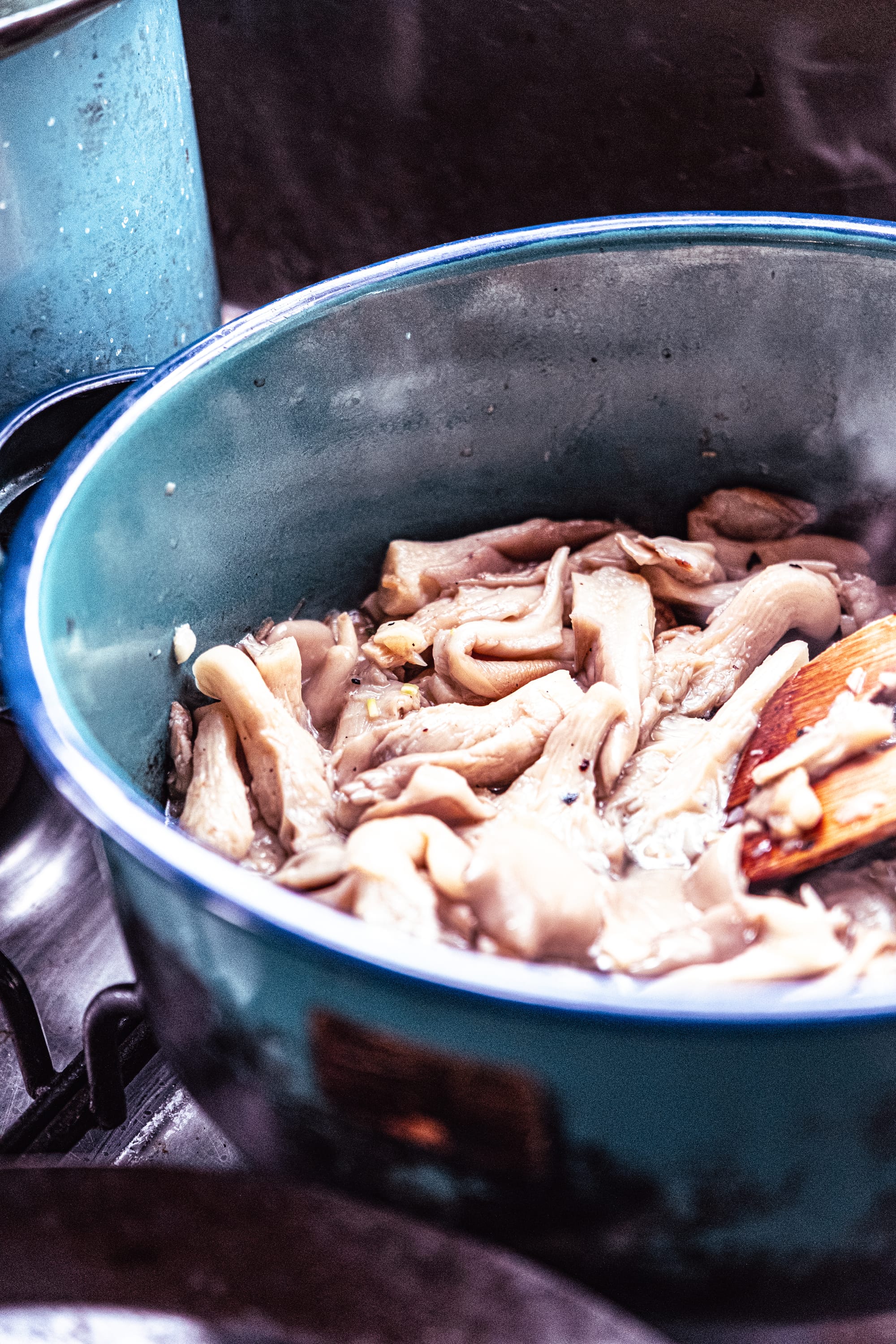 With the oyster mushrooms, we made a rich mole. Itzel fried the mushrooms until they browned, then combined them with a paste we had picked up that morning. The mole turned glossy and fragrant, bitter and sweet all at once.