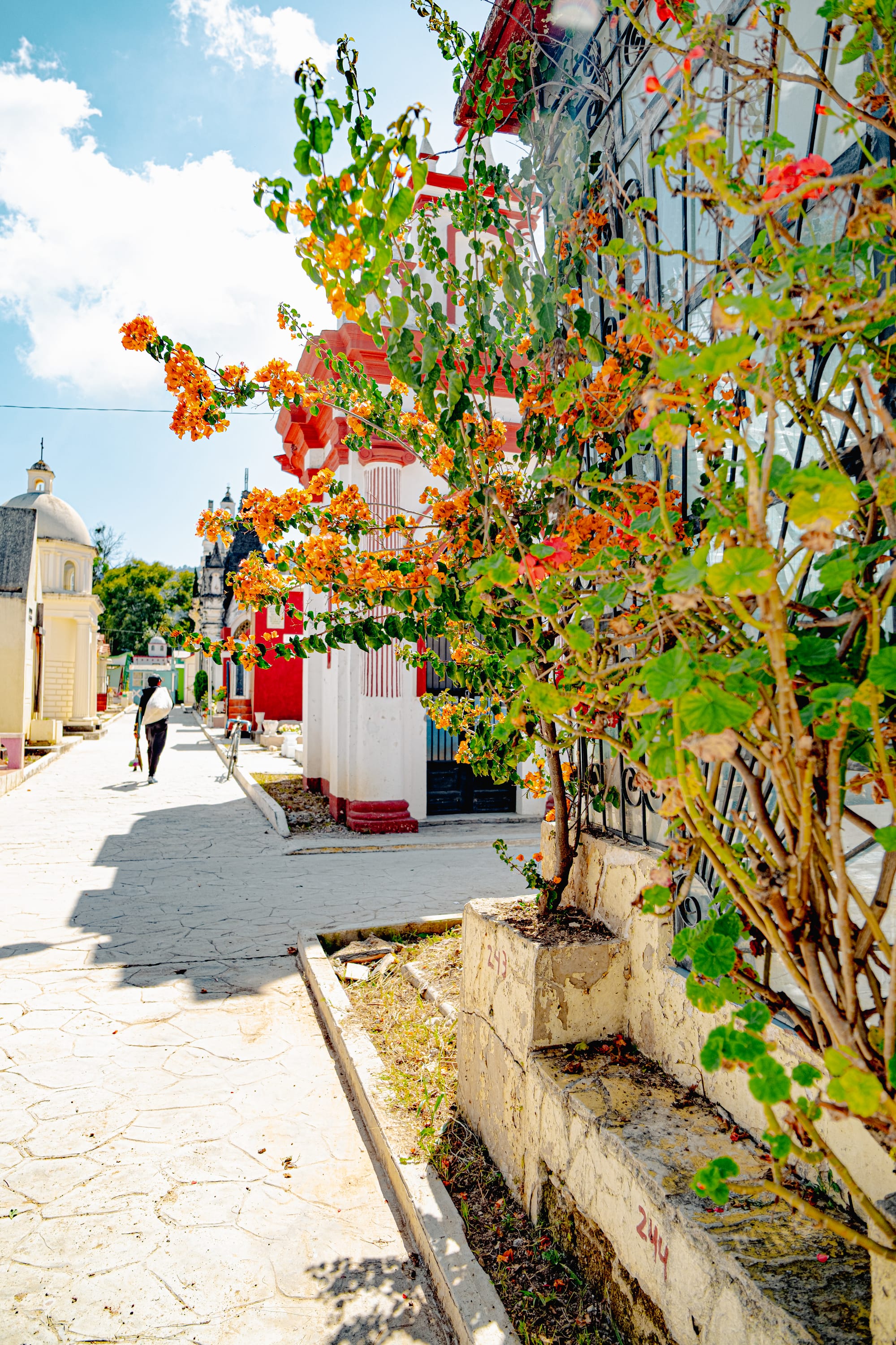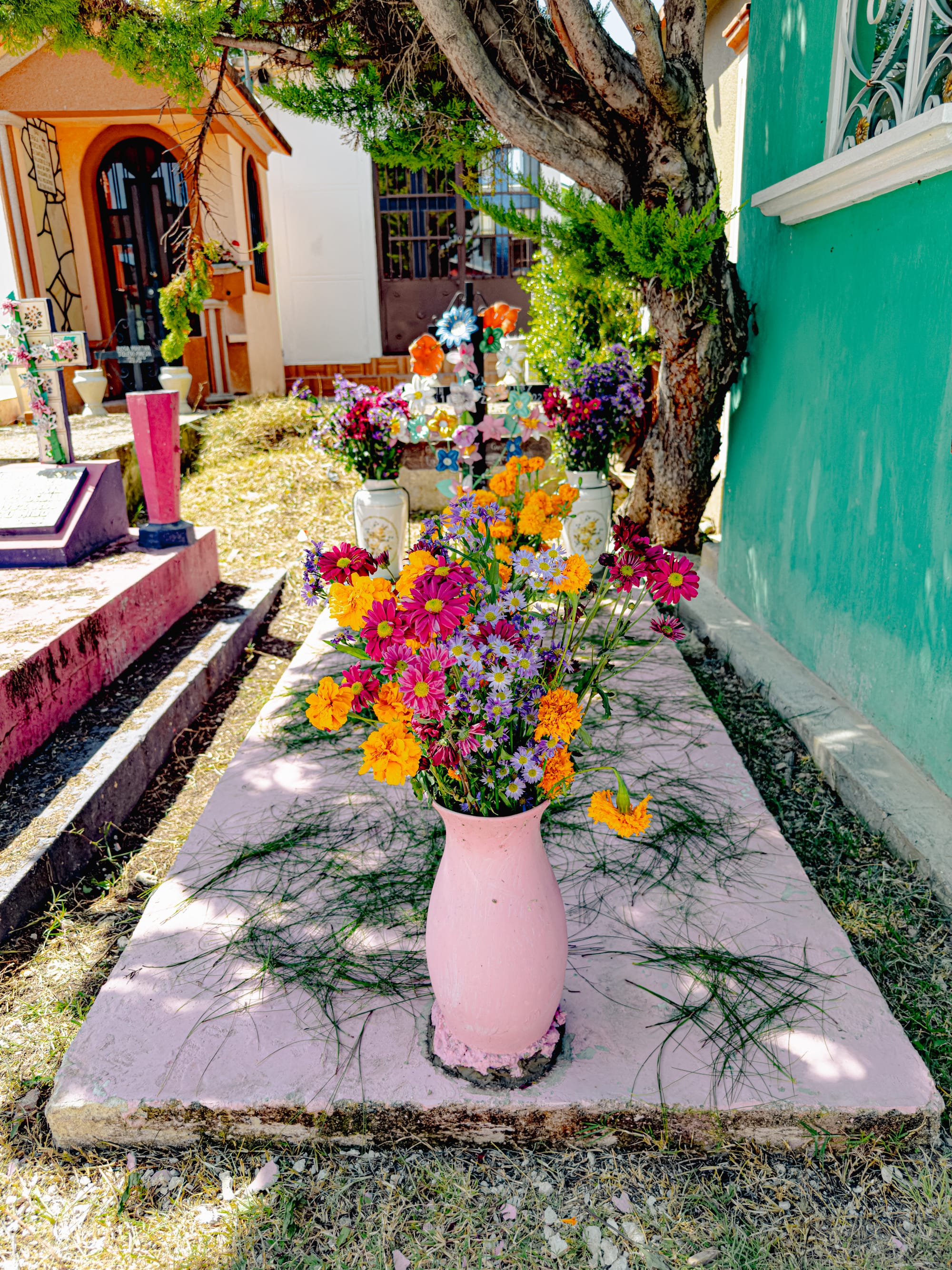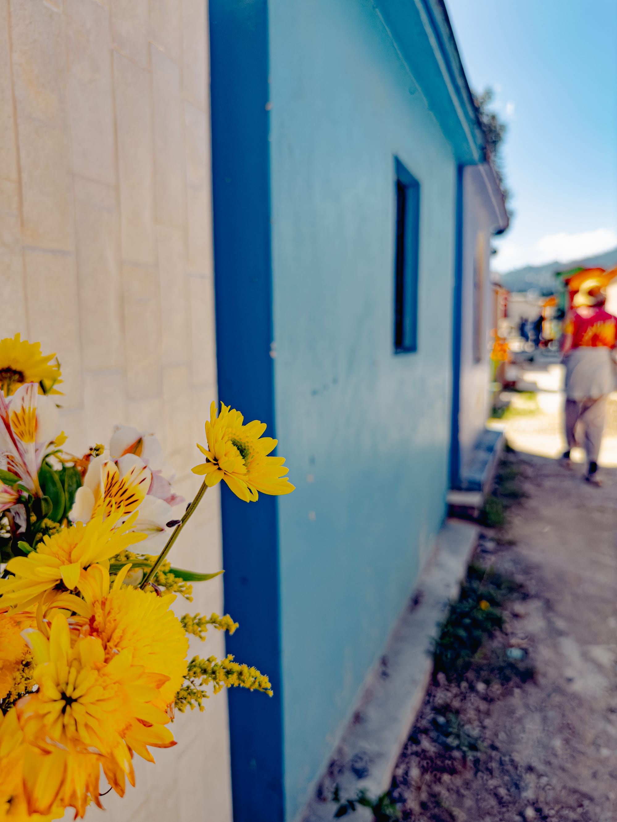 The walls are layered with years of repainting. Color sits upon color: lavender over blue, yellow over white. Even decay has its beauty—paint peeling in delicate sheets, ivy creeping up from the base of tombs. And everywhere, flowers. Marigolds—known locally as cempasúchil, the flower of the dead—spill from vases, their orange petals blazing against the cement. In Maya belief, their scent and color guide spirits back to the world of the living.