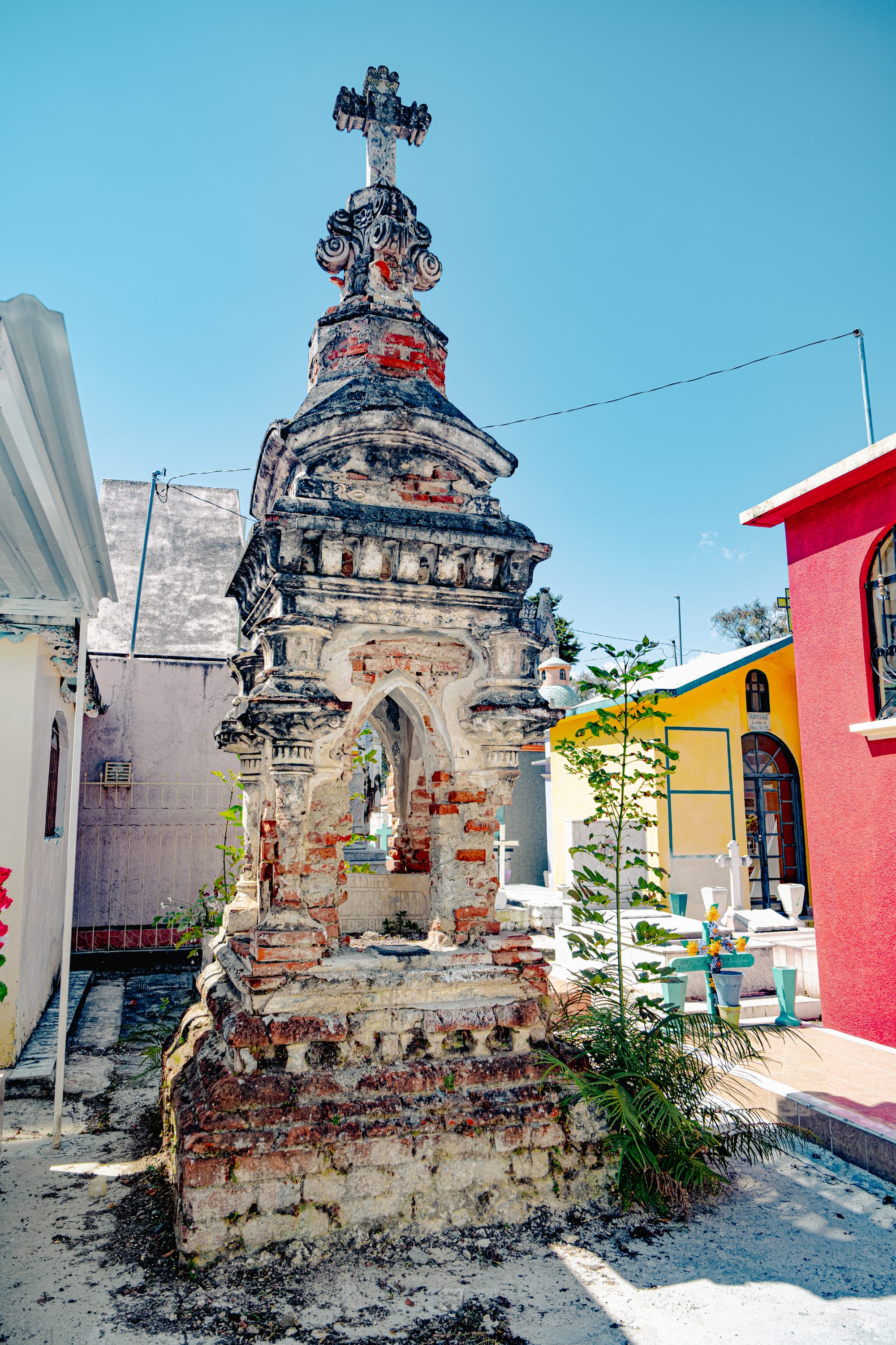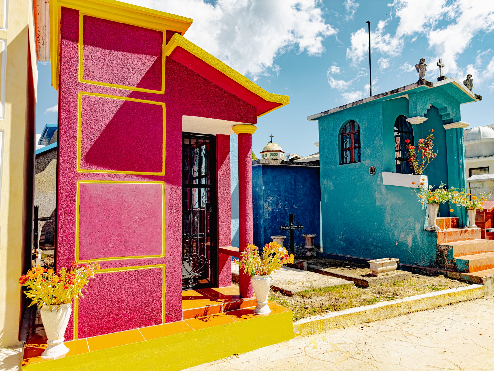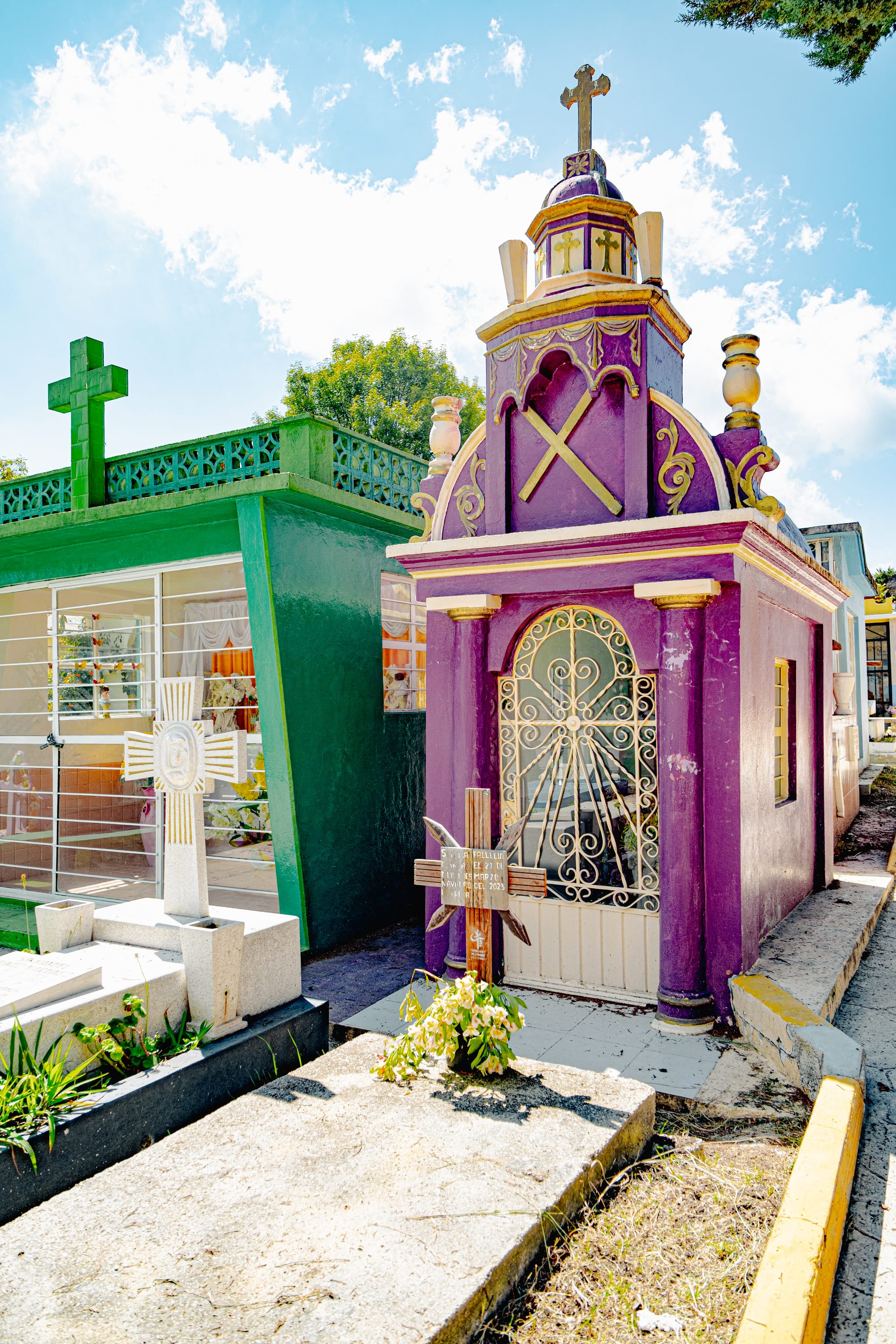 The walls are layered with years of repainting. Color sits upon color: lavender over blue, yellow over white. Even decay has its beauty—paint peeling in delicate sheets, ivy creeping up from the base of tombs. And everywhere, flowers. Marigolds—known locally as cempasúchil, the flower of the dead—spill from vases, their orange petals blazing against the cement. In Maya belief, their scent and color guide spirits back to the world of the living.