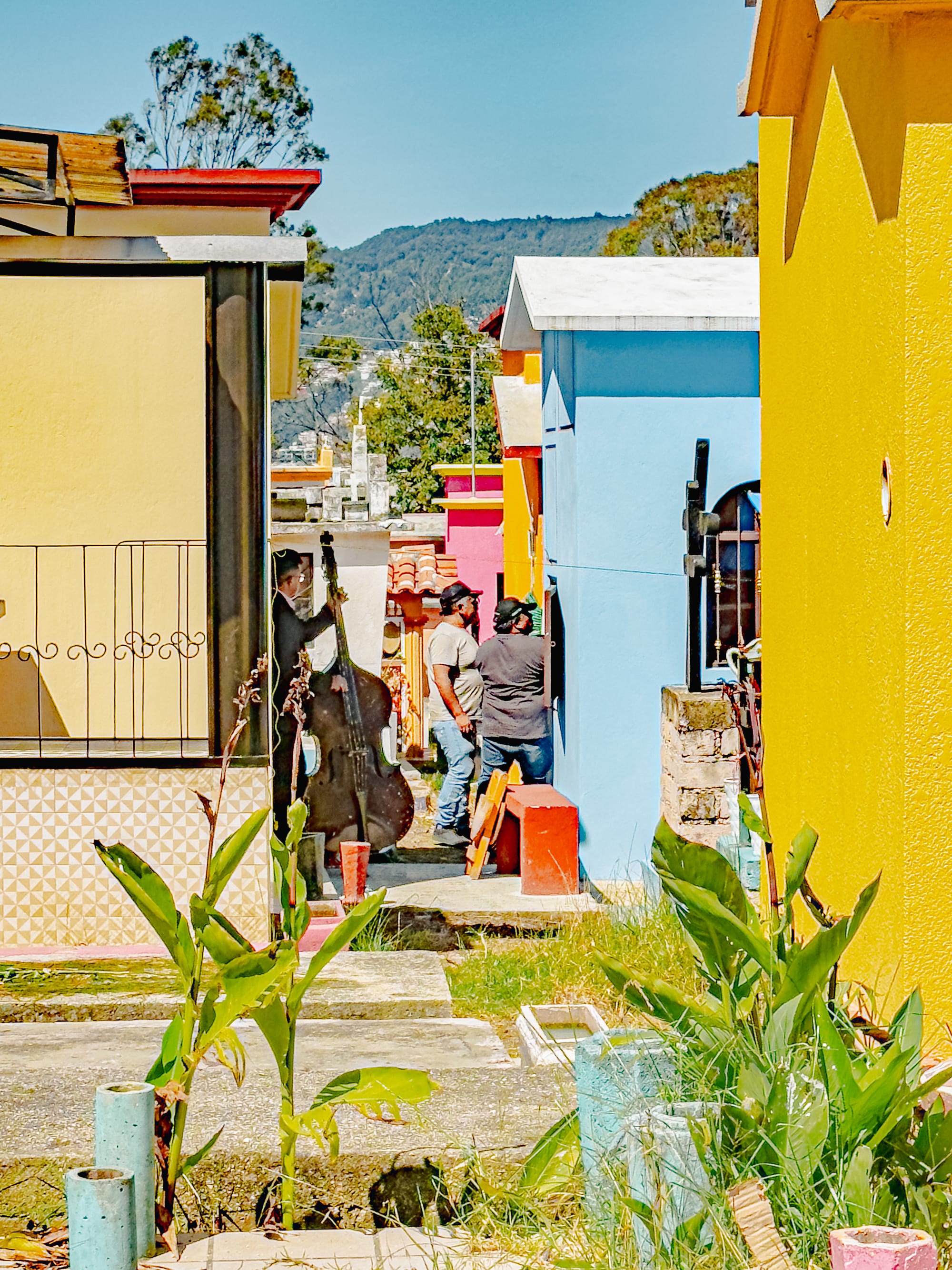 We passed a brass band tuning their instruments, preparing to play for a nearby family. The sounds of trumpets and drums rippled through the alleys, mingling with the smell of fresh paint and wax. It was deeply communal—as if the act of remembering the dead was just another way of being together.
