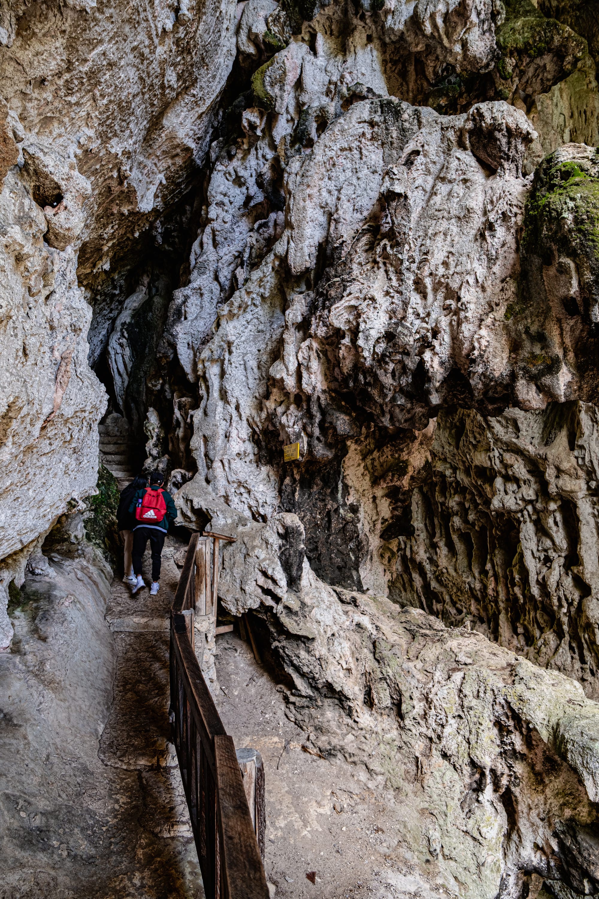 Stairs lead from one side of the arch up toward the caves—a short climb, but one that shifts the viewpoint quickly. Inside, the air cools noticeably, and the light narrows into small pockets shaped by the stone formations overhead.