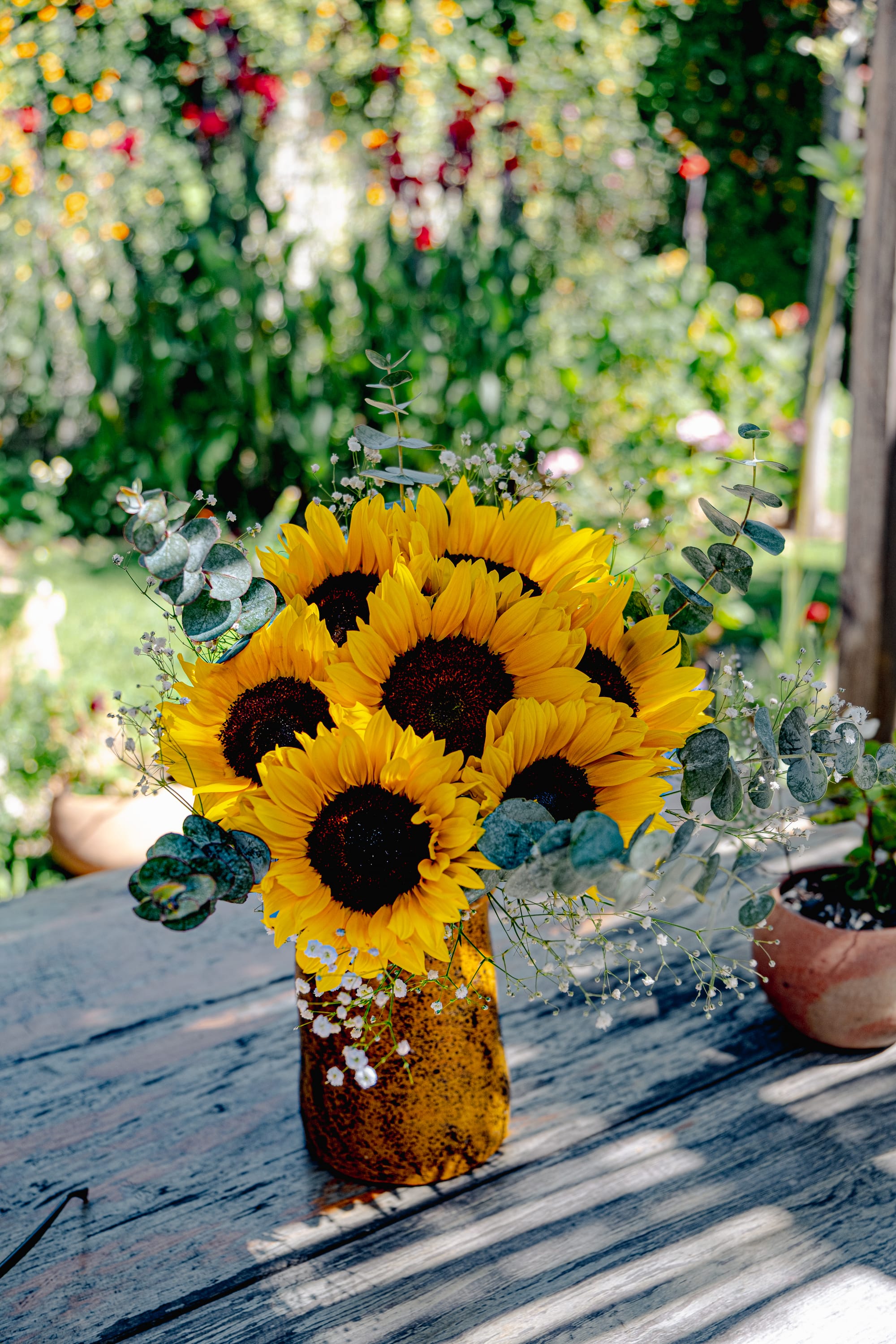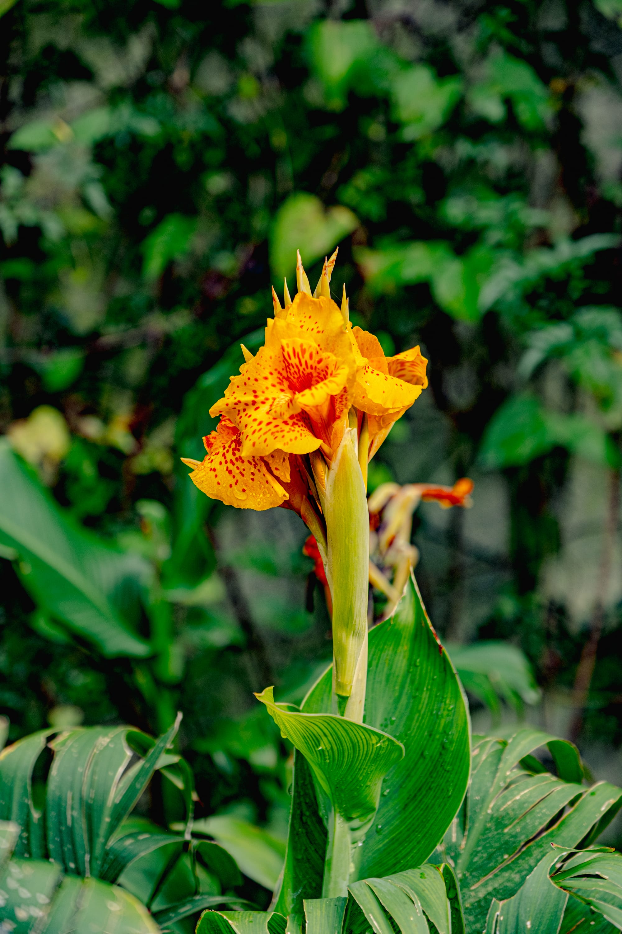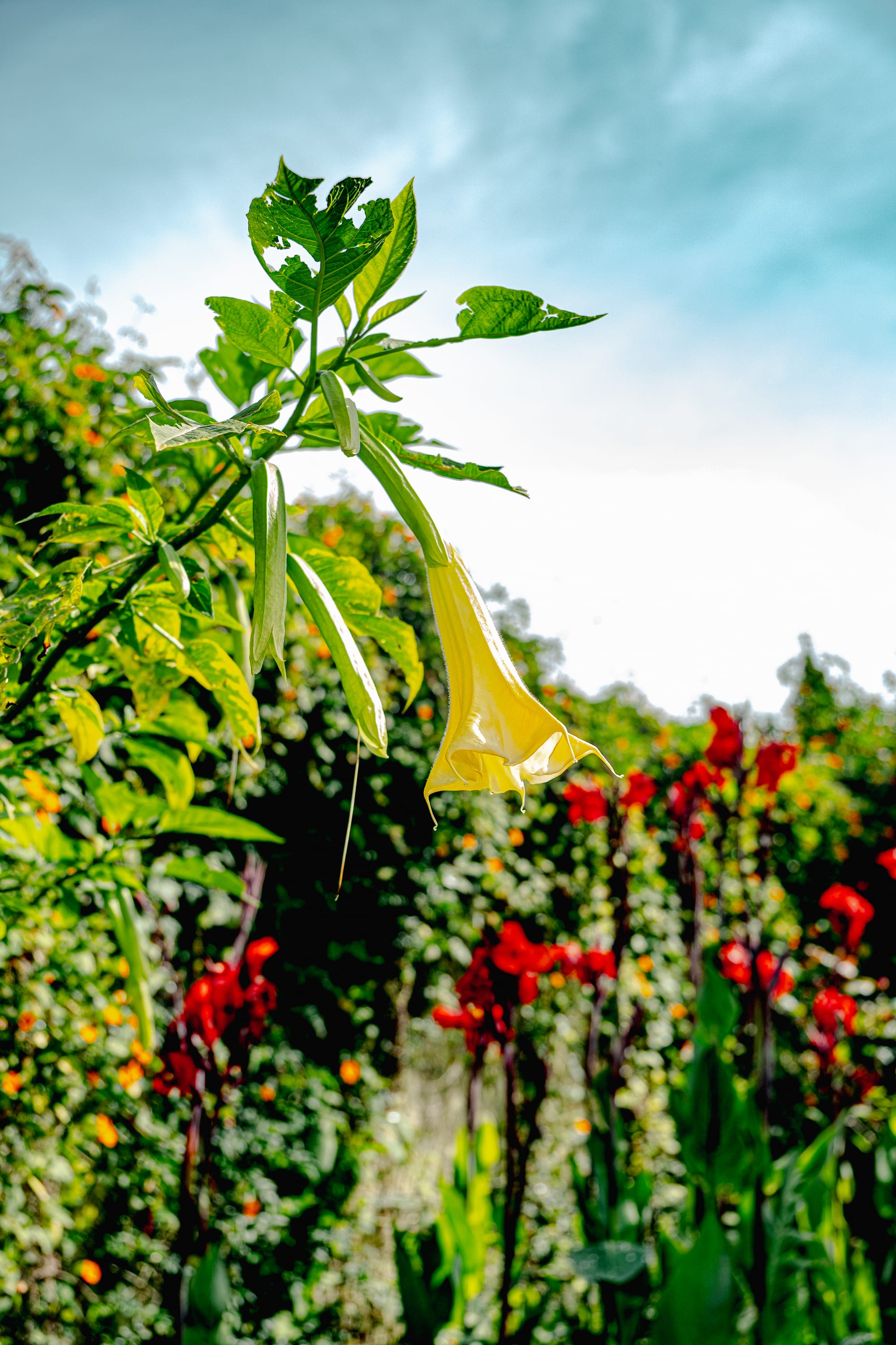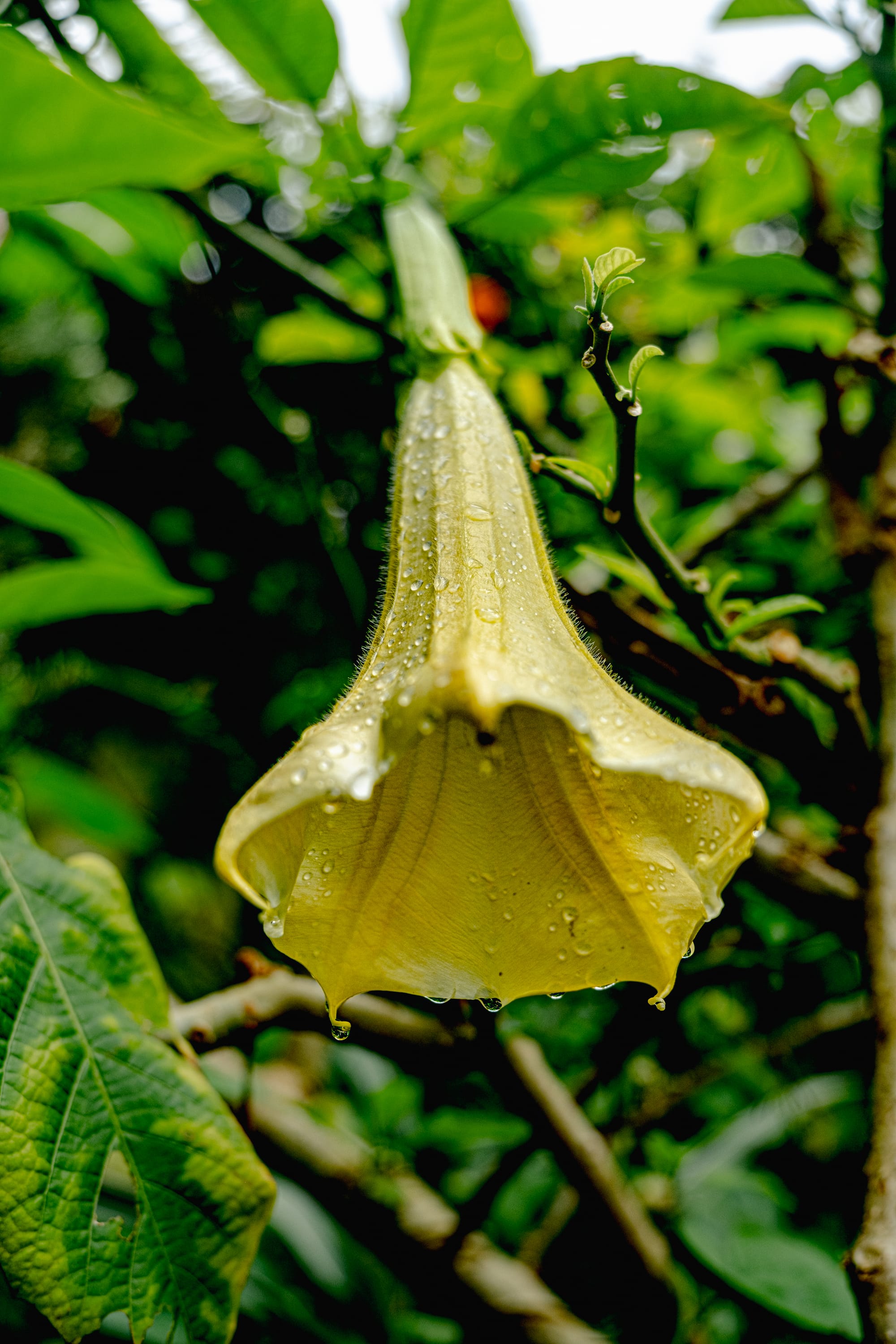 Yellow trumpet flowers alongside a small bird cooling off in the courtyard fountain