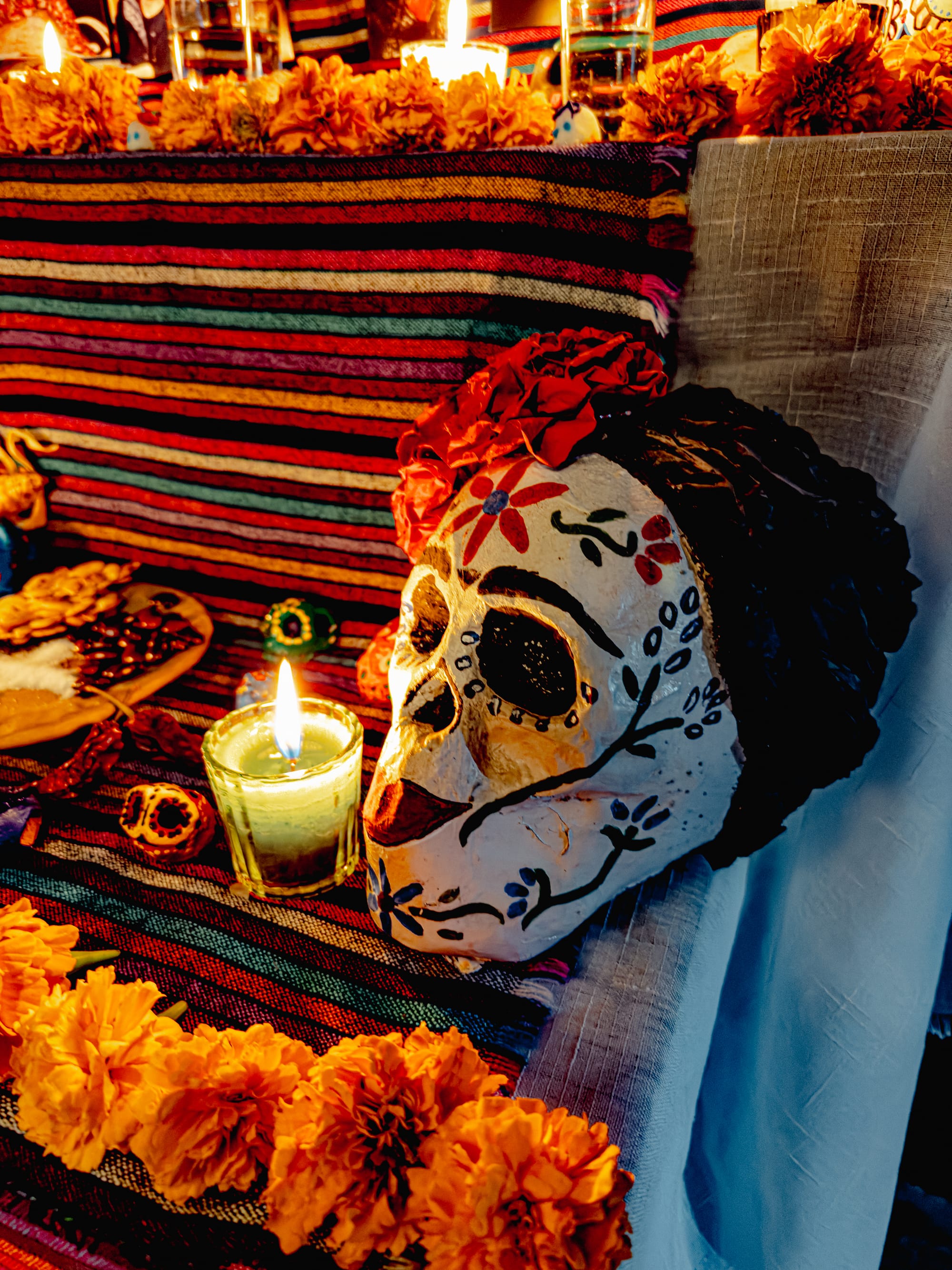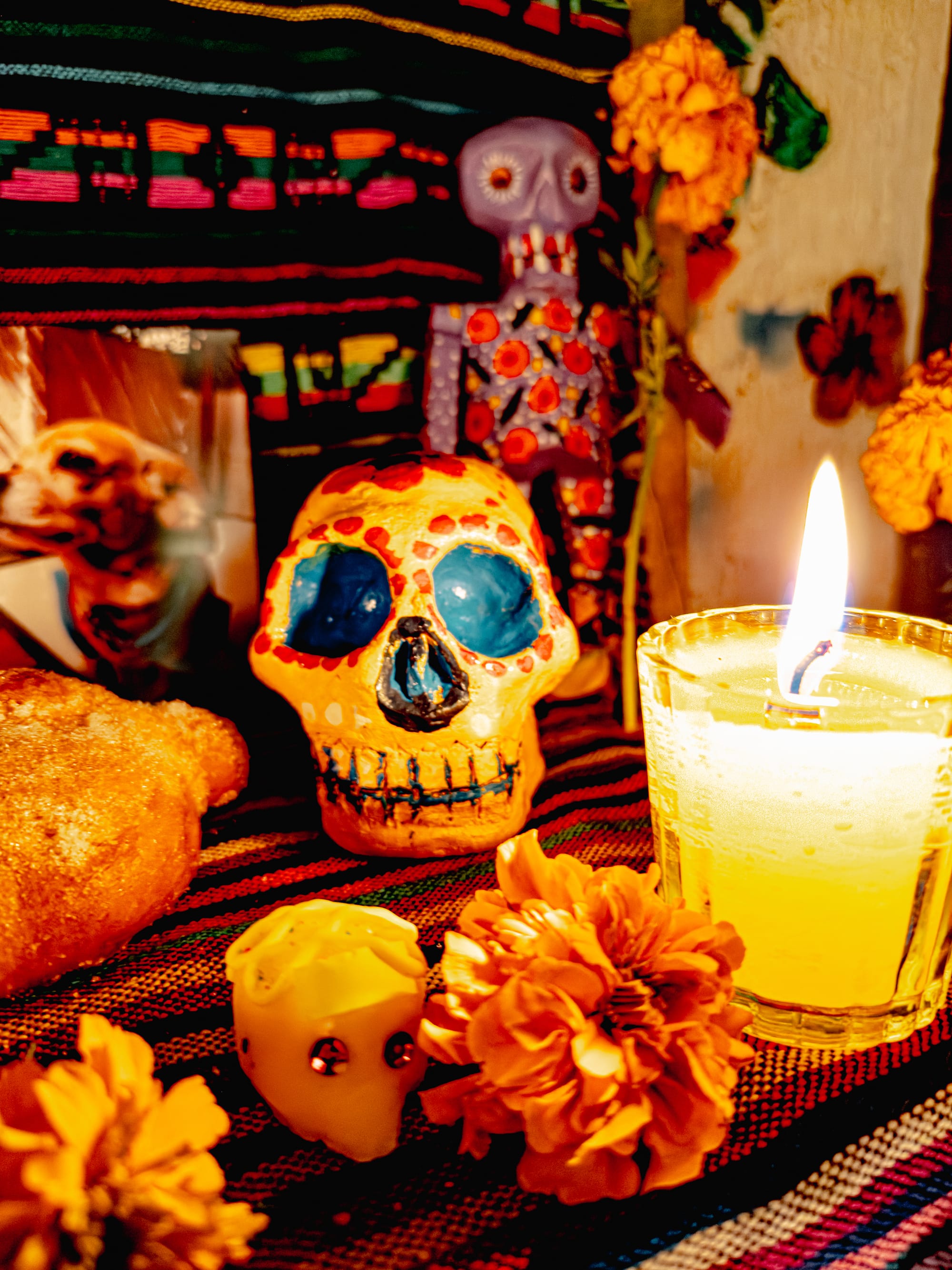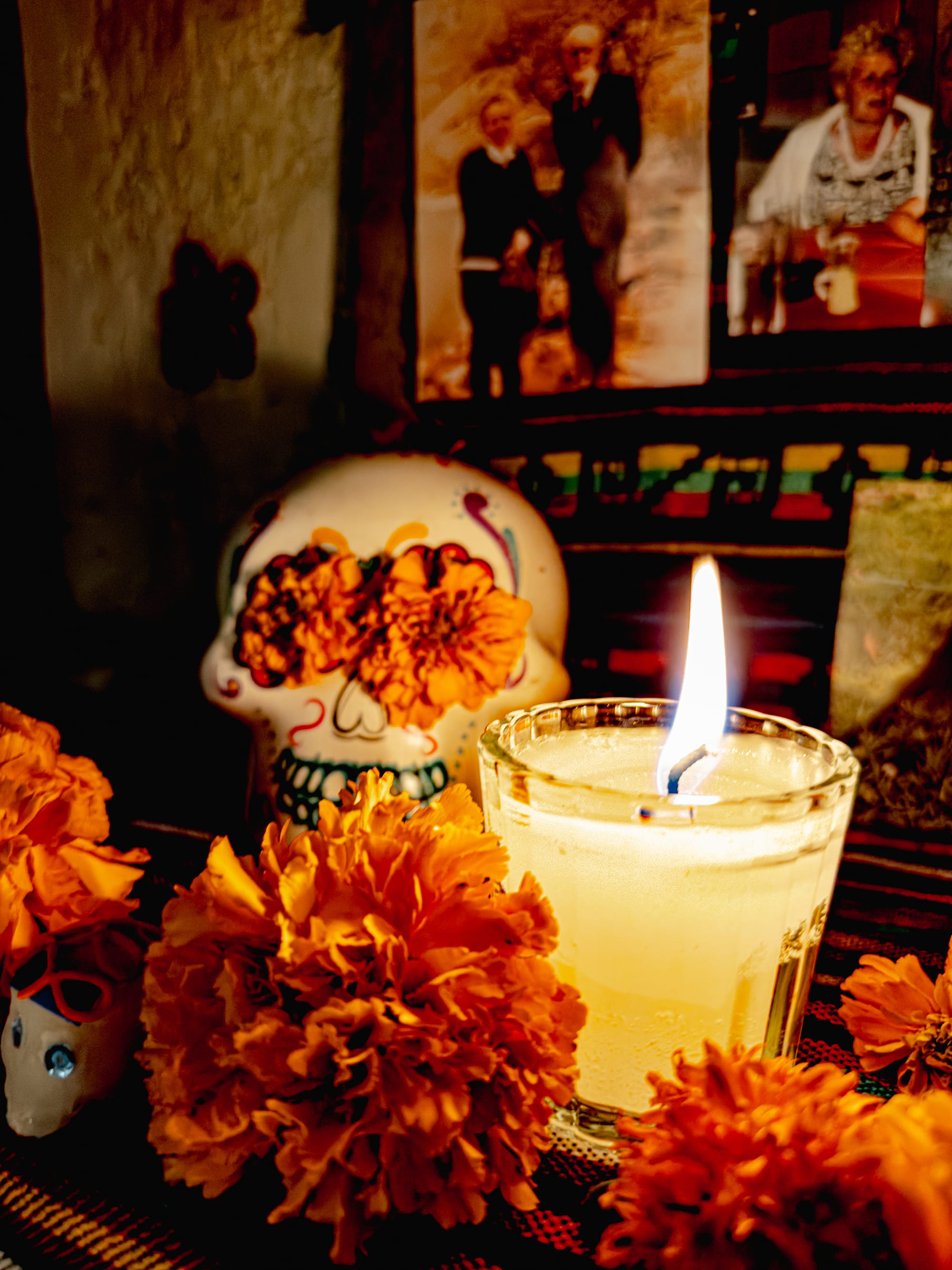 Skulls, flowers, and candlelight on the ofrenda