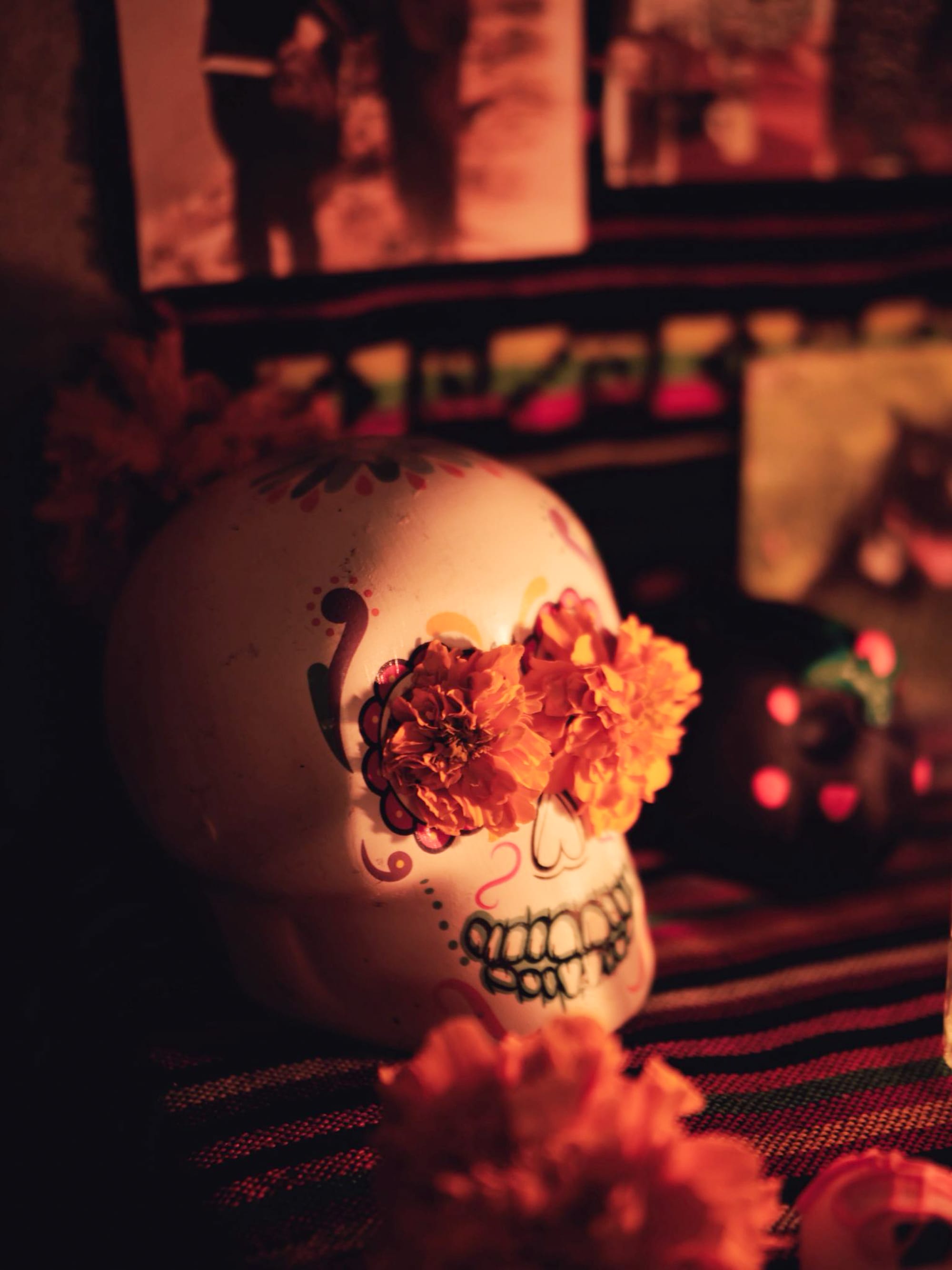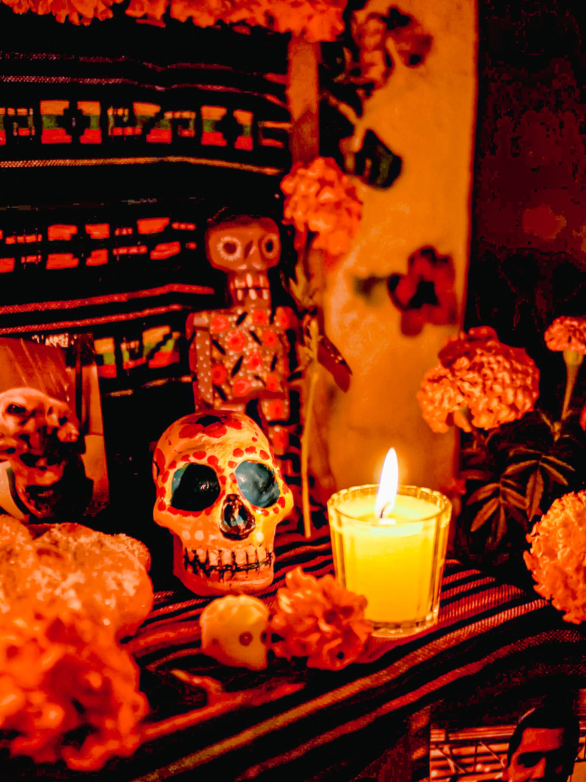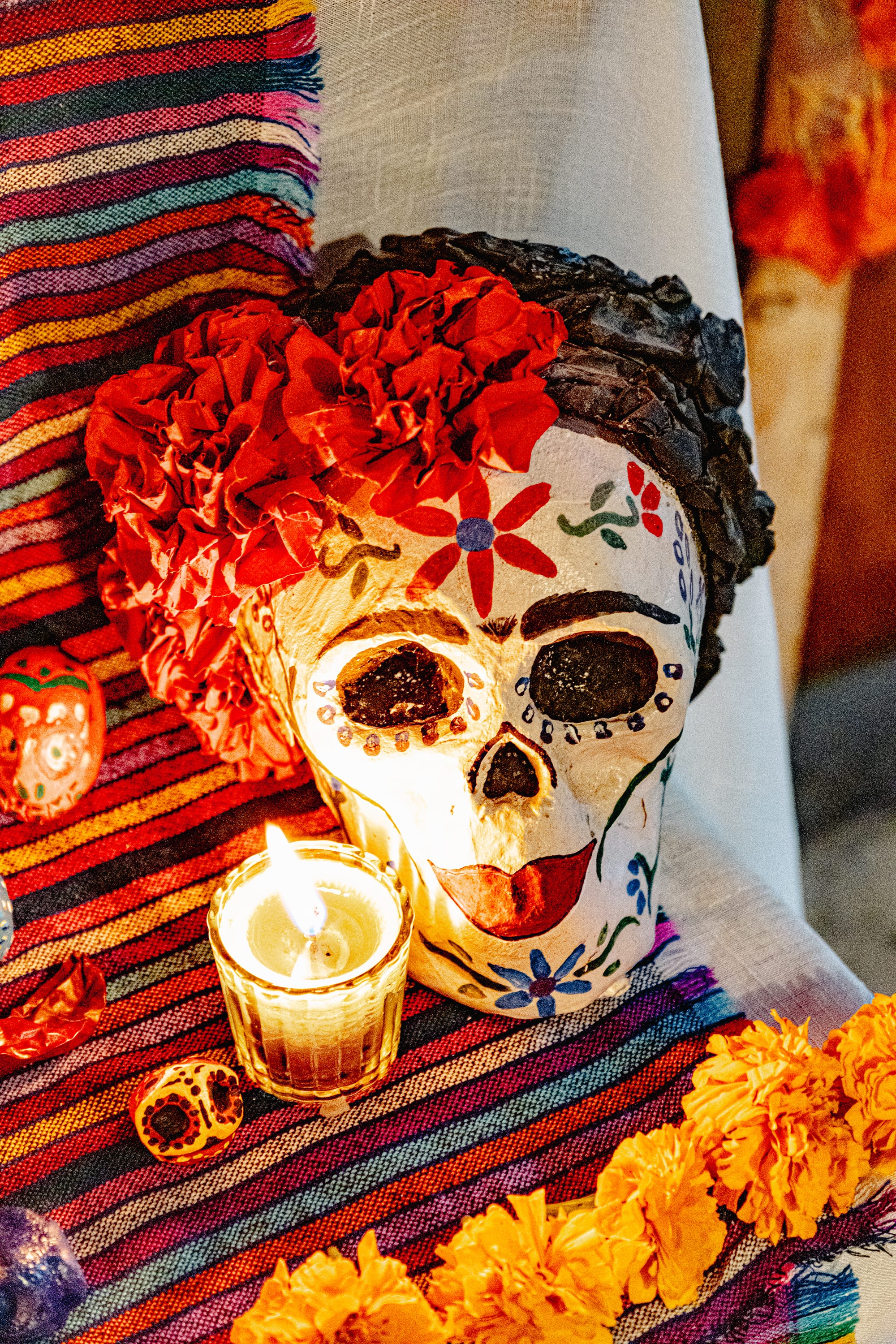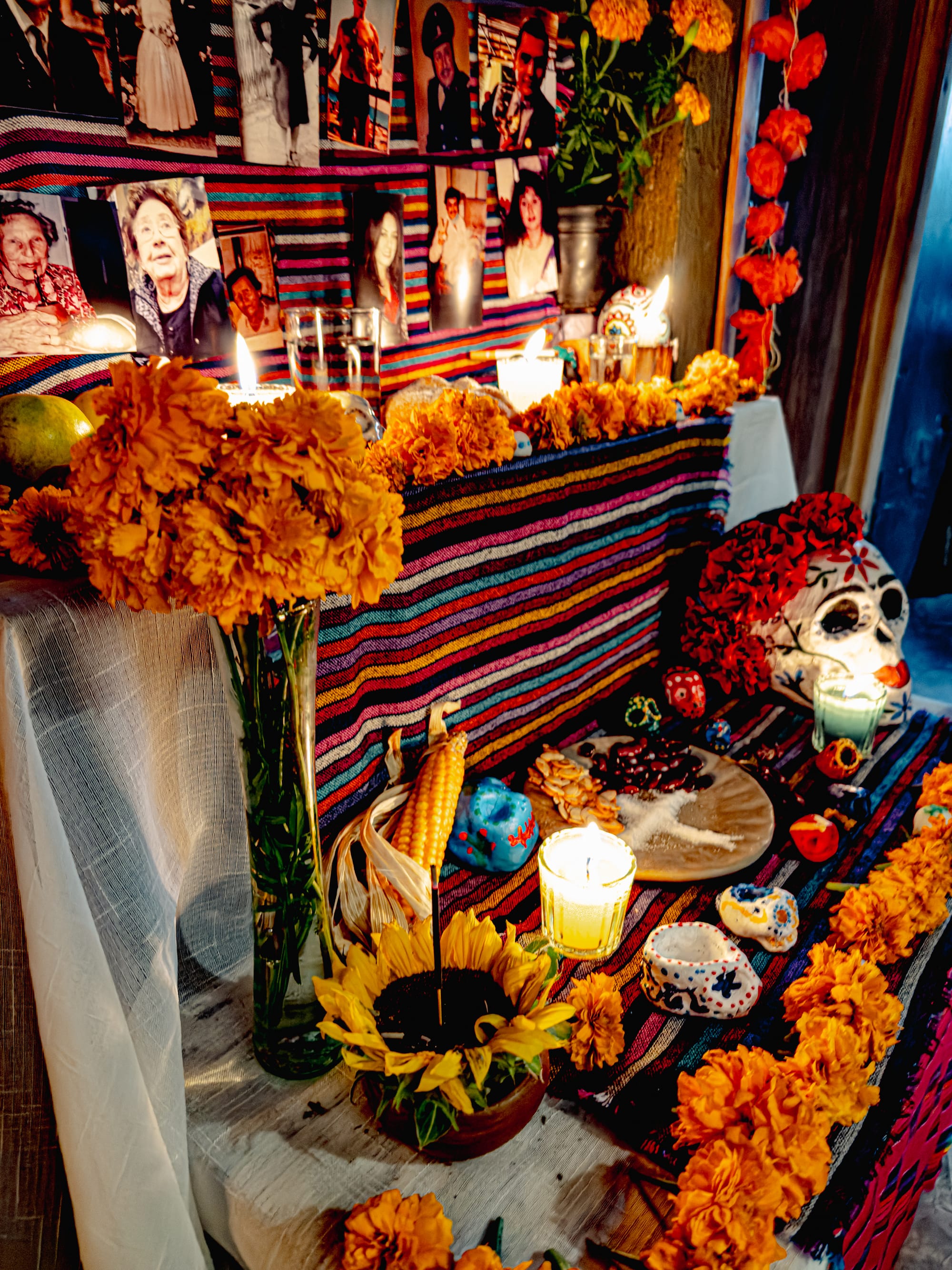 Skulls, flowers, and candlelight on the ofrenda