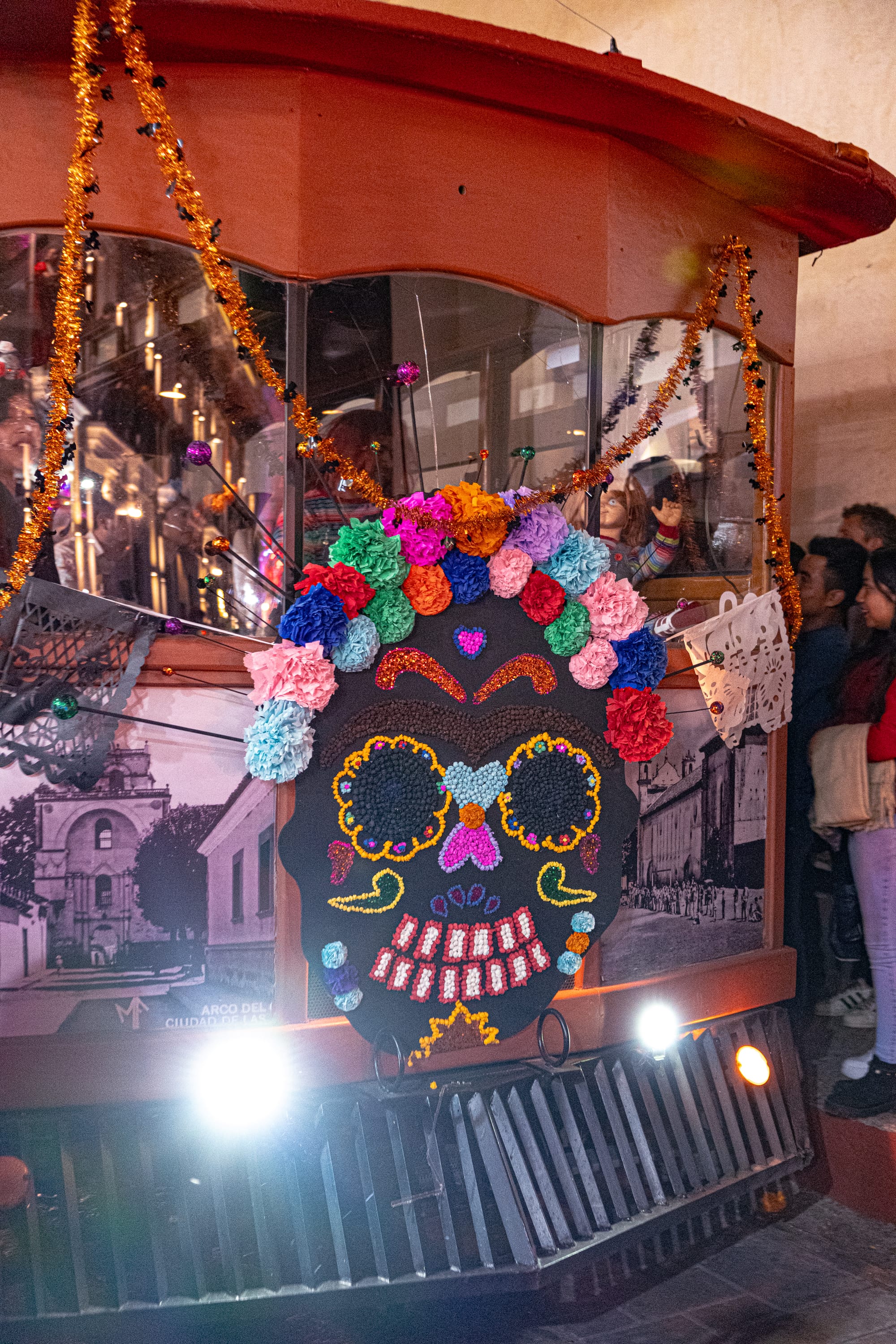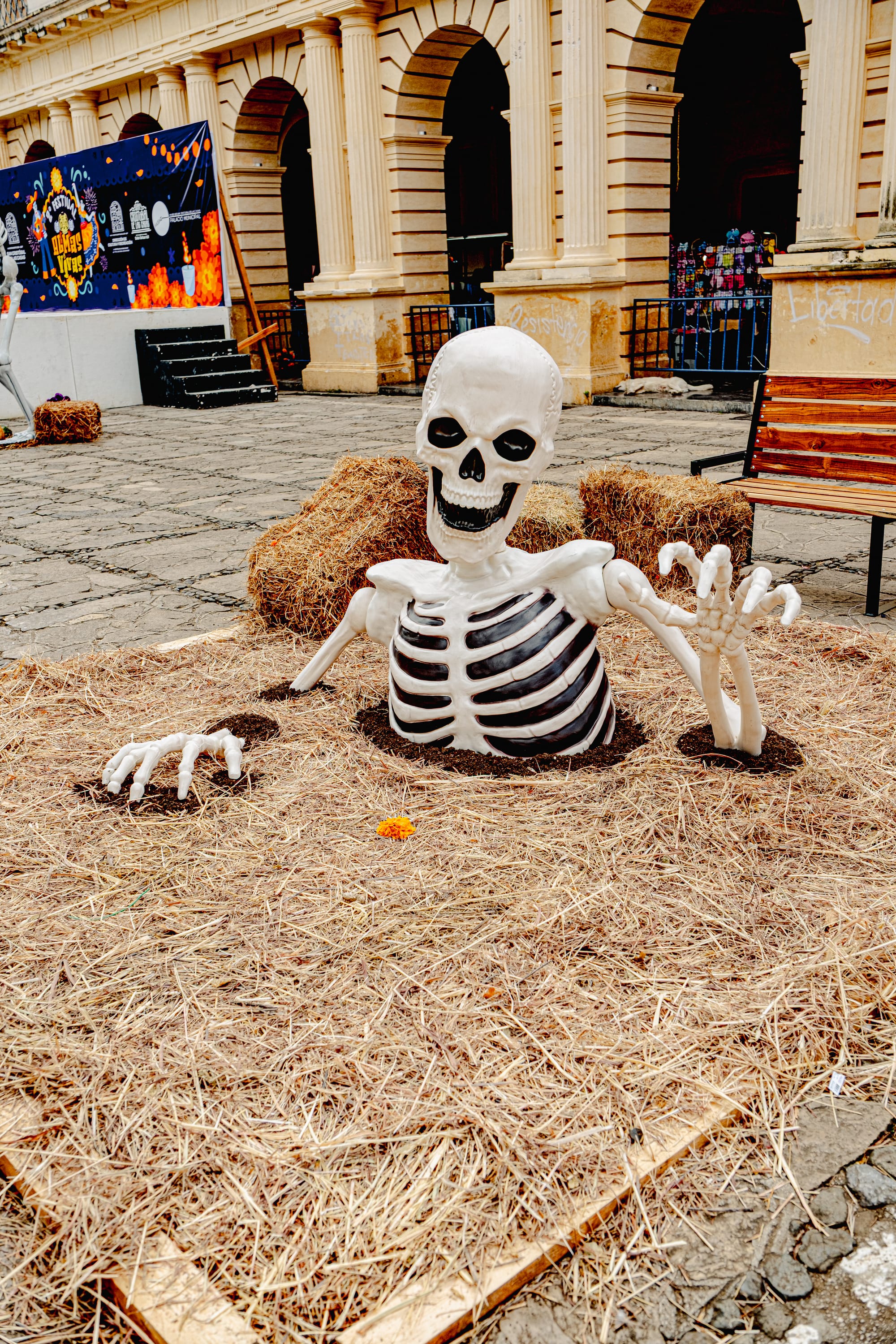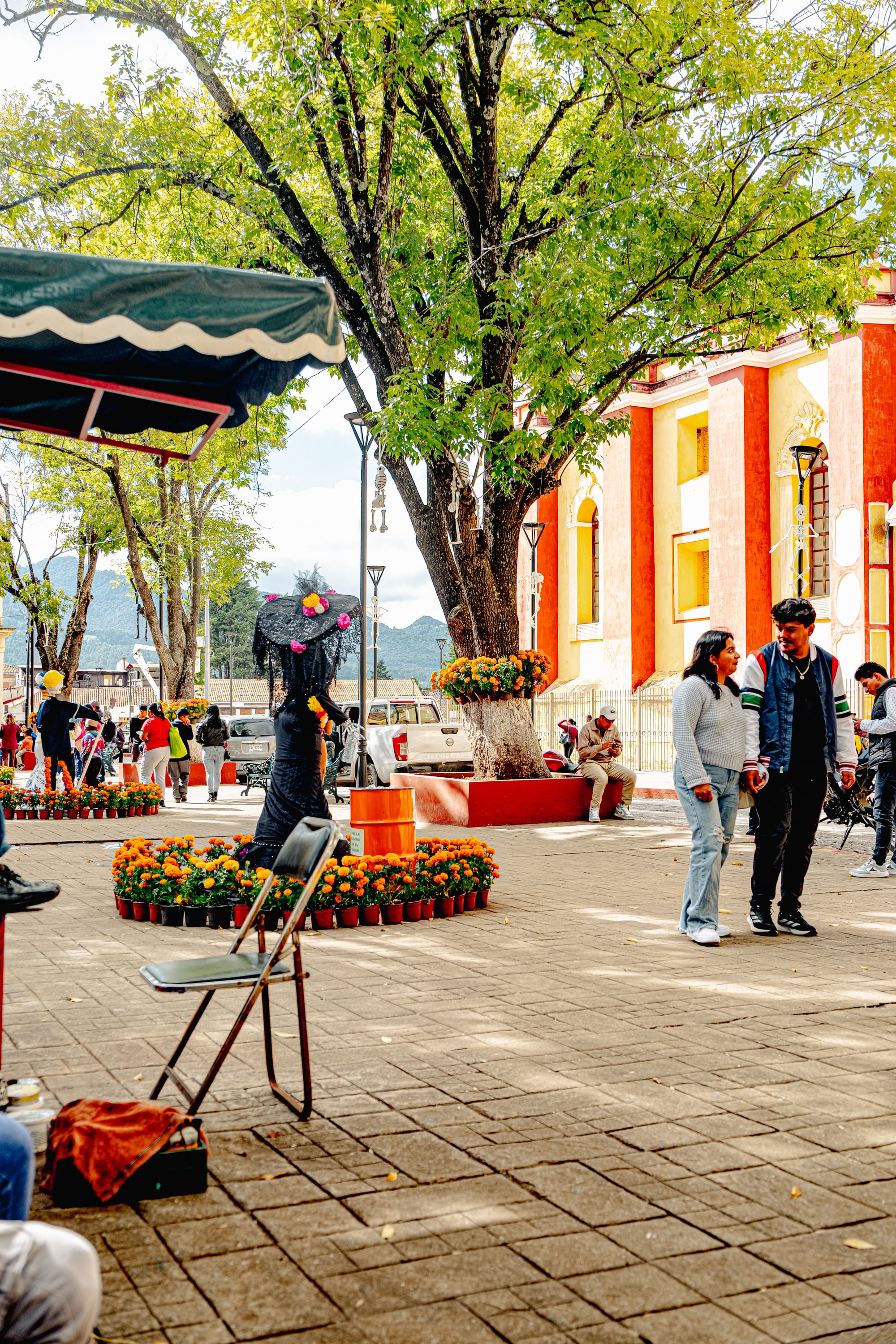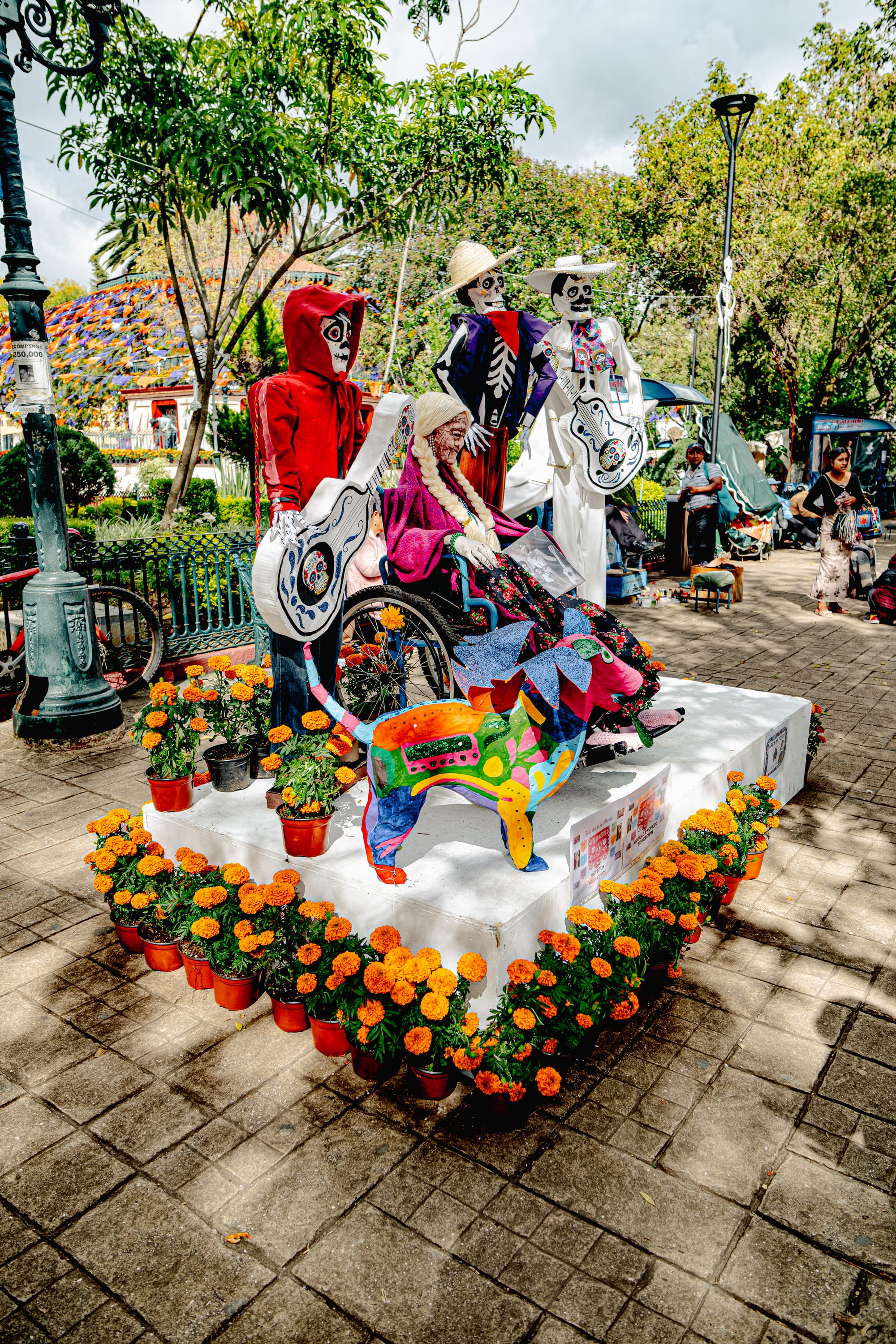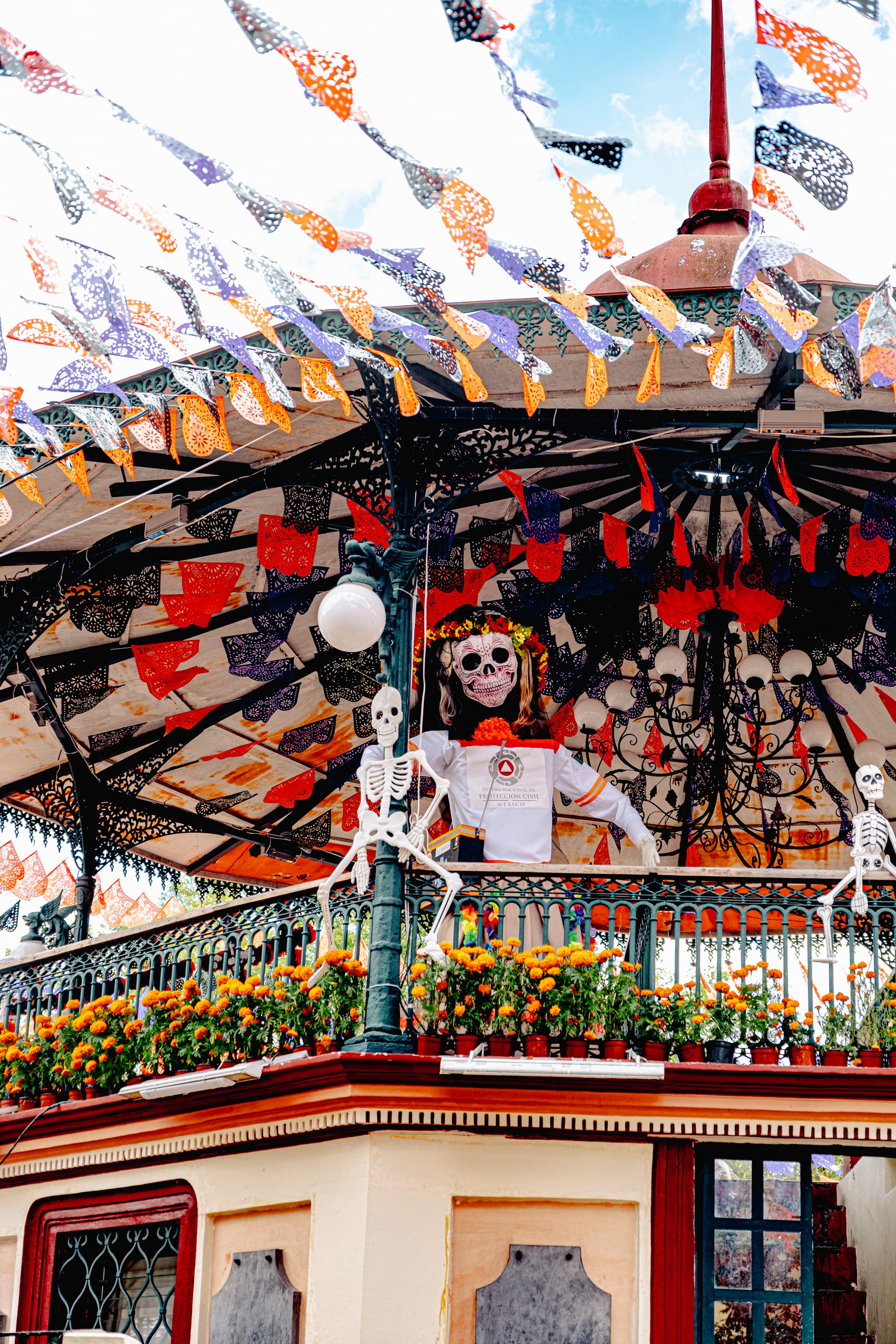 Skeletons, papel picado, and marigolds animating the plaza