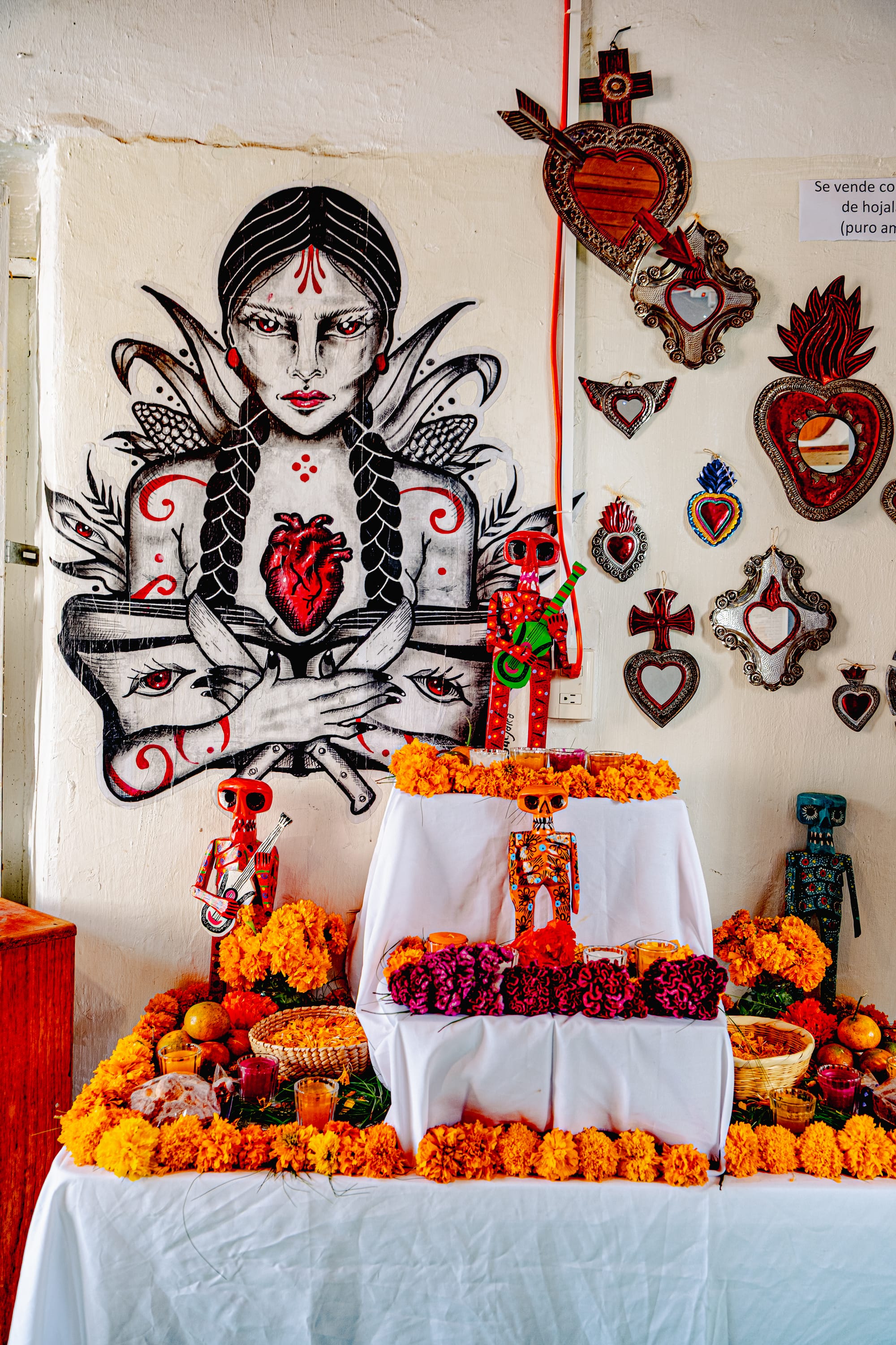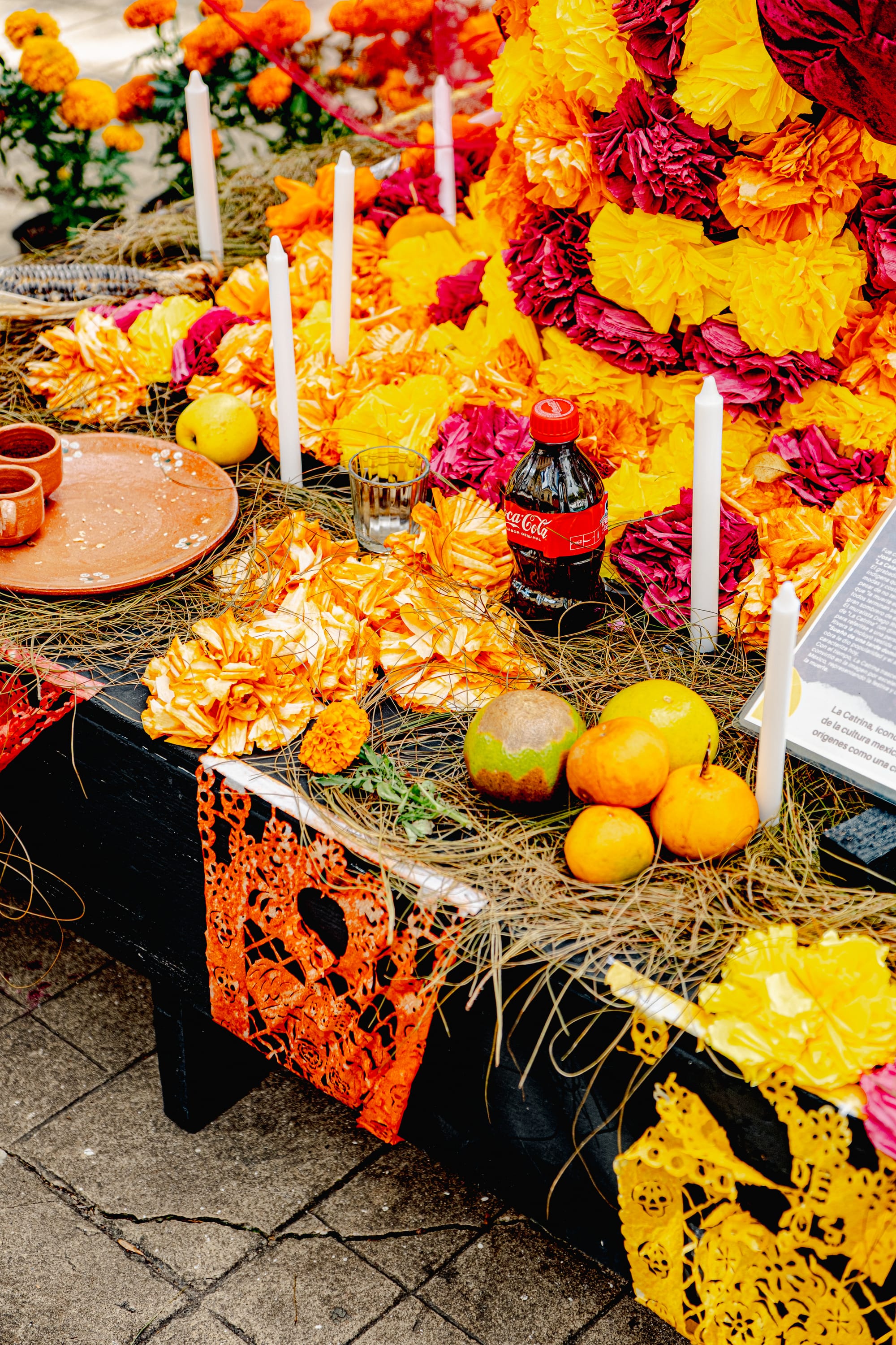 A public ofrenda layered with art, offerings, and marigolds