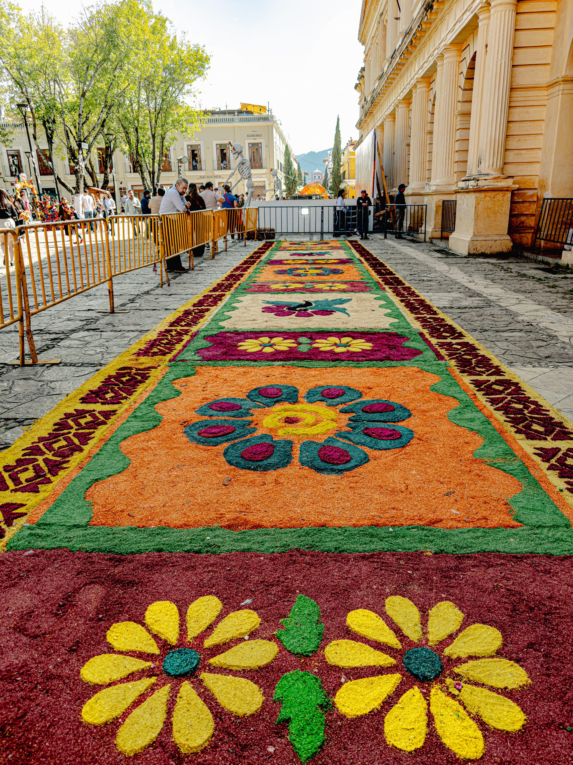 A floral carpet and playful skeletons in the plaza