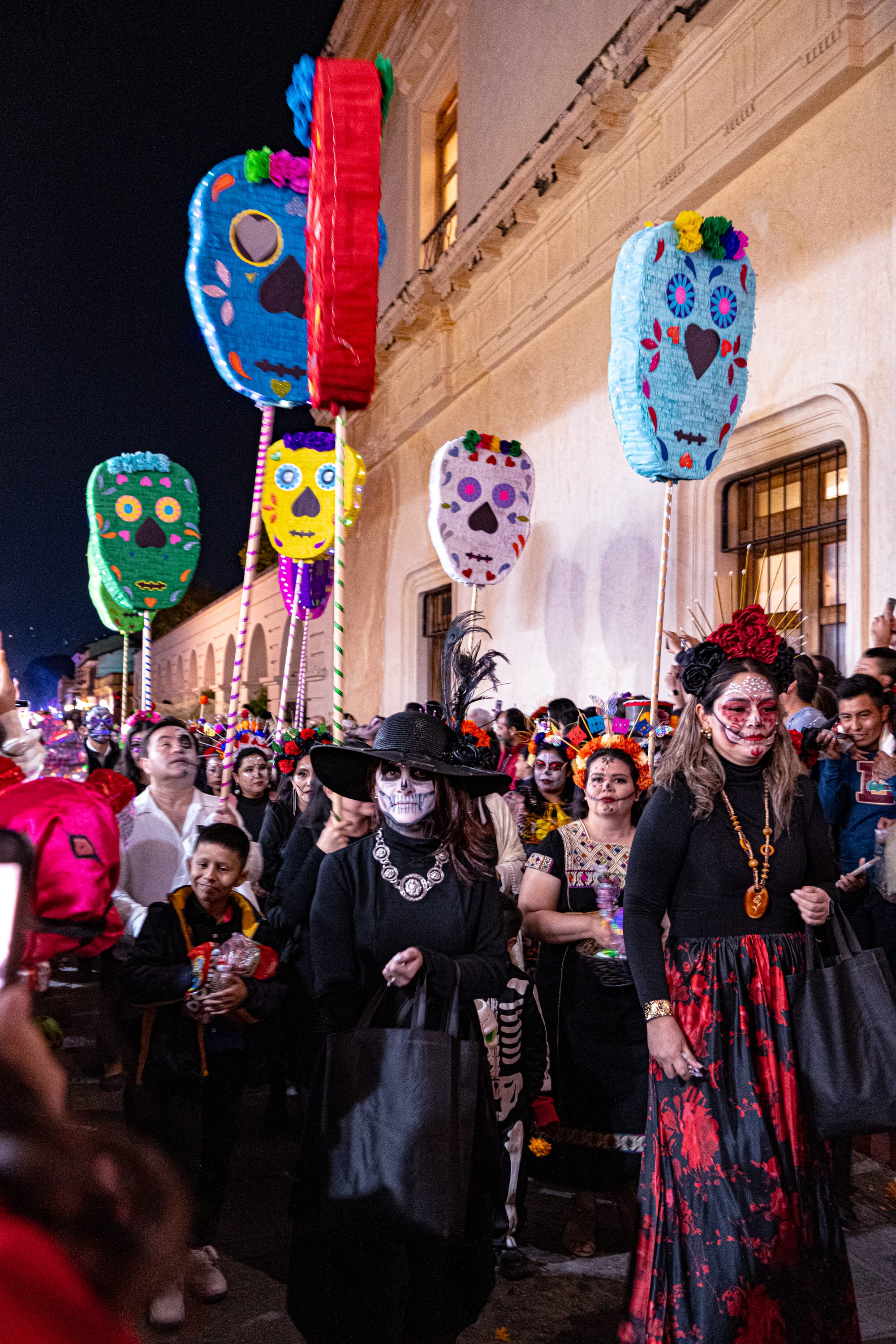 The Day of the Dead parade unfolded through the city as a vibrant, communal expression of remembrance. People gathered along streets and sidewalks. Children, elders, families, and friends. Many dressed up. Many painted their faces—calaveras, Catrinas, and skulls adorned with flowers and symbols.