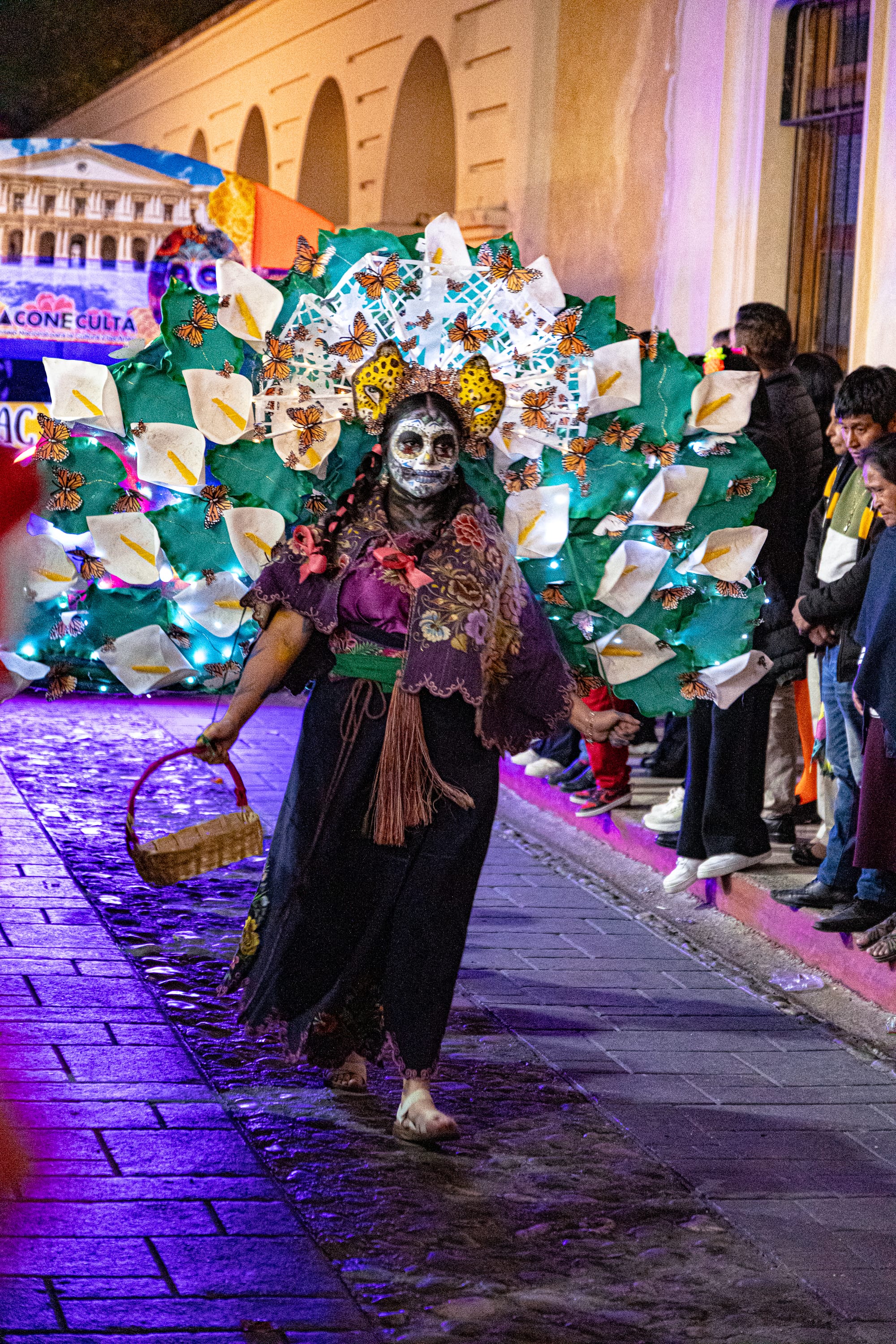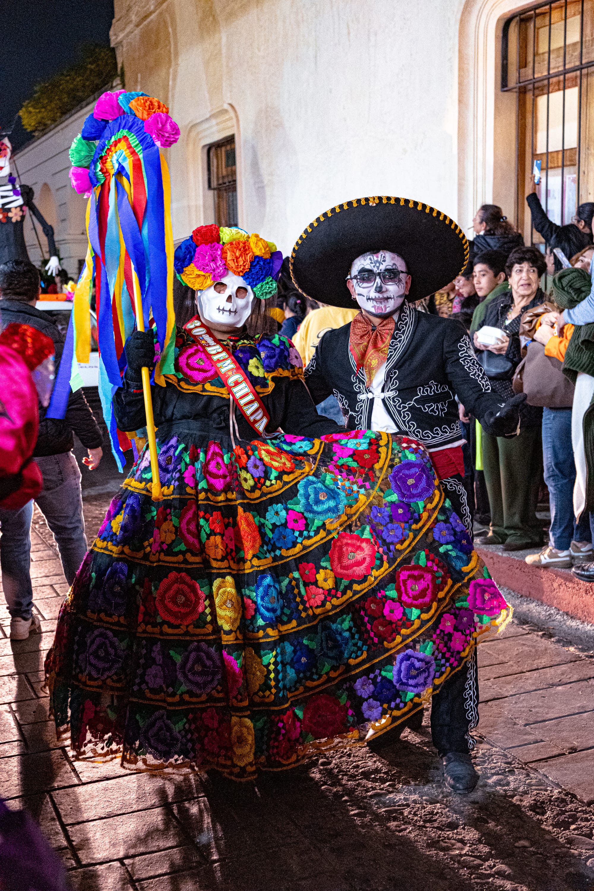 Elaborate costumes moving through the Día de Muertos parade