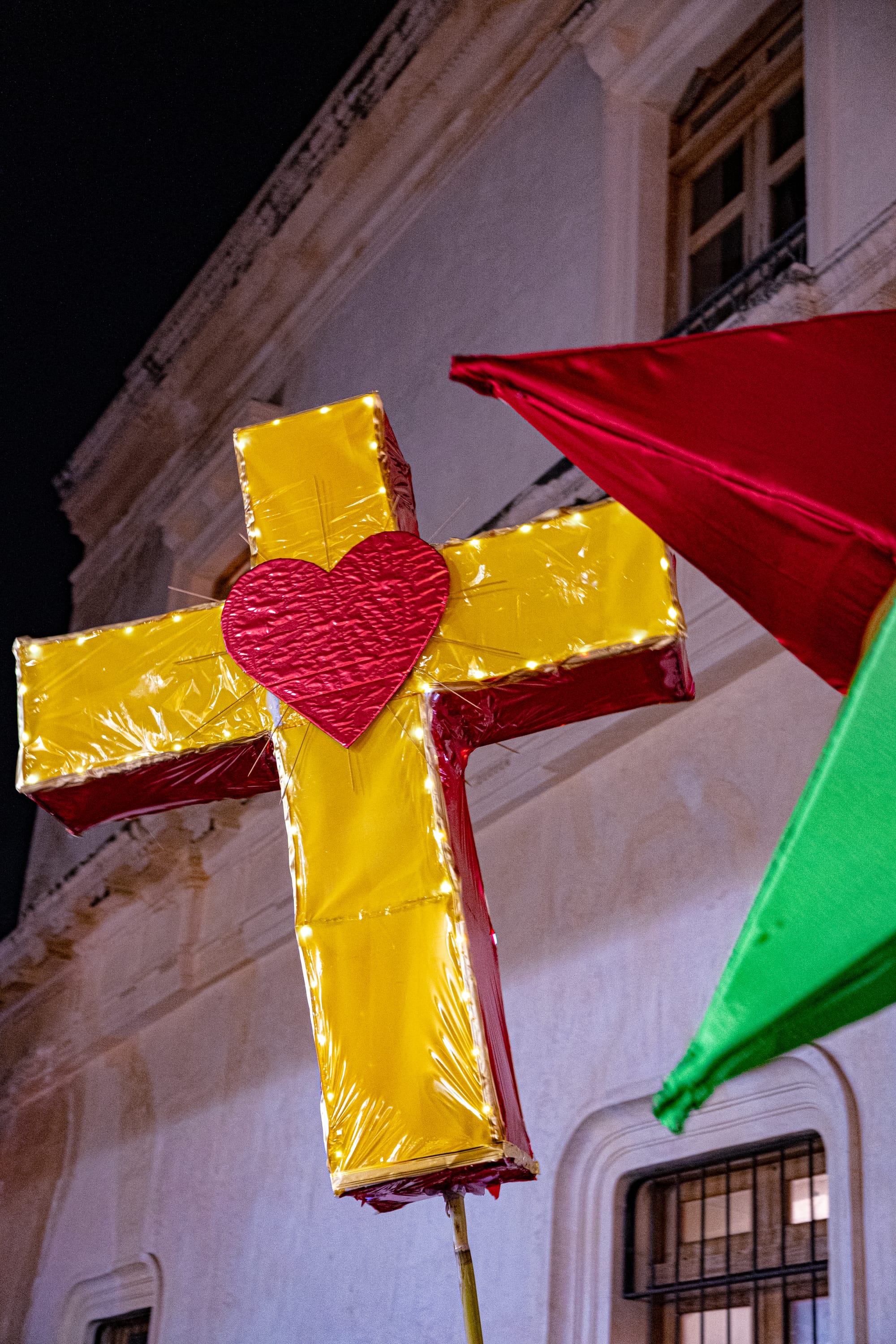 A moving altar carried through the streets at night