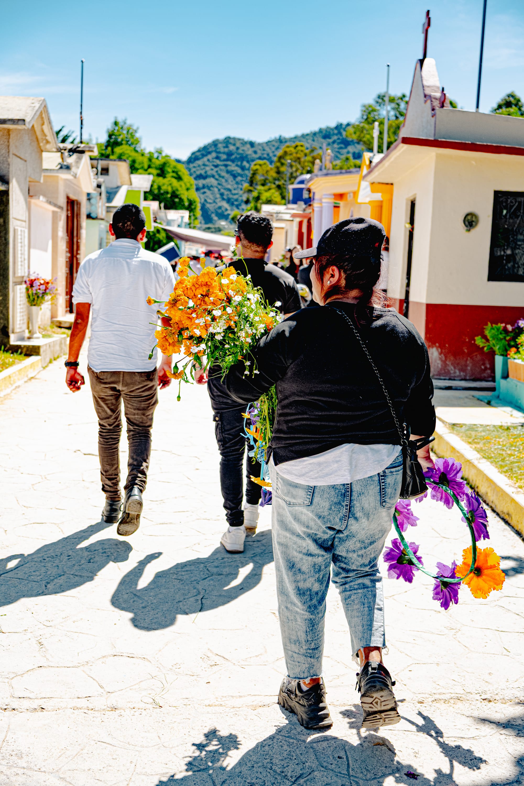 Carrying flowers through the cemetery pathways