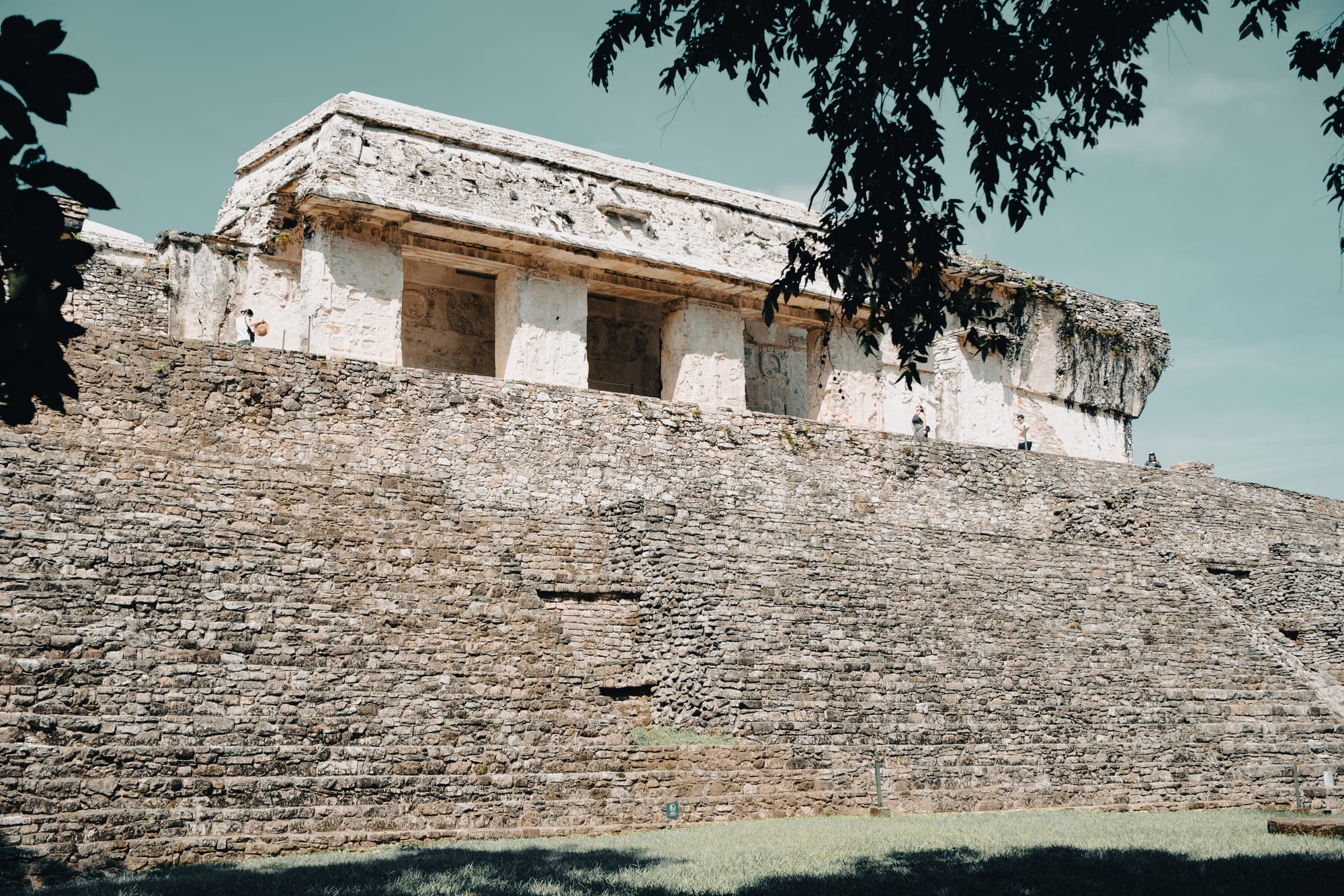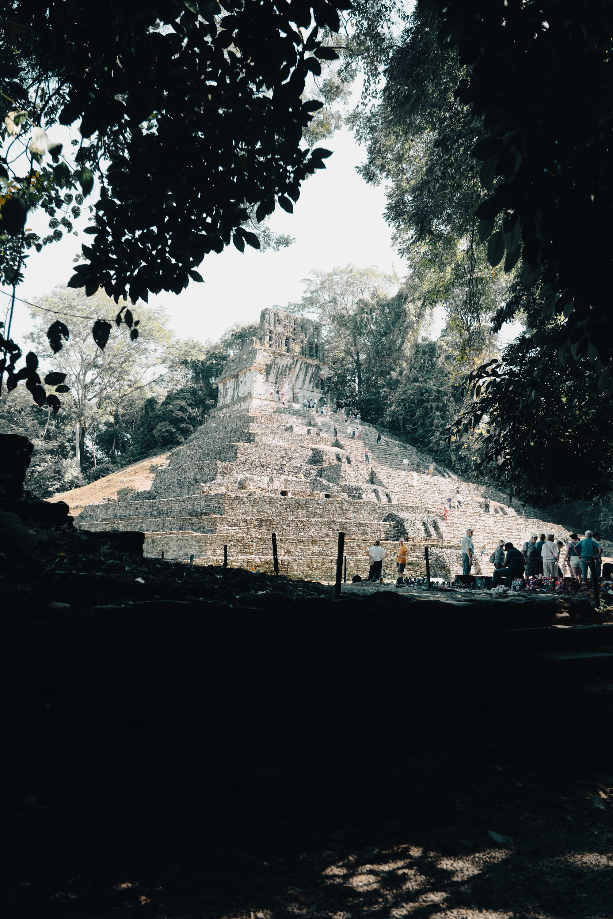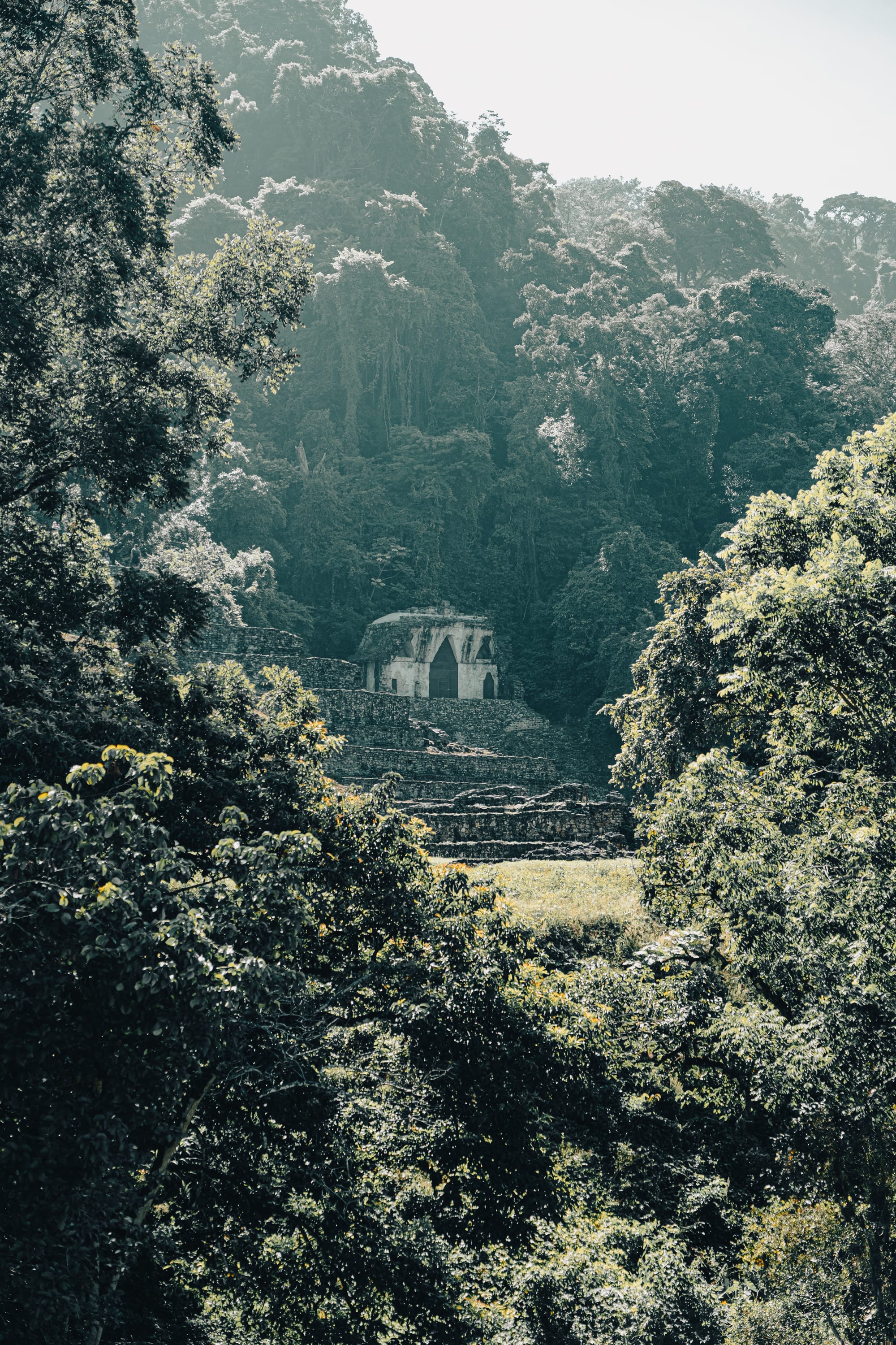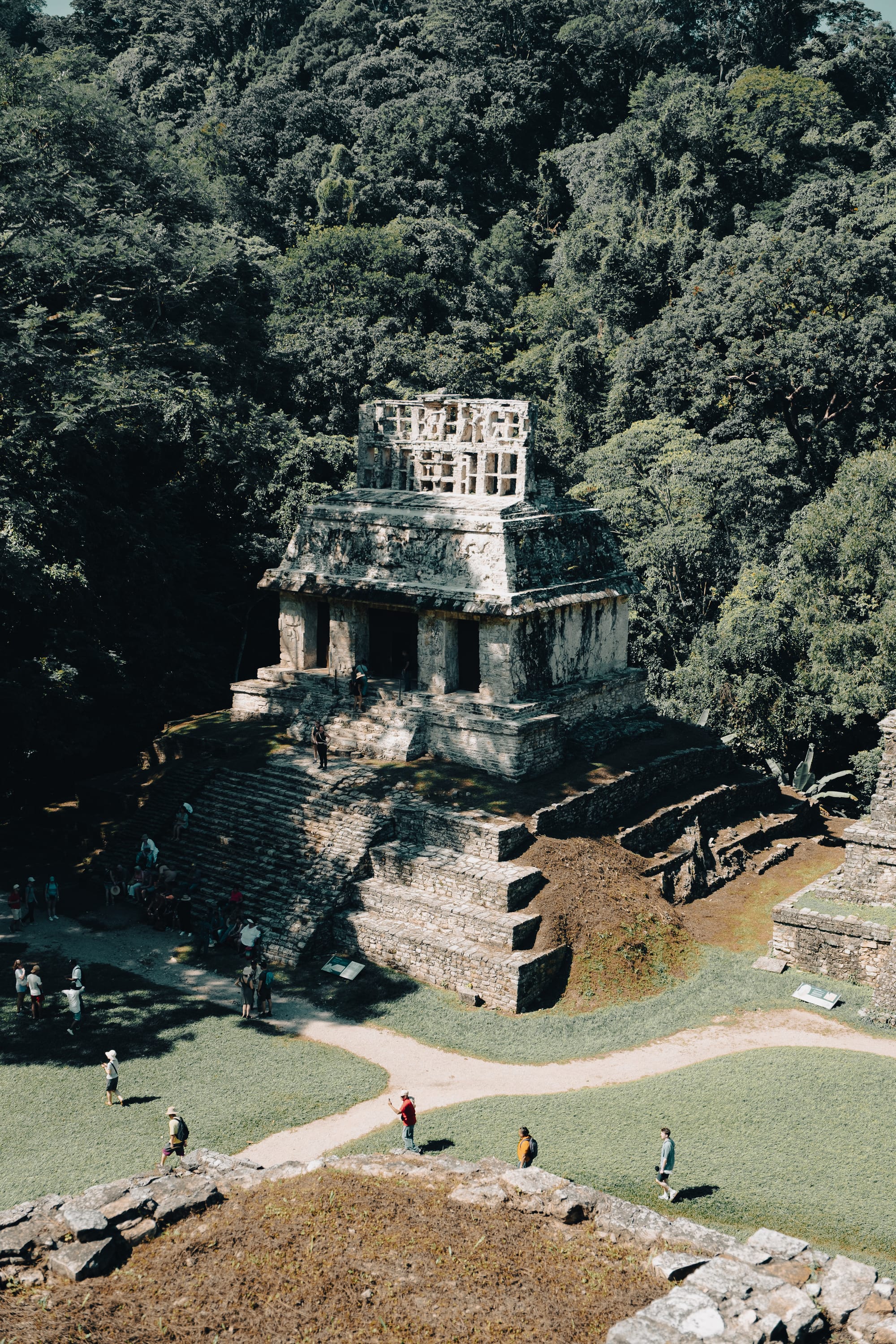 The Temple of the Inscriptions rises slowly into view rather than announcing itself all at once. Its stepped pyramid form is clean and geometric, but softened by time and vegetation.