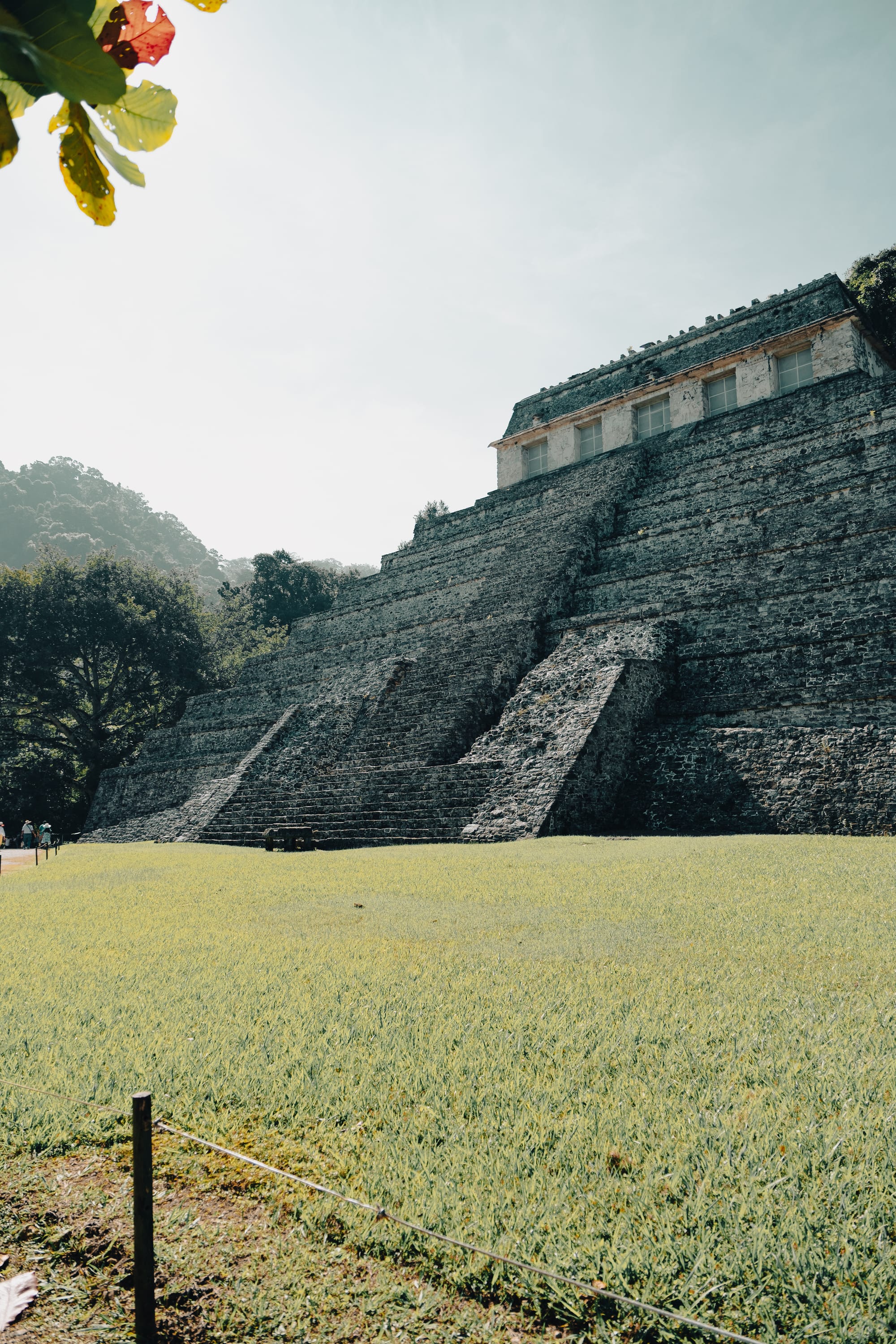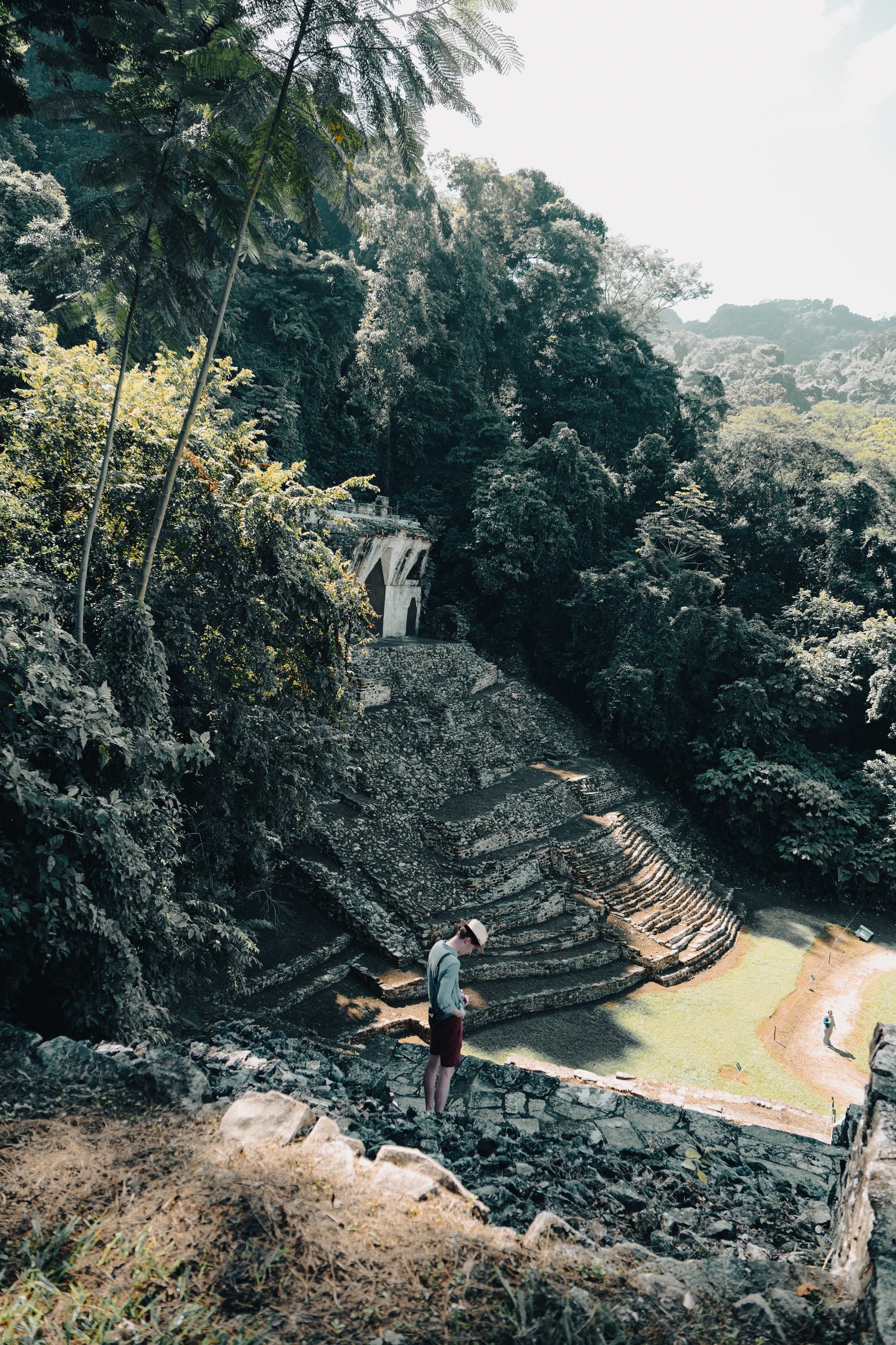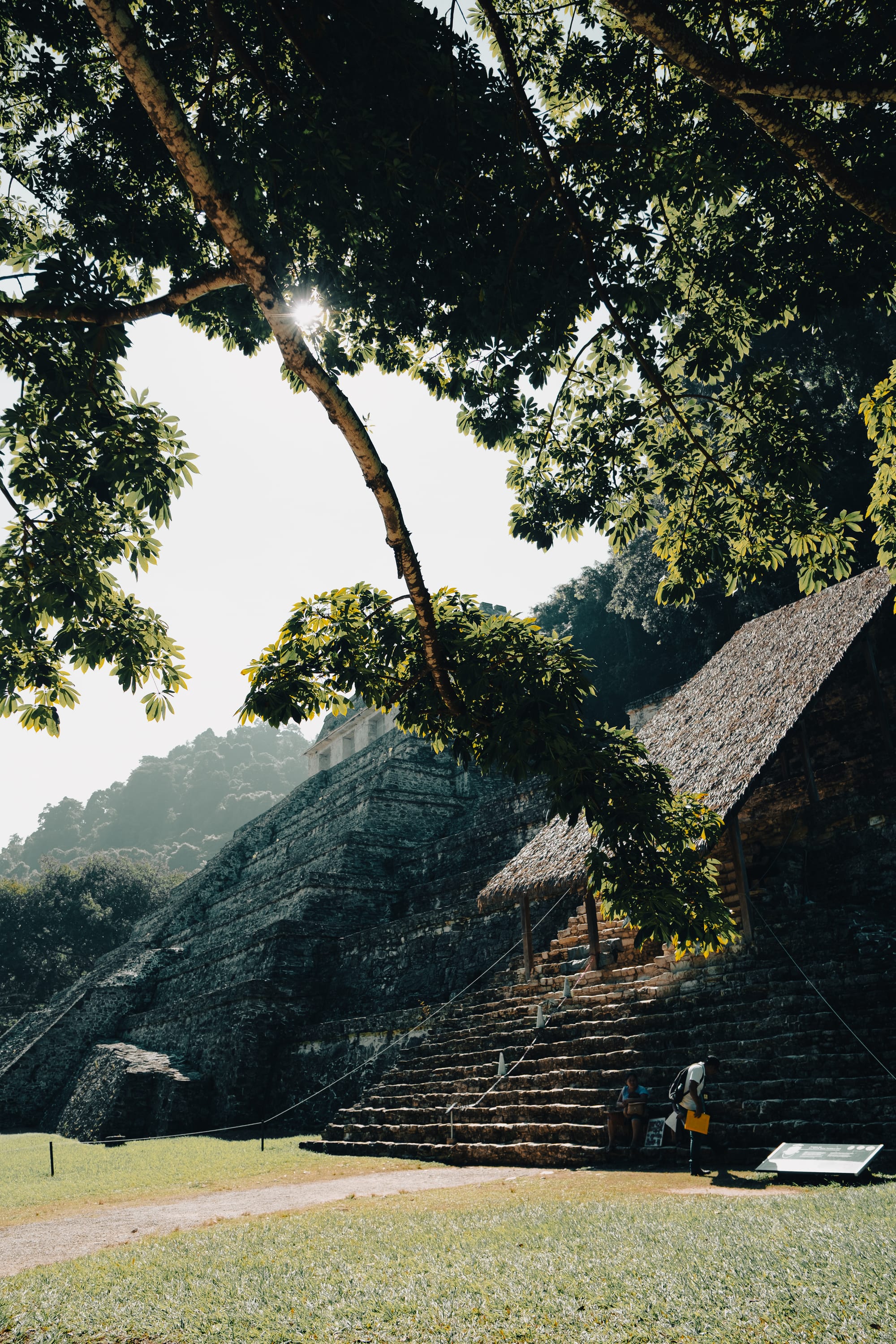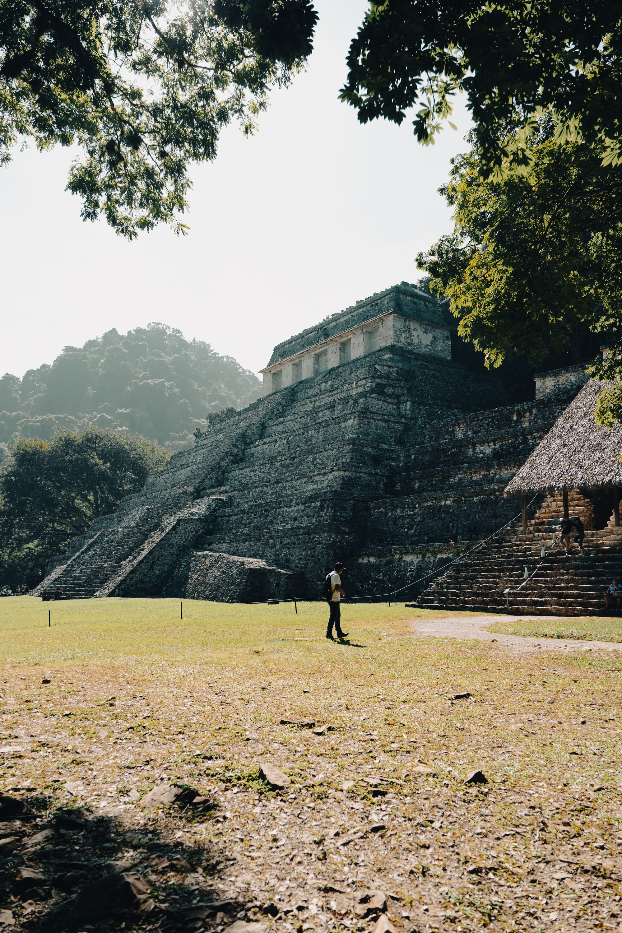 The Temple of the Inscriptions rises slowly into view rather than announcing itself all at once. Its stepped pyramid form is clean and geometric, but softened by time and vegetation.