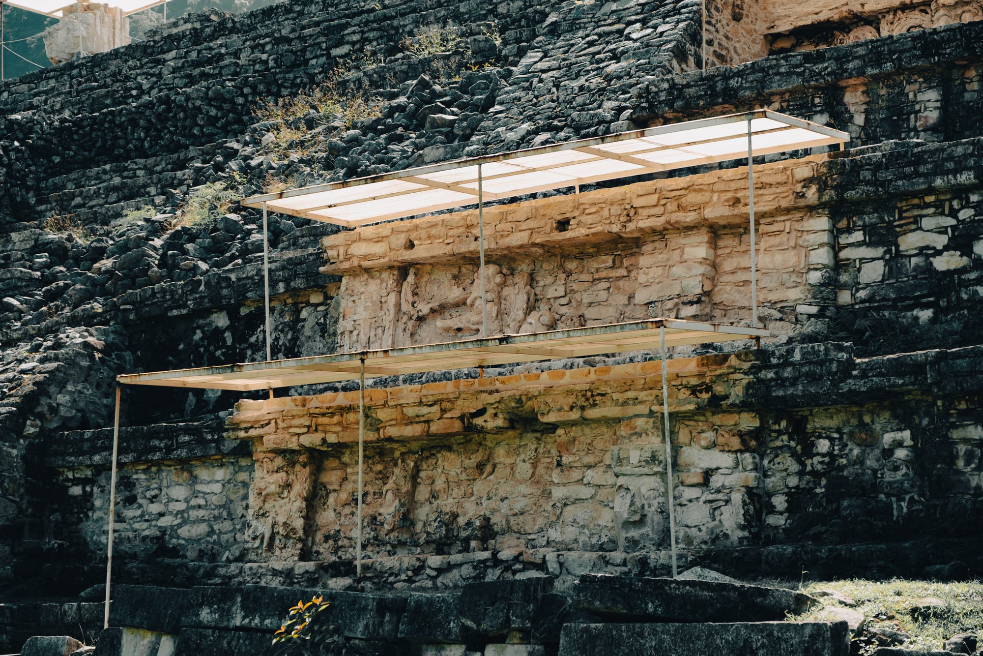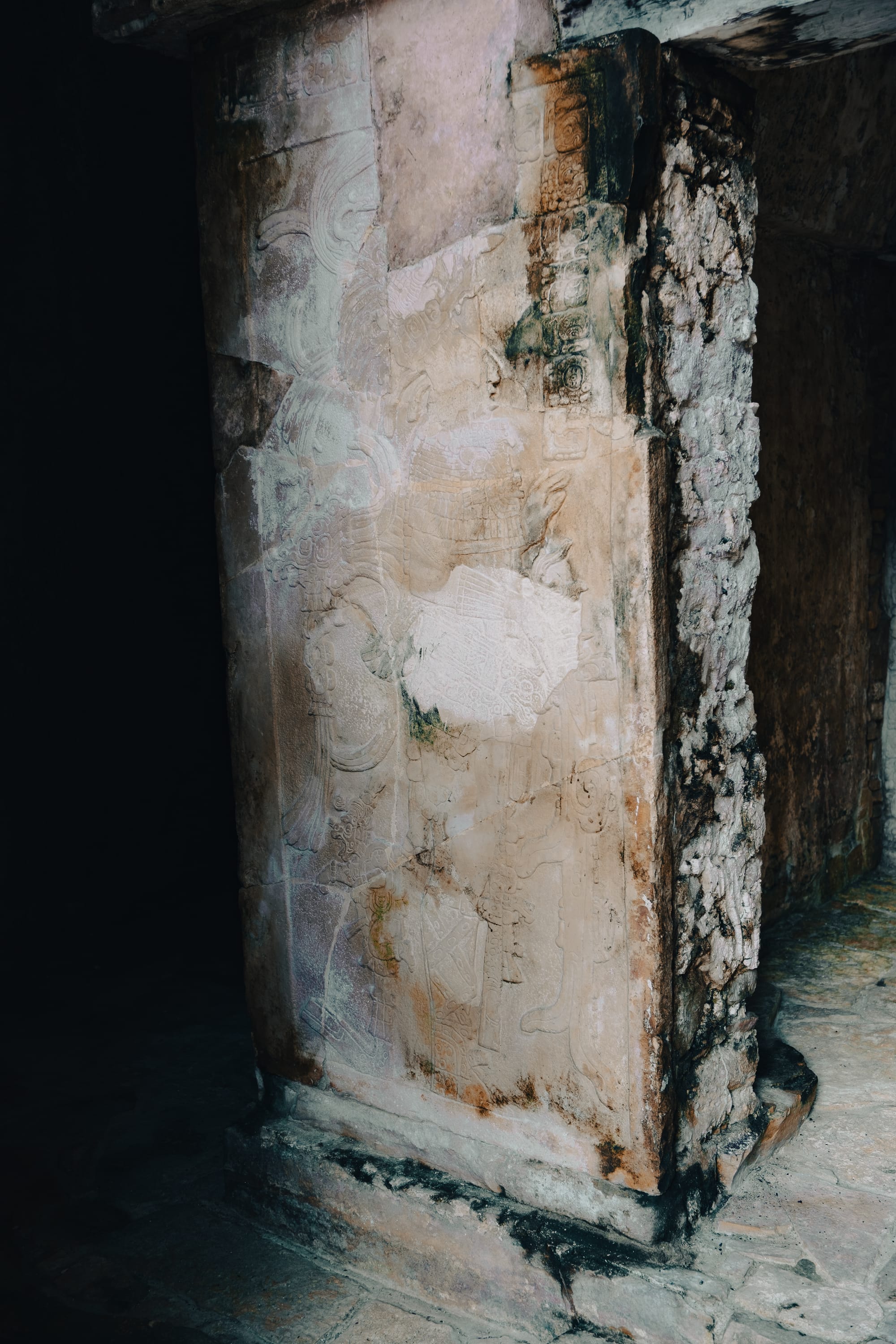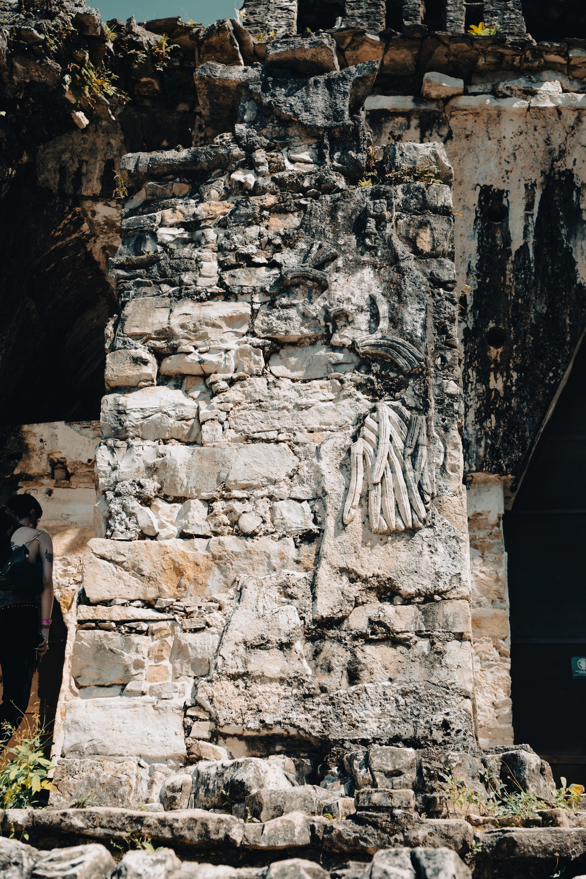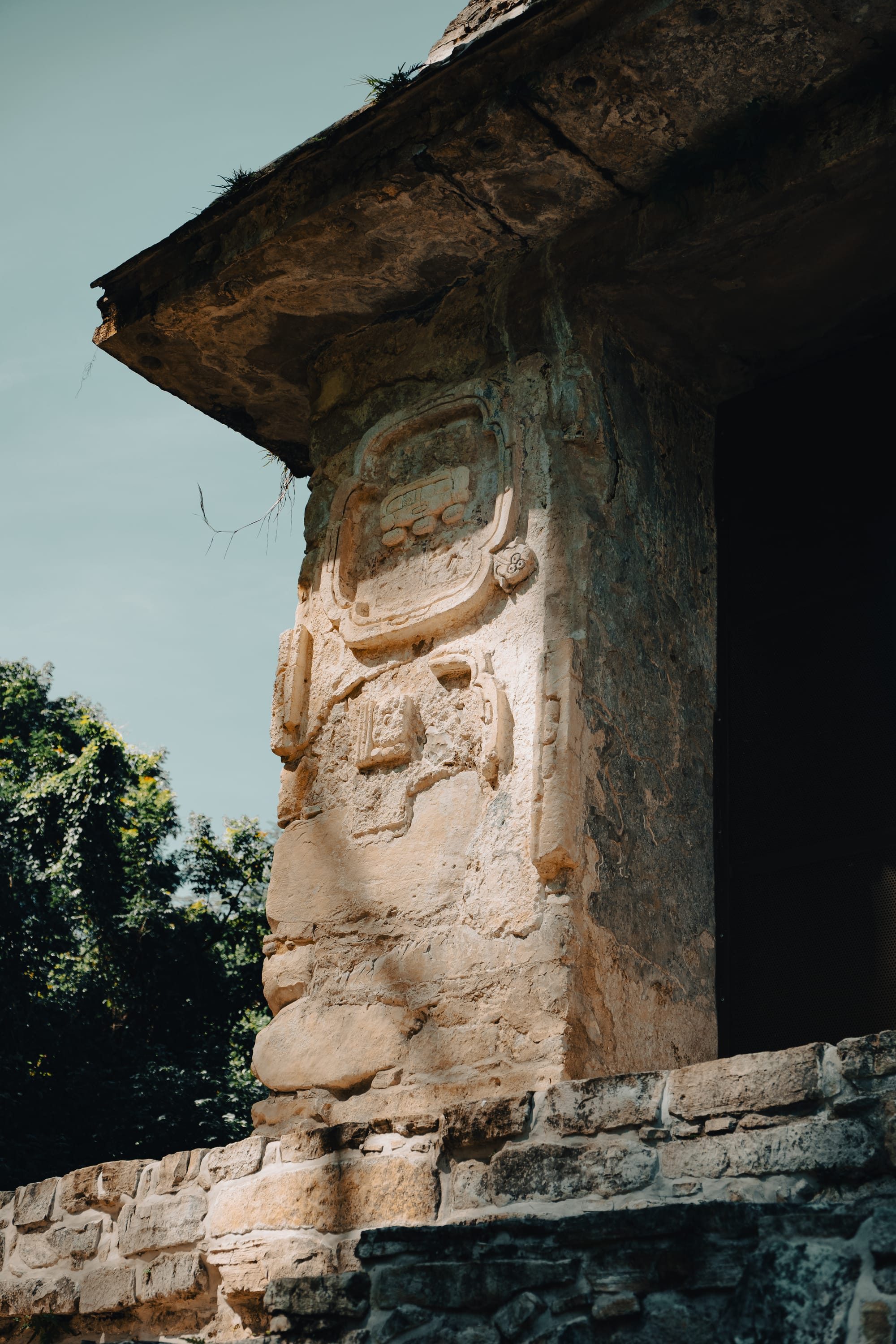 One of the most striking things about exploring Palenque independently is how often your attention is pulled downward rather than upward. Stone carvings, worn stair edges, fragments of reliefs embedded in walls—details reveal themselves slowly. Some glyphs are sharp and legible; others are eroded to near abstraction.