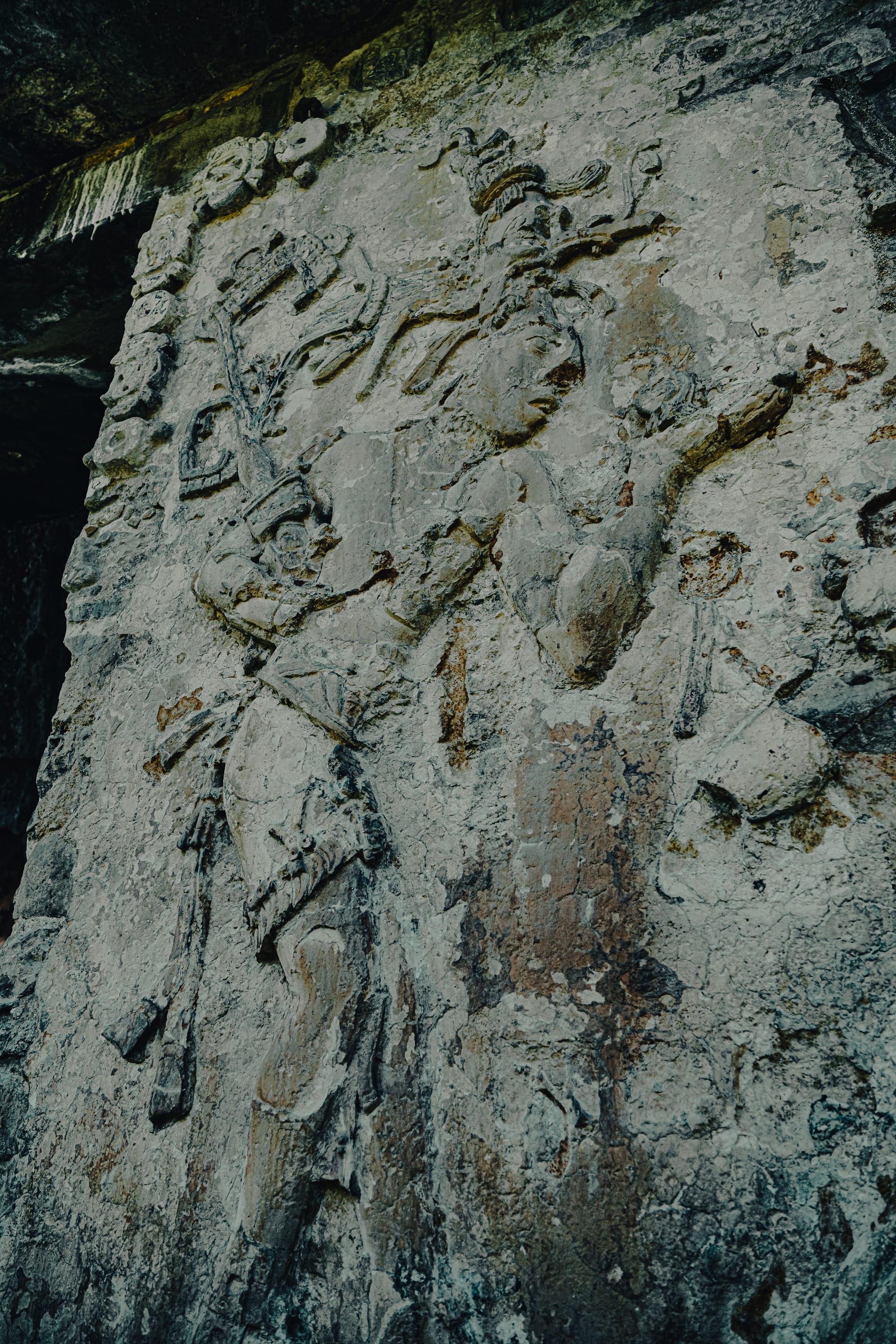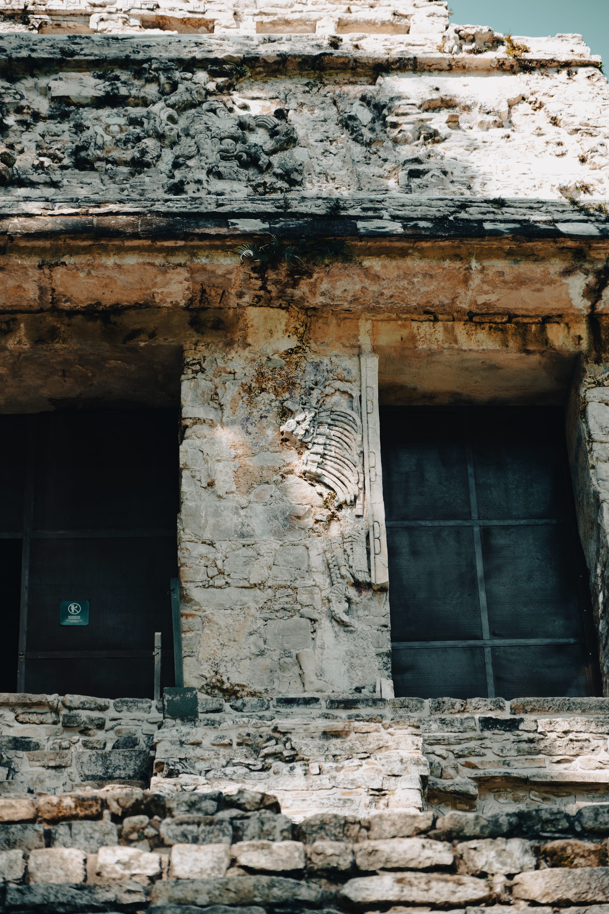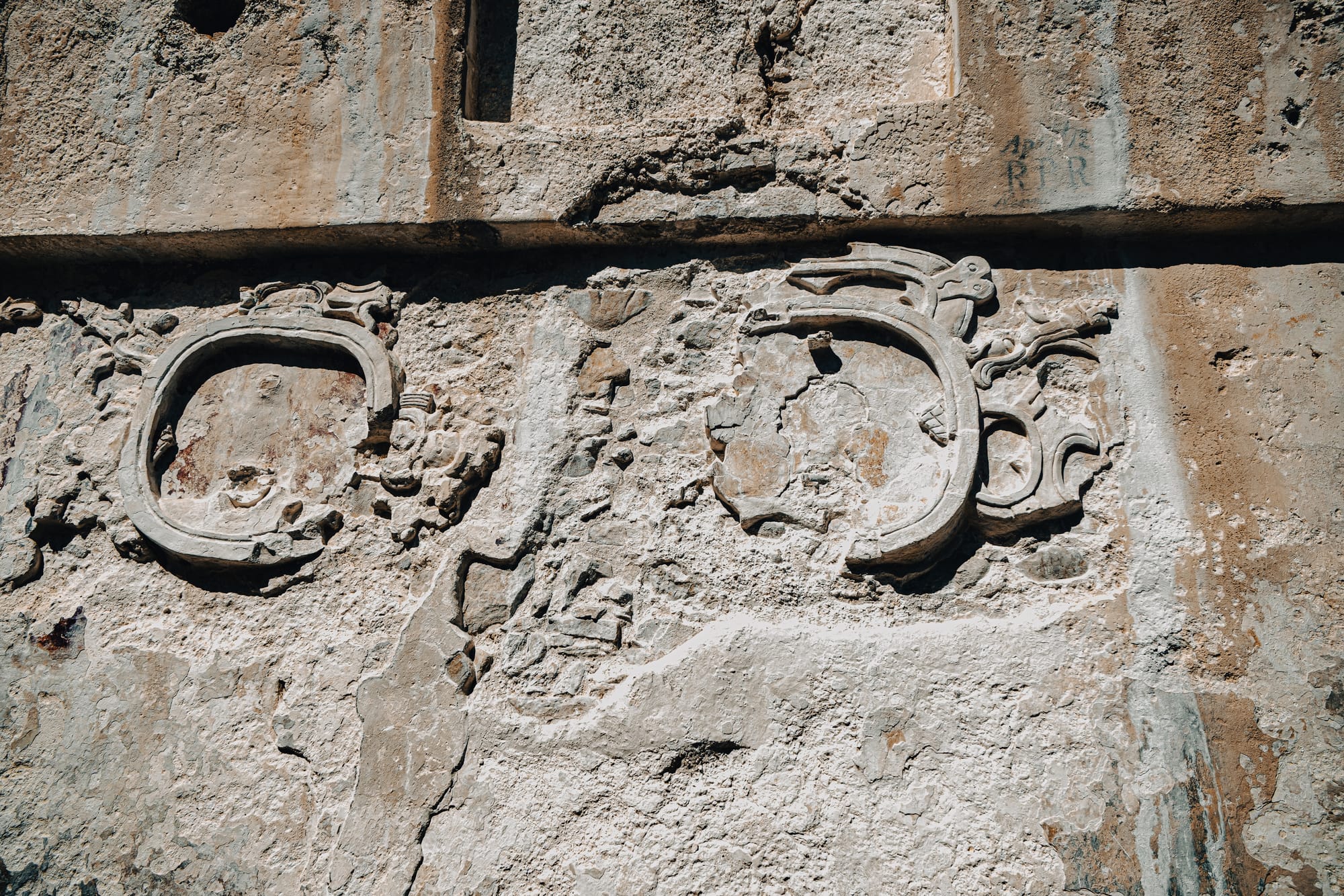 One of the most striking things about exploring Palenque independently is how often your attention is pulled downward rather than upward. Stone carvings, worn stair edges, fragments of reliefs embedded in walls—details reveal themselves slowly. Some glyphs are sharp and legible; others are eroded to near abstraction.
