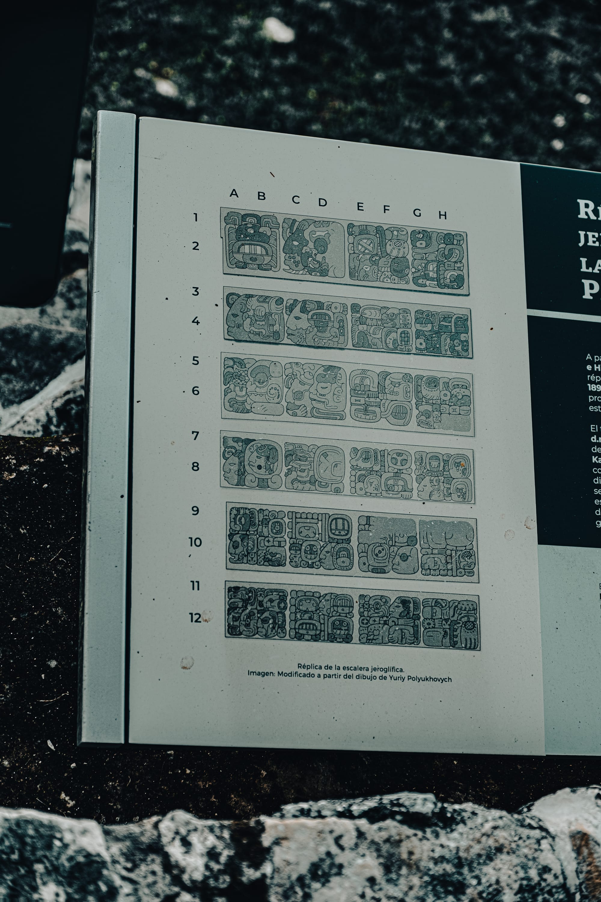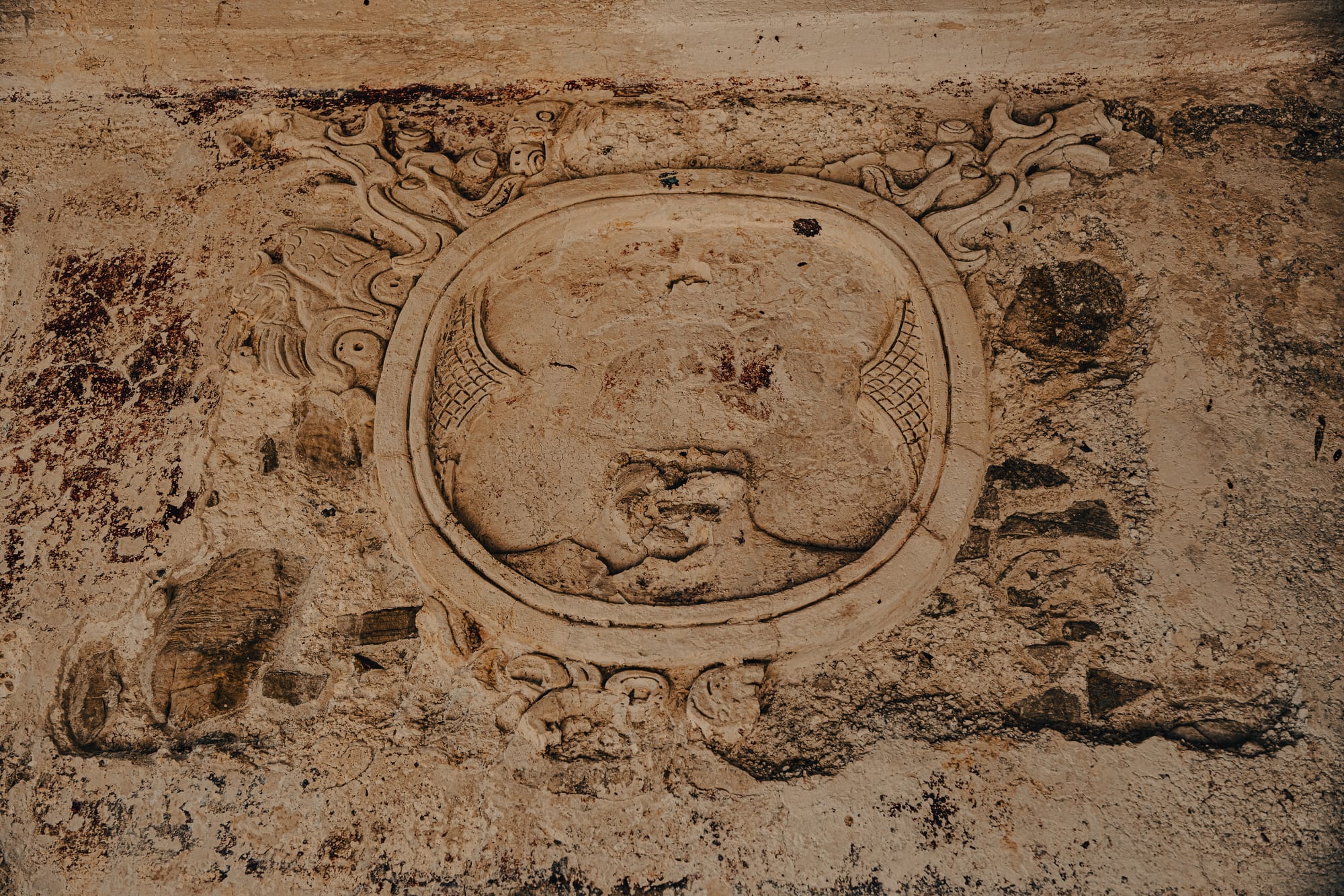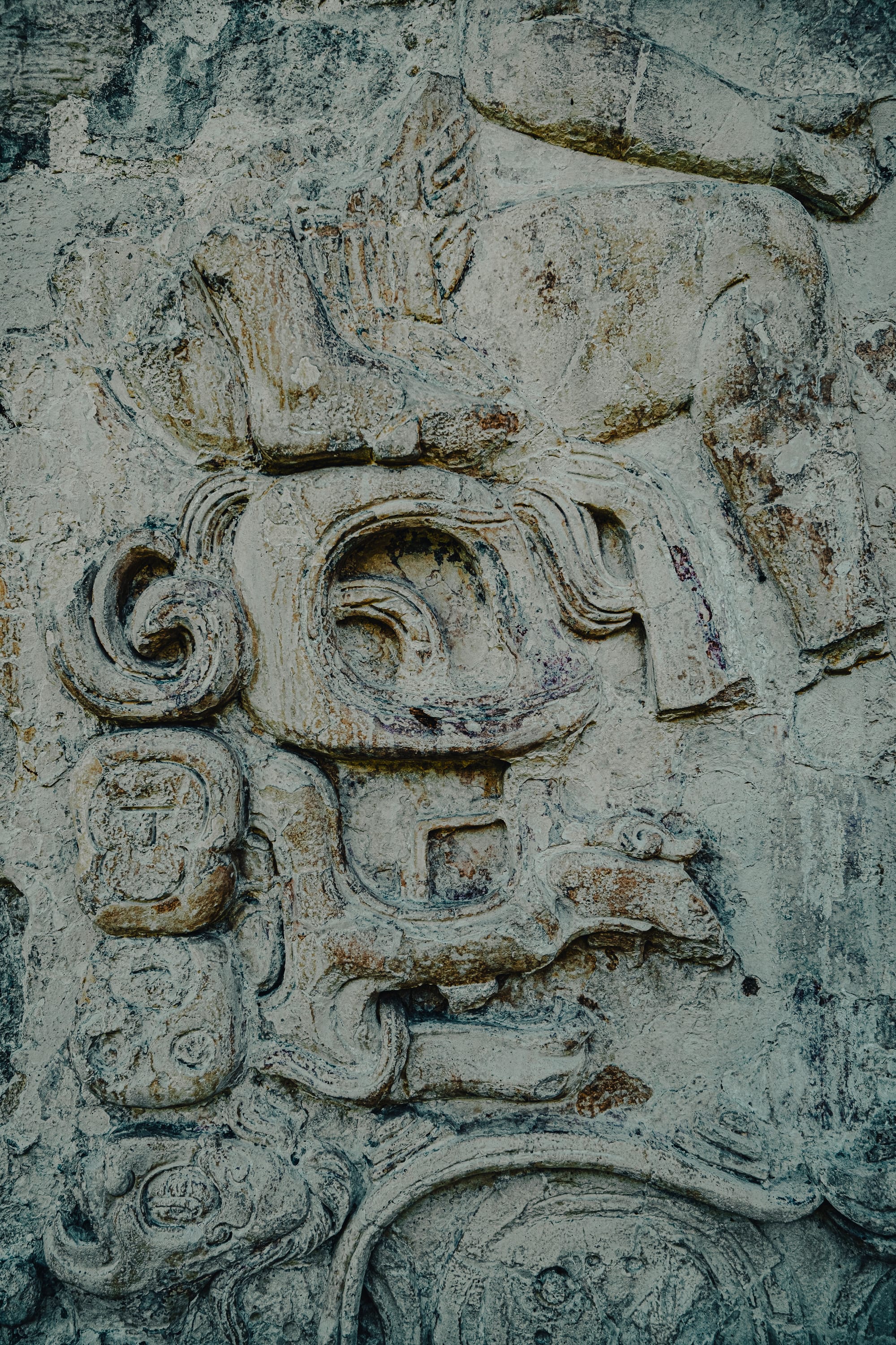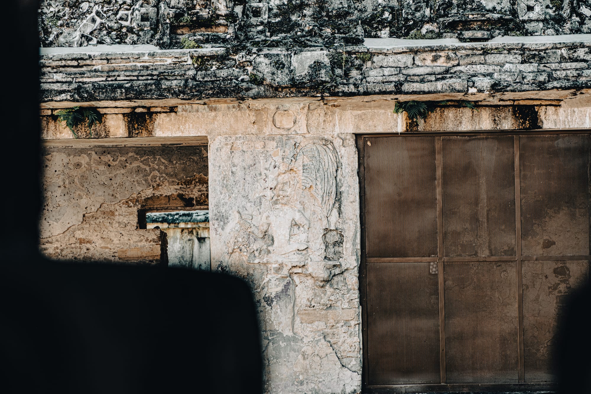 One of the most striking things about exploring Palenque independently is how often your attention is pulled downward rather than upward. Stone carvings, worn stair edges, fragments of reliefs embedded in walls—details reveal themselves slowly. Some glyphs are sharp and legible; others are eroded to near abstraction.