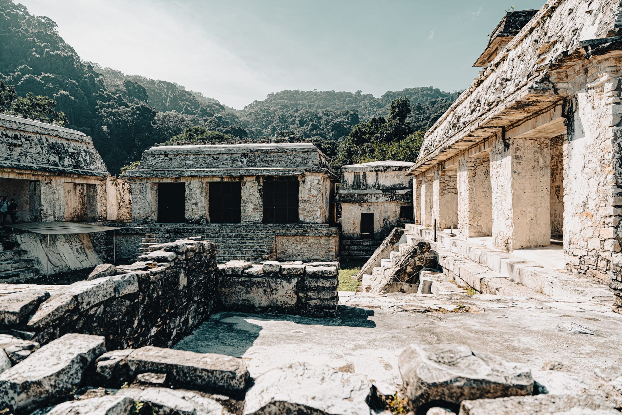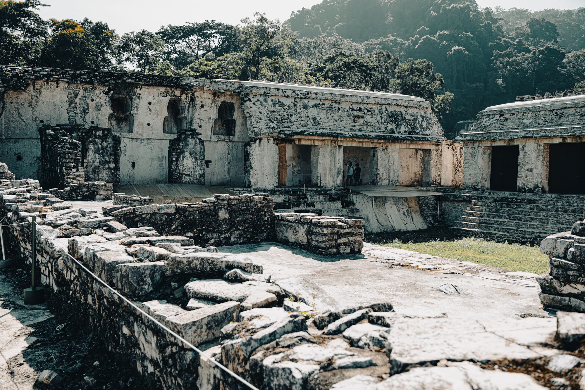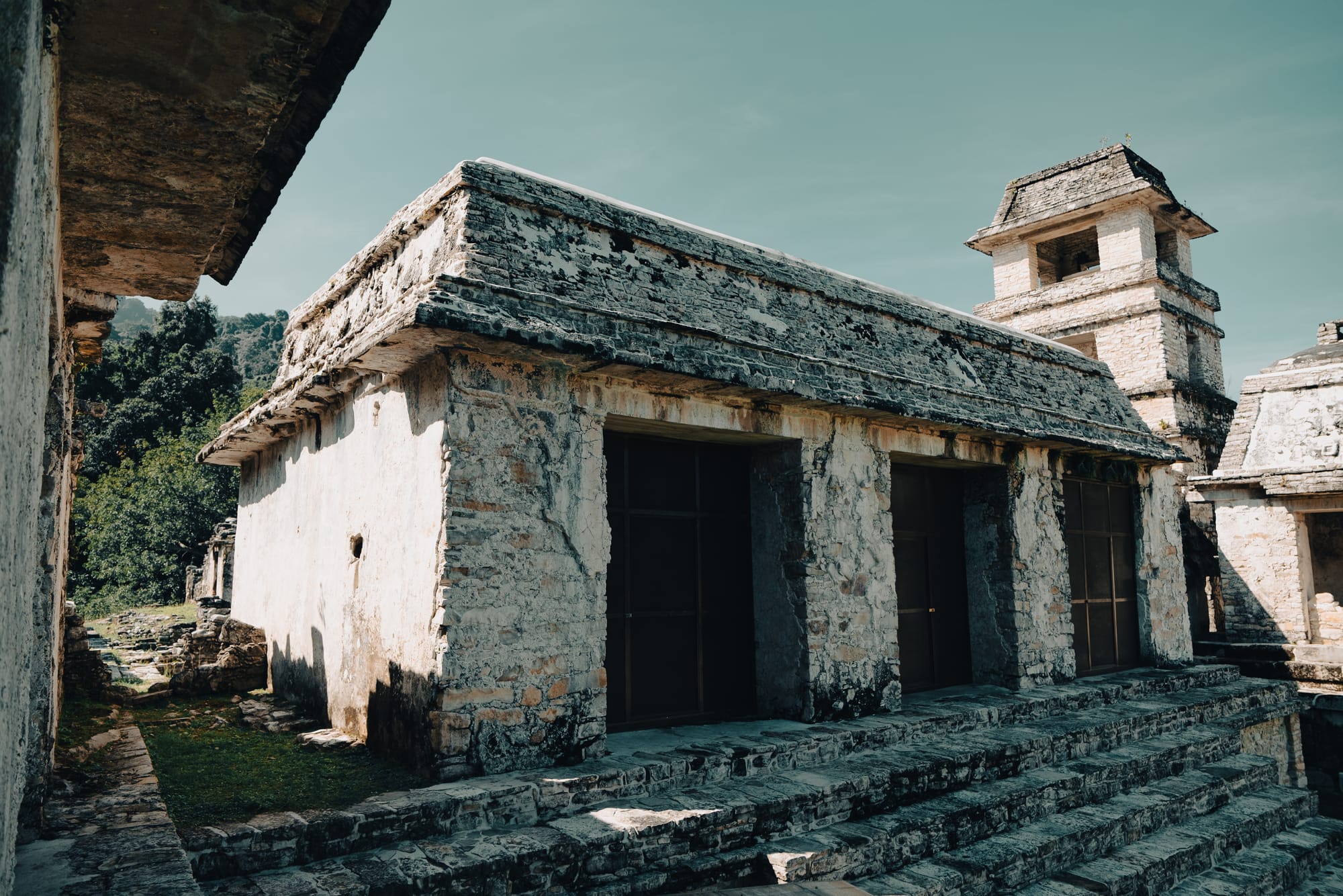 Walking farther into the site, the jungle becomes more present. Trees arch over secondary temples. Light breaks unevenly through leaves, creating sharp contrasts between sunlit limestone and deep shadow. At times, it feels as though the ruins are emerging from the forest rather than the other way around. This is one of the defining characteristics of the Palenque Mayan ruins—they are not isolated from their environment, but actively entangled with it.