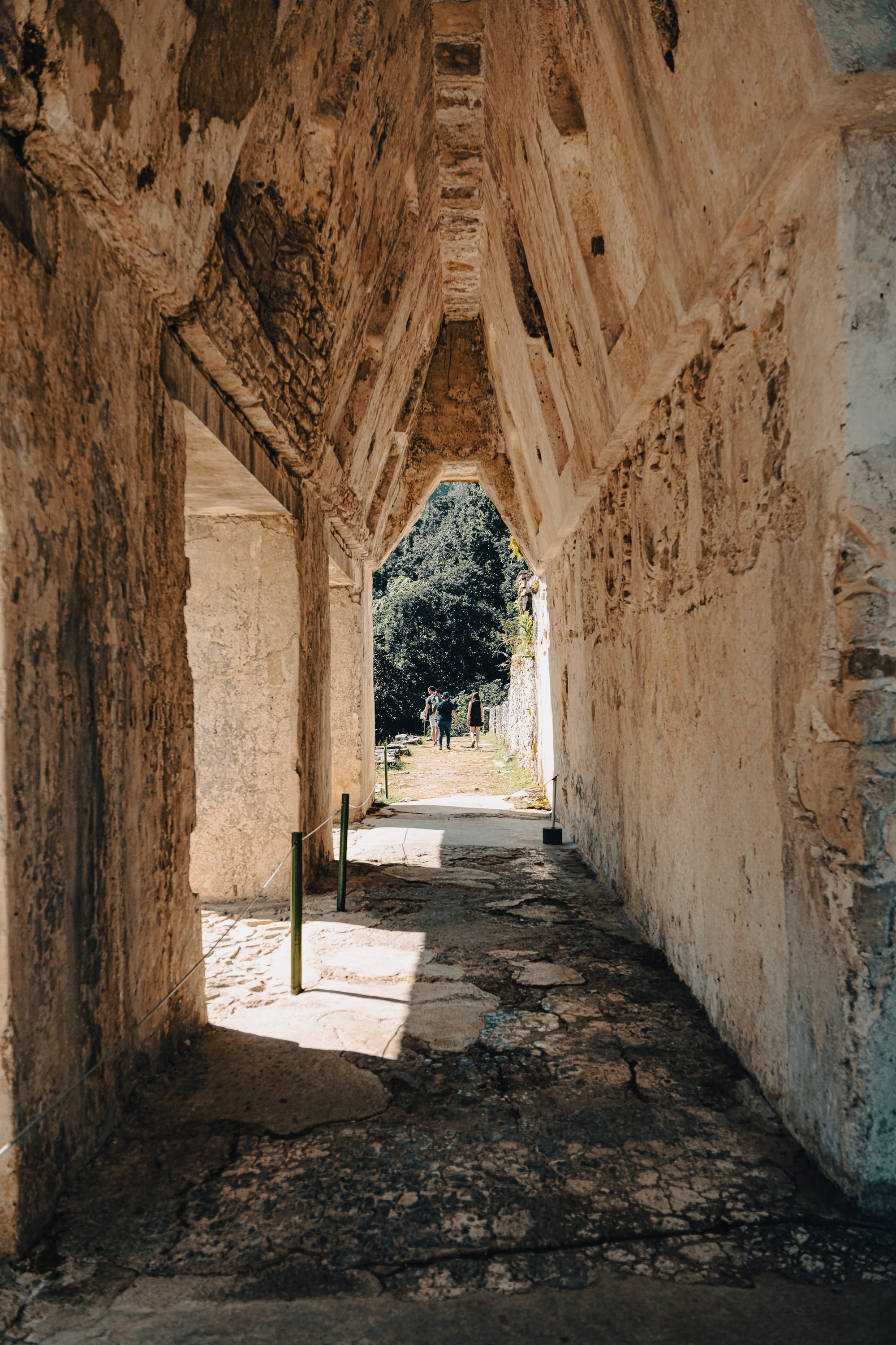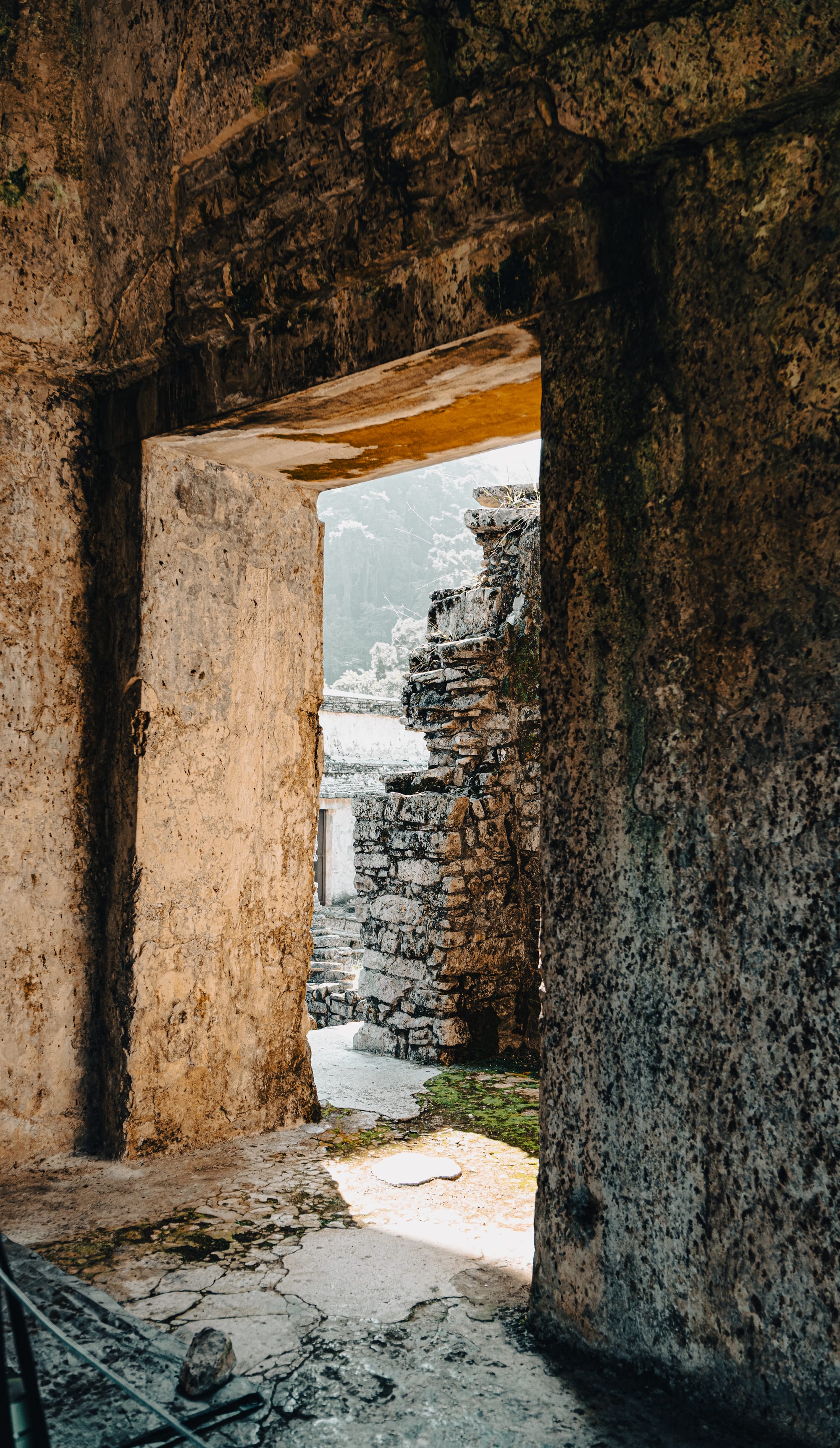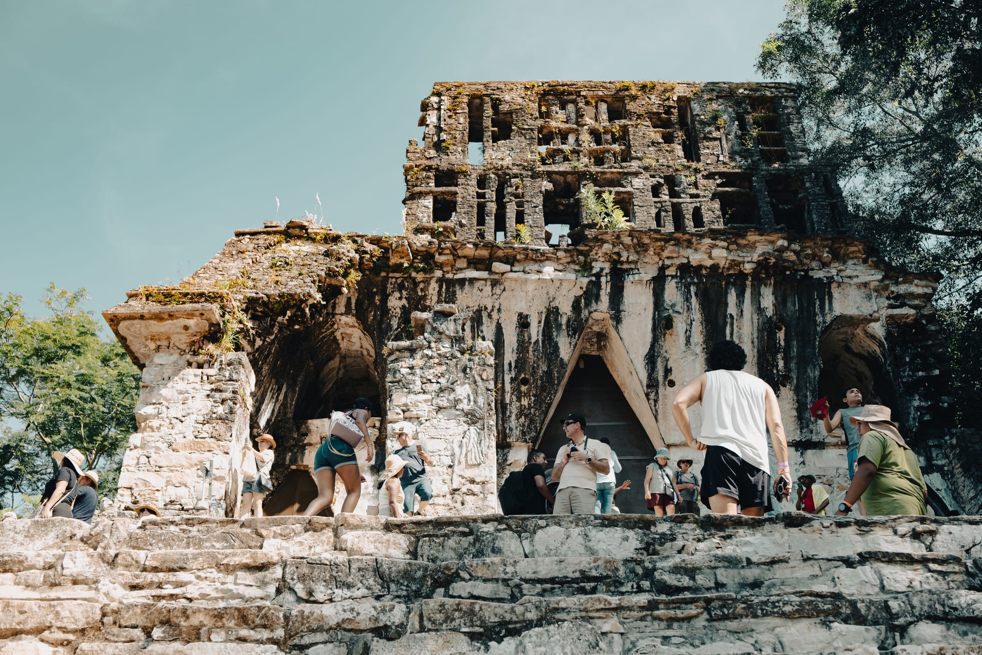 Walking farther into the site, the jungle becomes more present. Trees arch over secondary temples. Light breaks unevenly through leaves, creating sharp contrasts between sunlit limestone and deep shadow. At times, it feels as though the ruins are emerging from the forest rather than the other way around. This is one of the defining characteristics of the Palenque Mayan ruins—they are not isolated from their environment, but actively entangled with it.